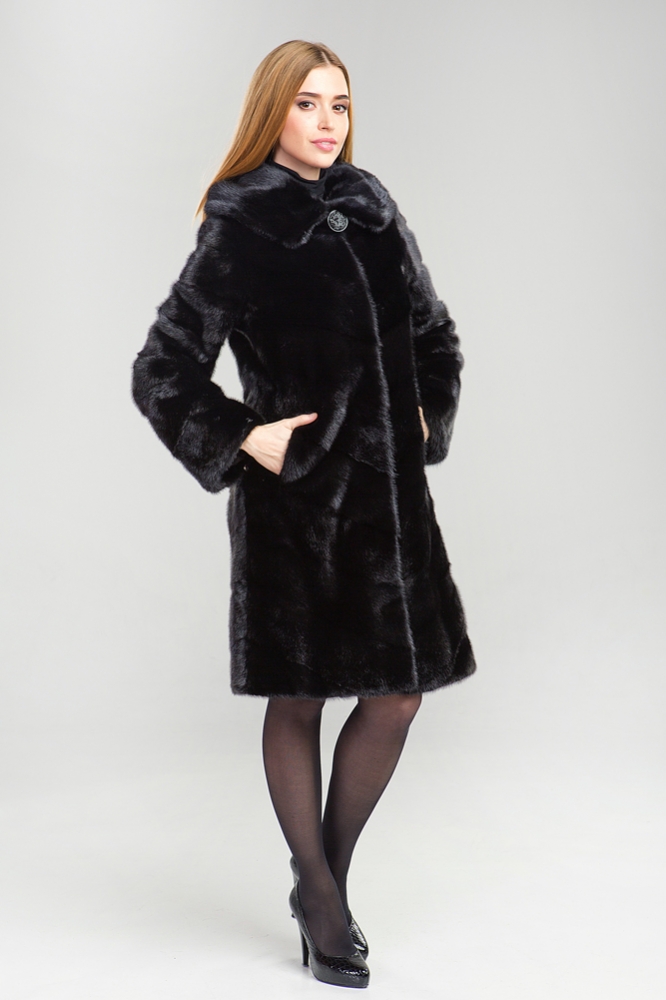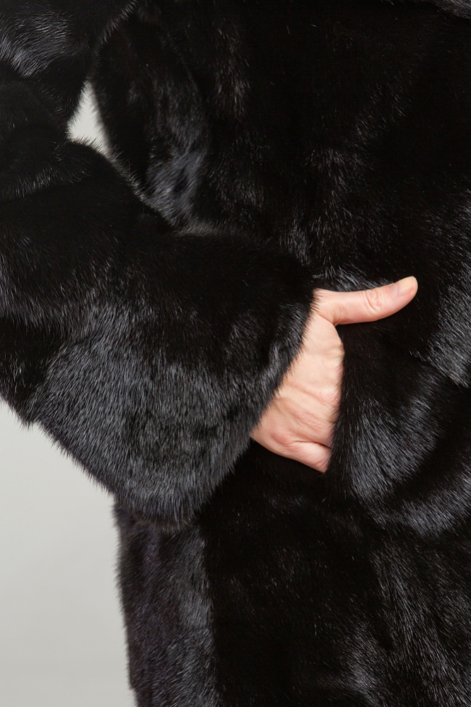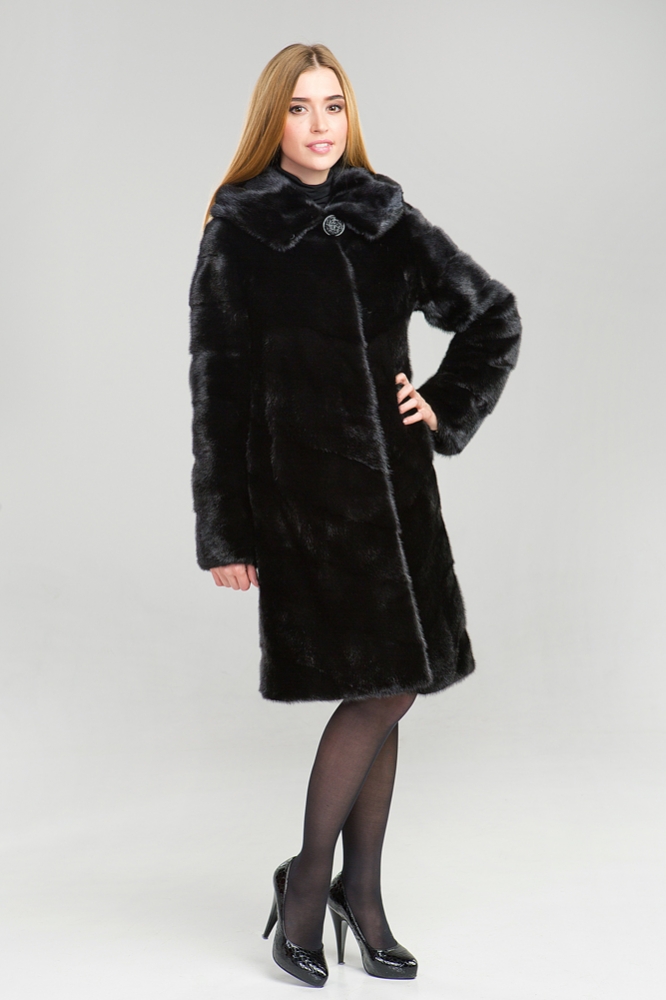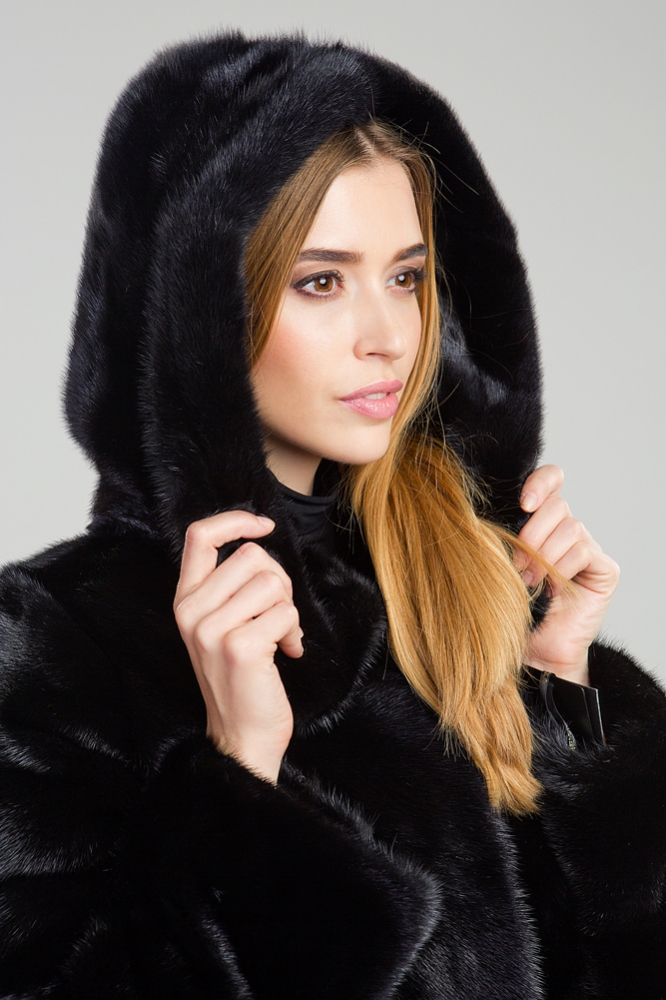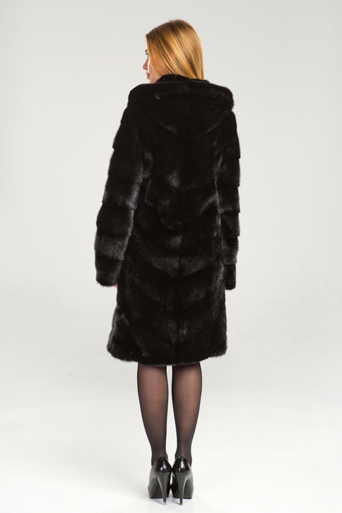 Полупальто из меха норки с капюшоном. Модель выполнена в оригинальном крое с диагональной выкладкой пластин. Для удобства ношения предусмотрены утяжки на рукавах, талии и по низу изделия. При необходимости, рукава шубки можно укоротить. Длина изделия составляет 100 см.