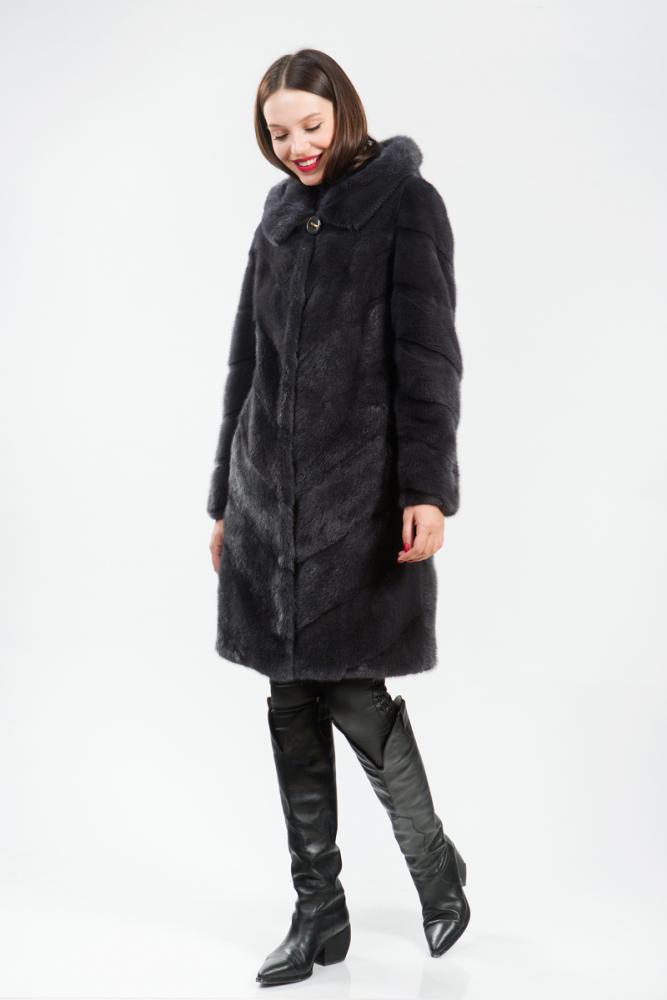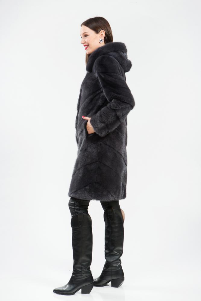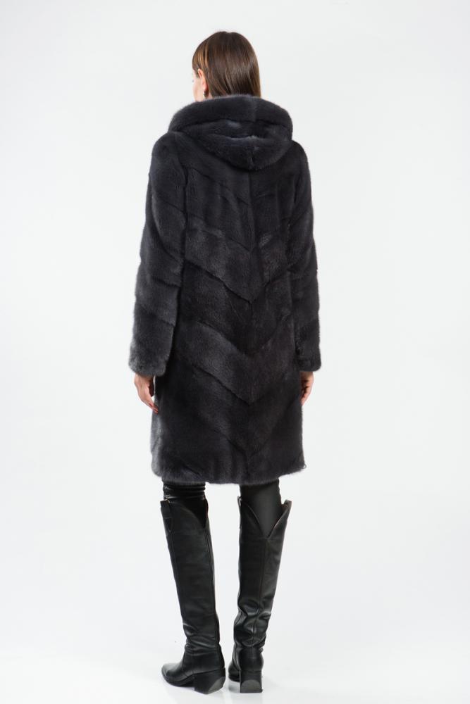 Полупальто из норкового меха с капюшоном. Изделие выполнено в технике диагональной выкладки пластин. В конструкции предусмотрены регулирующие утяжки на талии, рукавах и по низу. Длина пальто составляет 100 сантиметров. Благодаря удачному лекалу, это норковое полупальто обеспечит максимальный комфорт, а благородный оттенок муссона придаст образу безупречную гармонию.