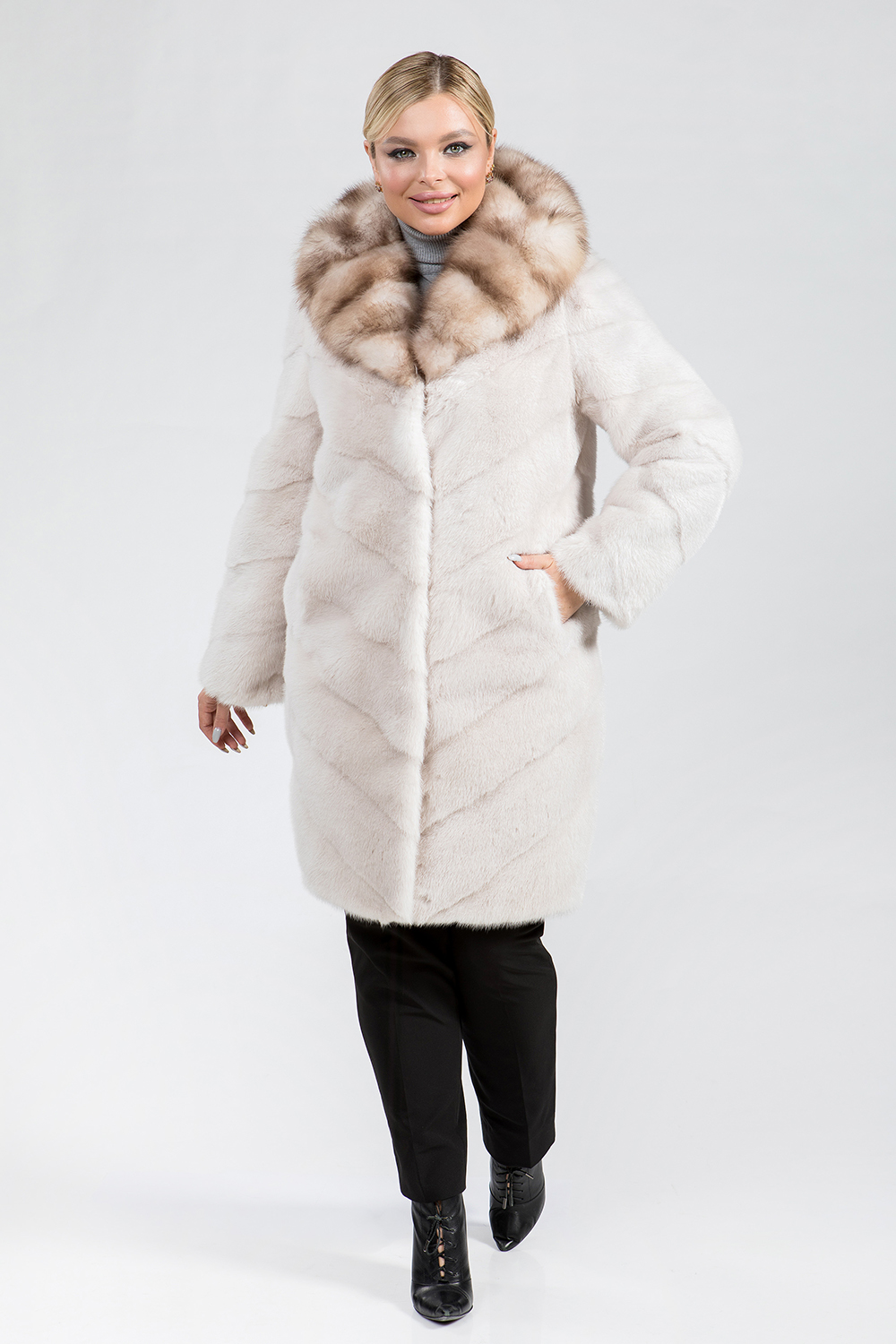 Полупальто из меха норки. Капюшон модели декорирован мехом куницы. Крой мехового пальто диагональная выкладка пластин. Длина изделия 100 см. Модель оснащена регулирующими утяжками на рукавах, на талии и по низу изделия. Шубка имеет универсальный фасон, подходит для любого типа фигуры. Украсьте свой зимний образ роскошной норковой шубкой и наслаждайтесь комфортом в морозную погоду!