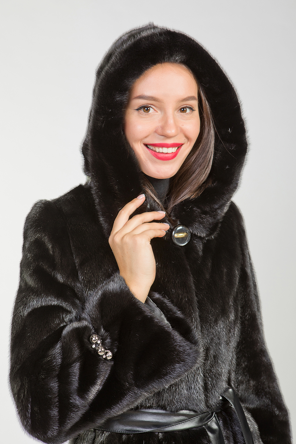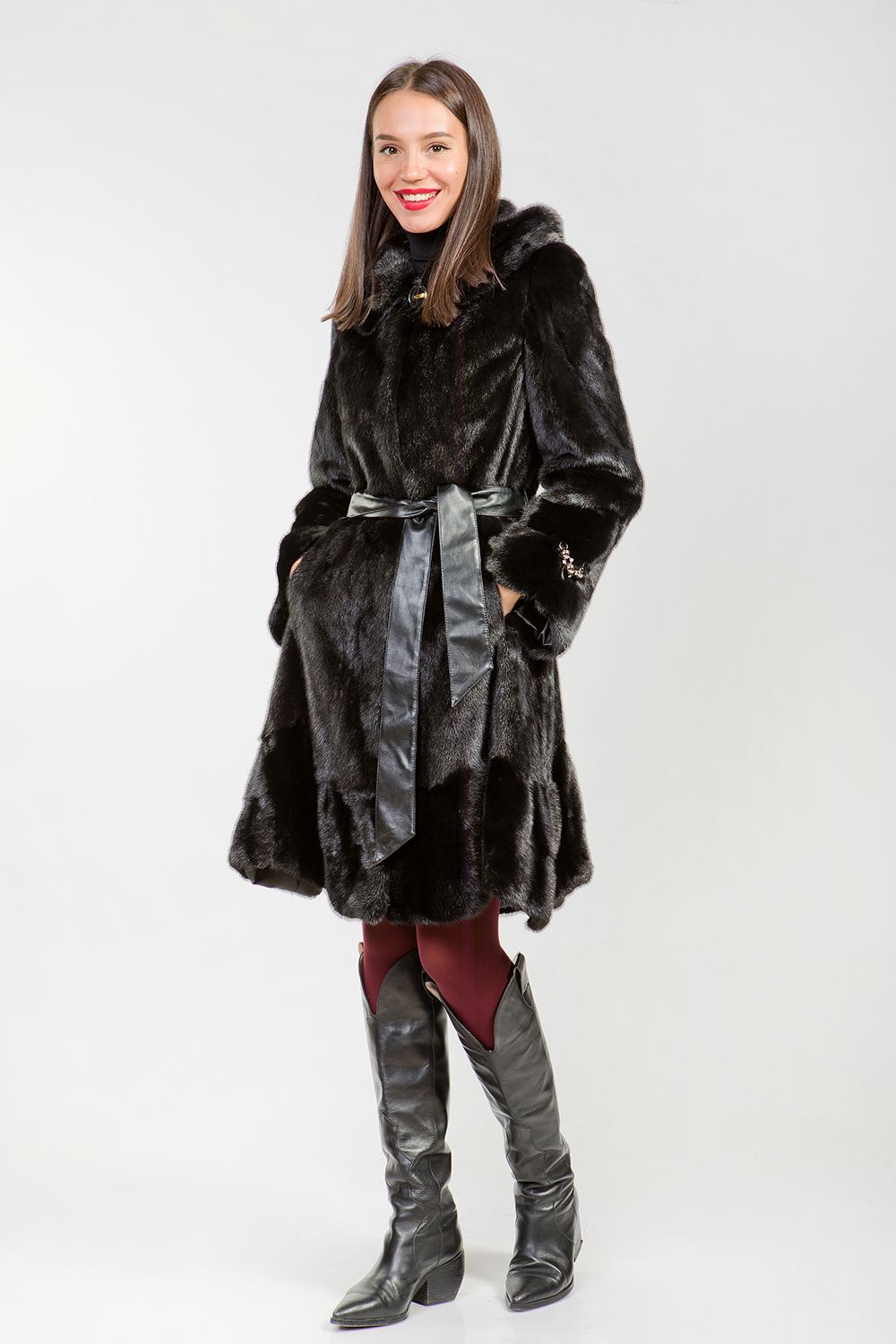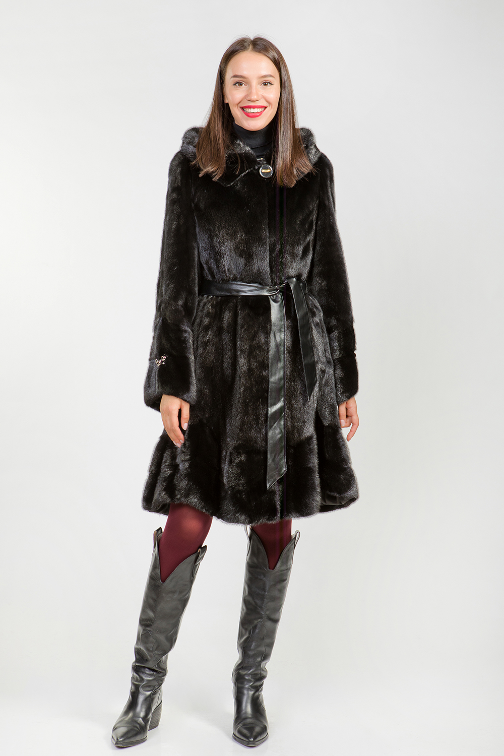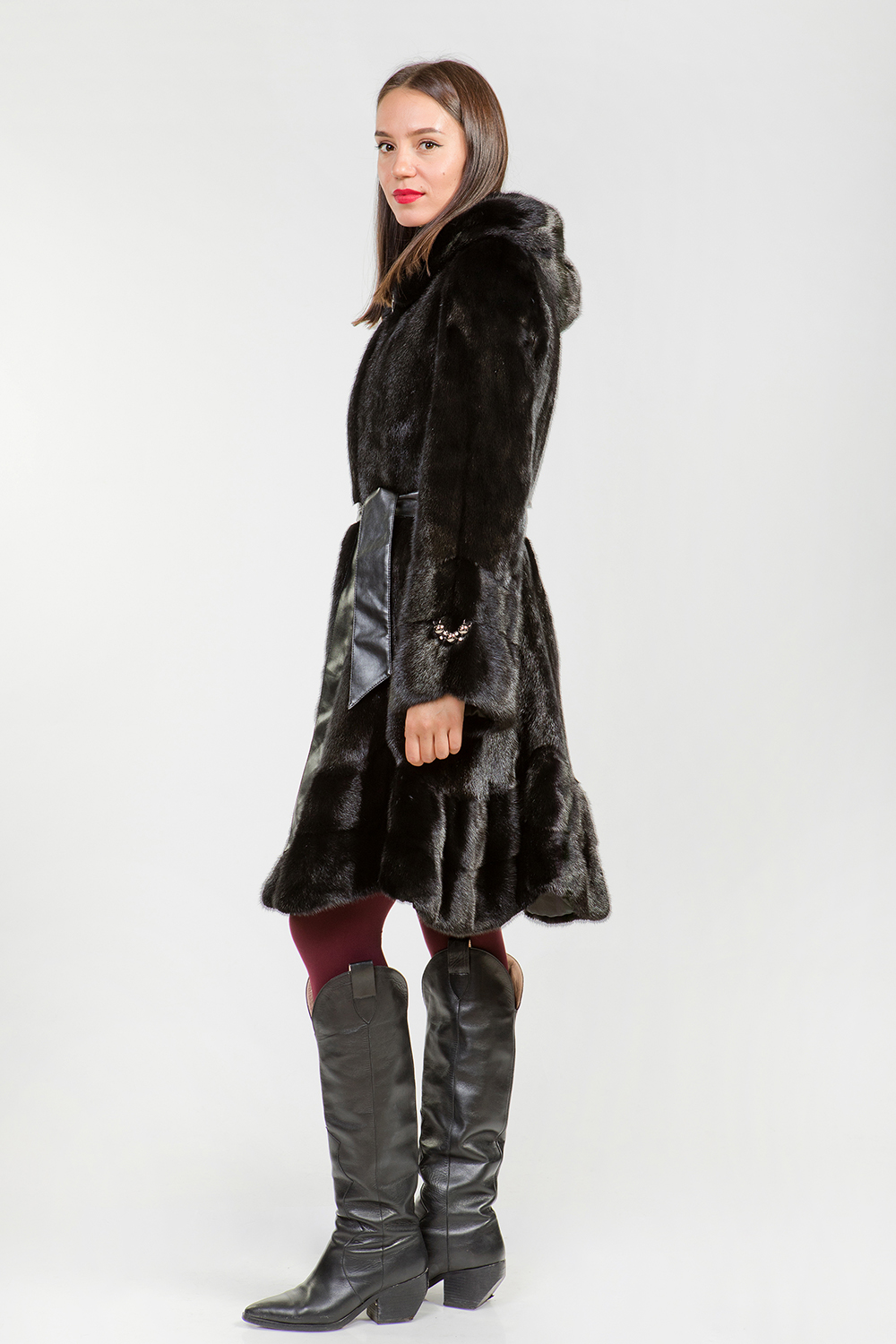 Полупальто из норки с капюшоном, созданное по технологии роспуска и дополненное пластинами, подчеркивает стройность фигуры благодаря утяжке в районе талии. Длина изделия составляет 105 см, а расклешенный низ и уютный капюшон придают ему игривый и кокетливый вид, идеально подходящий для молодой женщины.