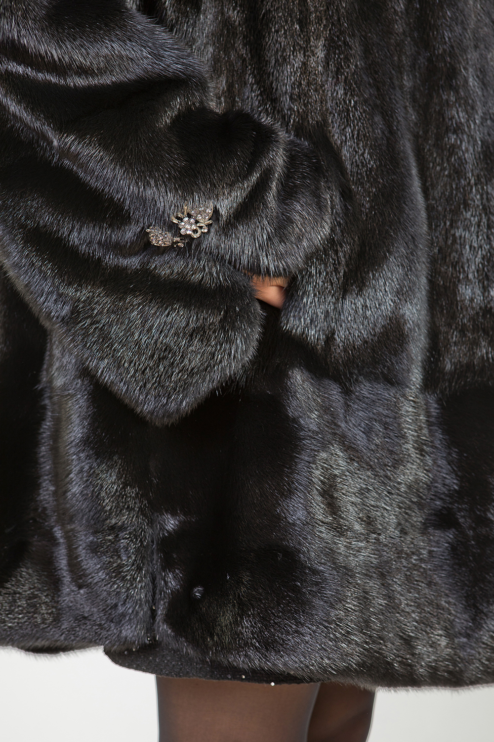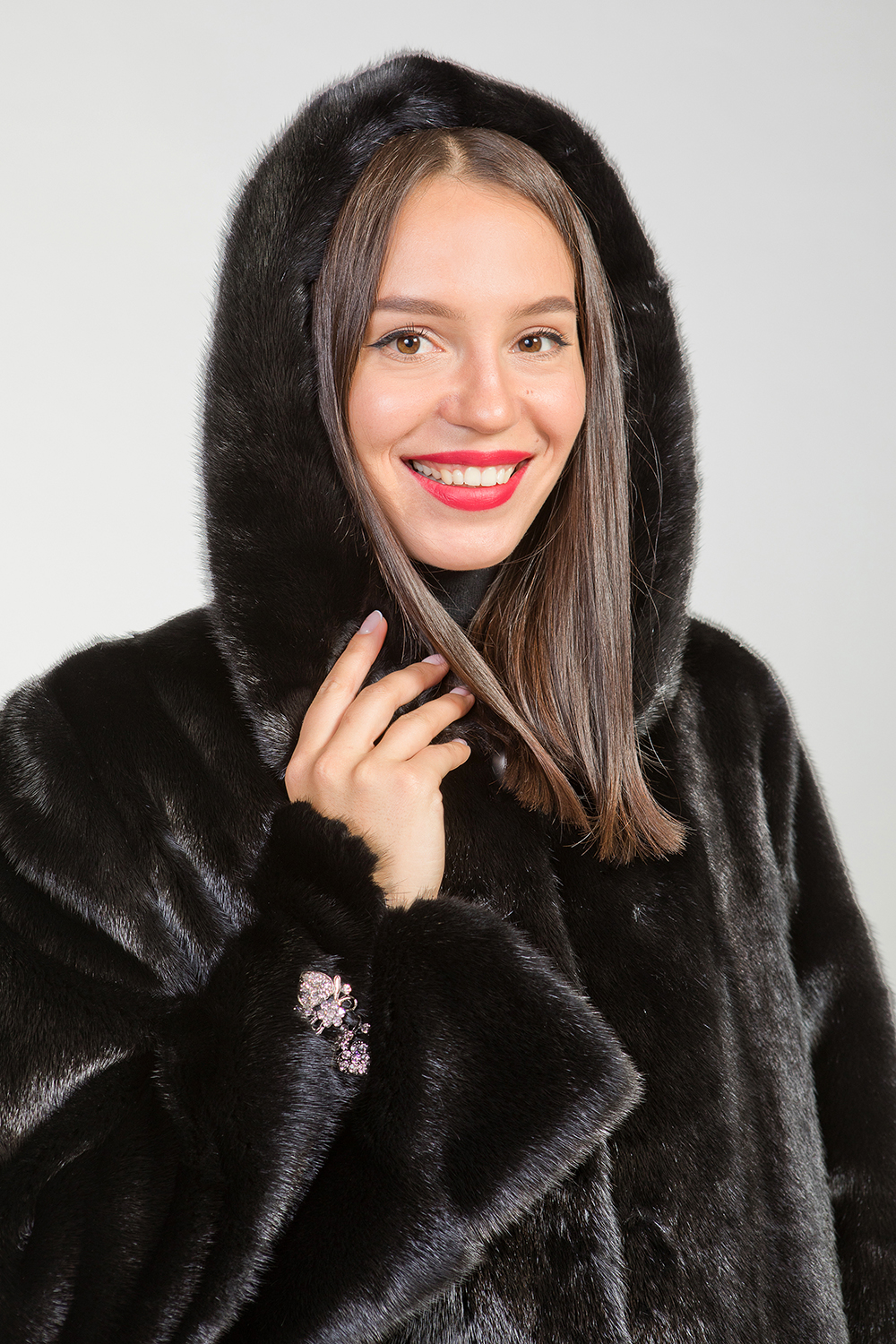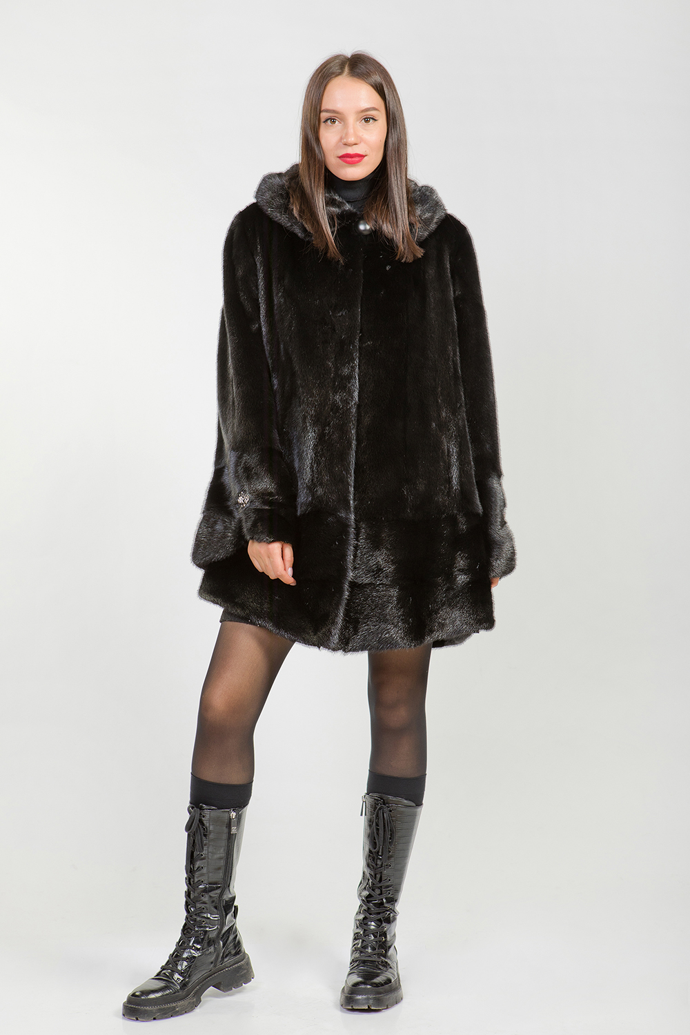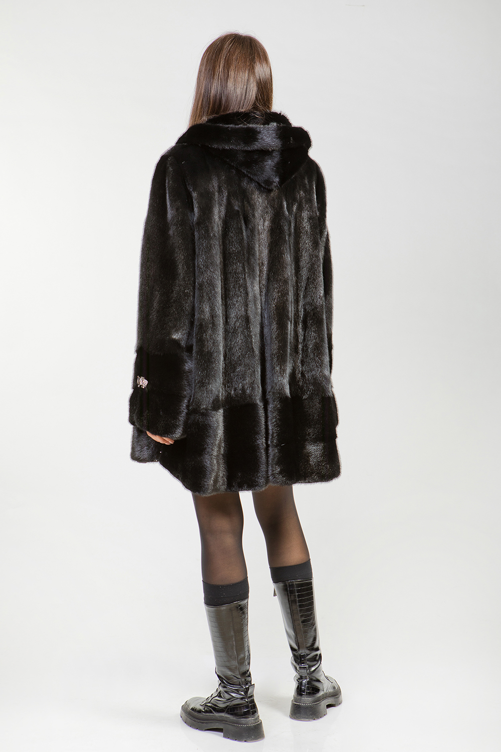Полупальто из меха норки с капюшоном представляет собой изделие с кроем роспуск и добавлением пластин. Длина модели составляет 100 см. Особенностью этого полупальто являются небольшие разрезы на рукавах и по бокам. Модель имеет слегка расклешенный силуэт, но благодаря утяжке можно сделать ее более приталенной и подчеркнуть стройность фигуры. Универсальный фасон изделия подходит для любого типа фигуры.