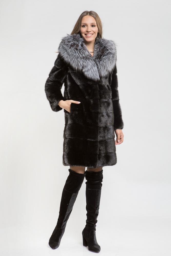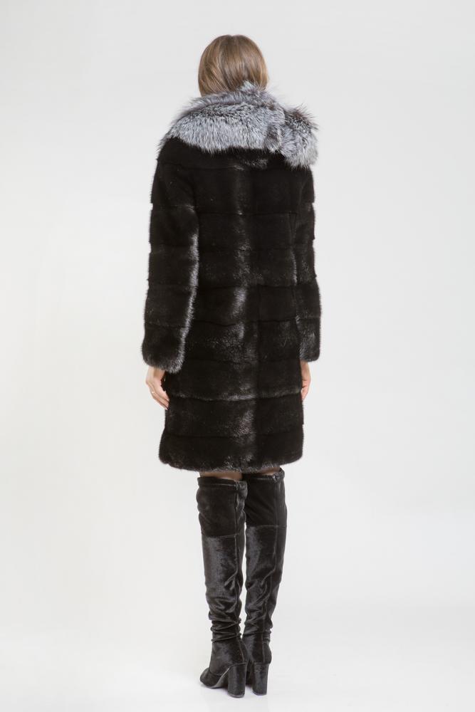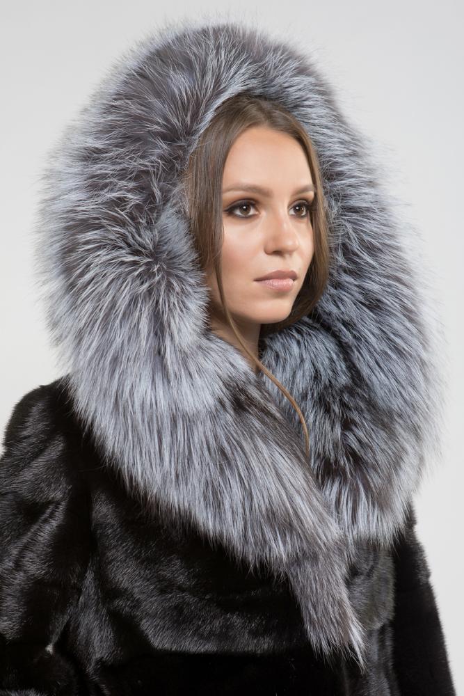 Полупальто из норки. Капюшон украшен мехом чернобурой лисы. Поперечная выкладка пластин придает изделию оригинальный крой. Длина — 100 см. Низ и рукава отстегиваются, превращая шубку в компактную курточку. Универсальность модели делает ее популярной.