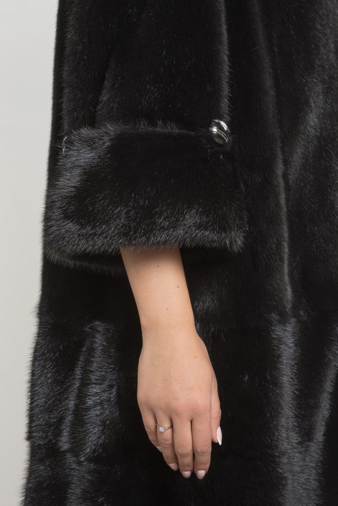 Полупальто из меха норки с капюшоном. Низ модели выполнен из поперечно выложенных пластин. Рукава шубки можно сделать более укороченными, что позволит вам сочетать её с длинными перчатками или митенками. Внутри и на рукавах изделия предусмотрены регулирующие утяжки, что обеспечивает идеальную посадку. Длина шубки составляет 110 см. Эта элегантная модель идеально подойдёт для тех, кто ценит строгий классический стиль.