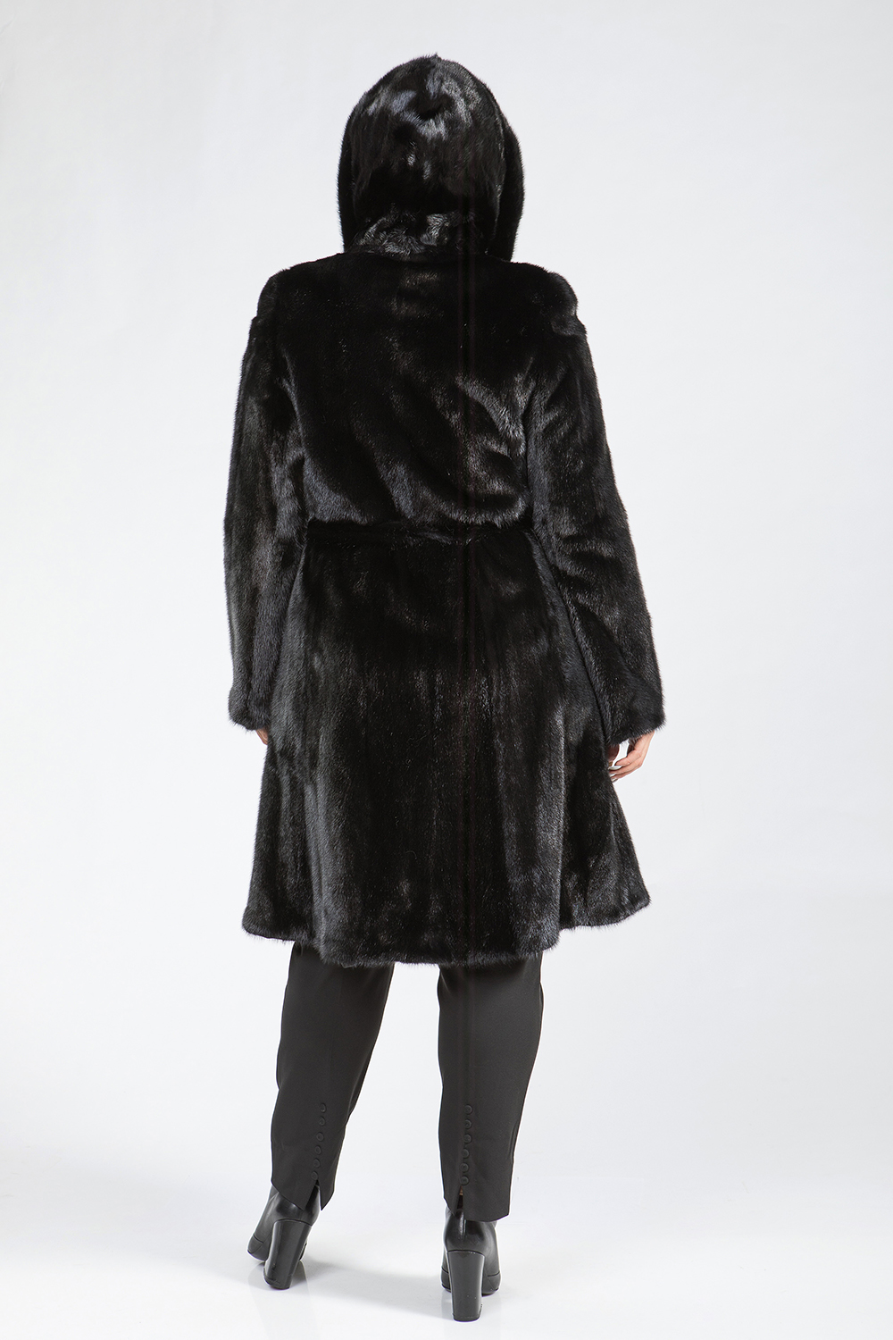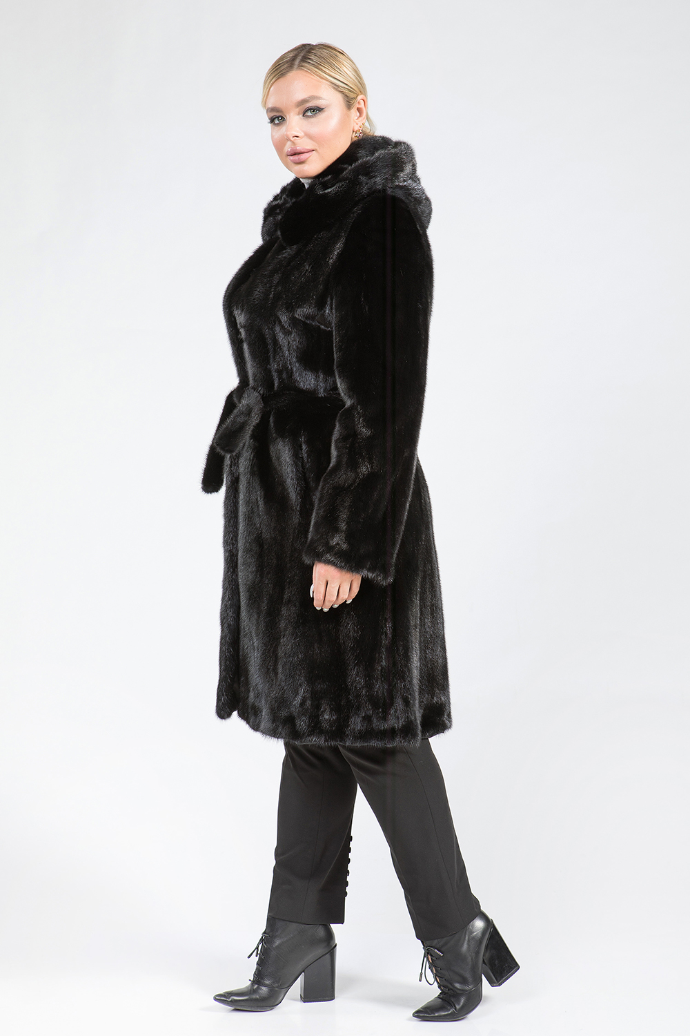 Полупальто из норки с капюшоном, созданное по технологии роспуска с добавлением пластин, предлагает элегантный и современный дизайн. Рукава регулируются при помощи утяжек, что позволяет адаптировать их под индивидуальные предпочтения. Длина изделия составляет 105 см, а силуэт слегка расклешенный, с поясом, который эффективно подчеркивает фигуру. Благородный черный цвет меха предоставляет широкие возможности для стильных экспериментов и создания разнообразных образов.