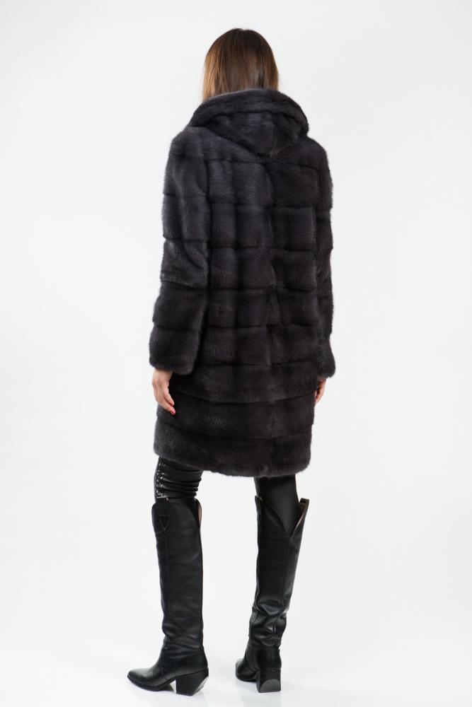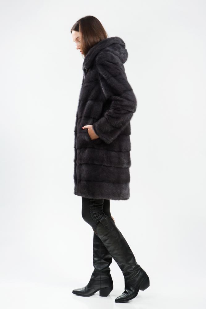 Полупальто из норкового меха с капюшоном. Модель выполнена в технике поперечной выкладки пластин. На талии, рукавах и подоле предусмотрены утягивающие элементы для регулировки посадки. Длина изделия составляет 100 см. Молнии-невидимки позволяют трансформировать полупальто в компактную курточку. Этот универсальный вариант подходит для девушек любого телосложения и возраста.