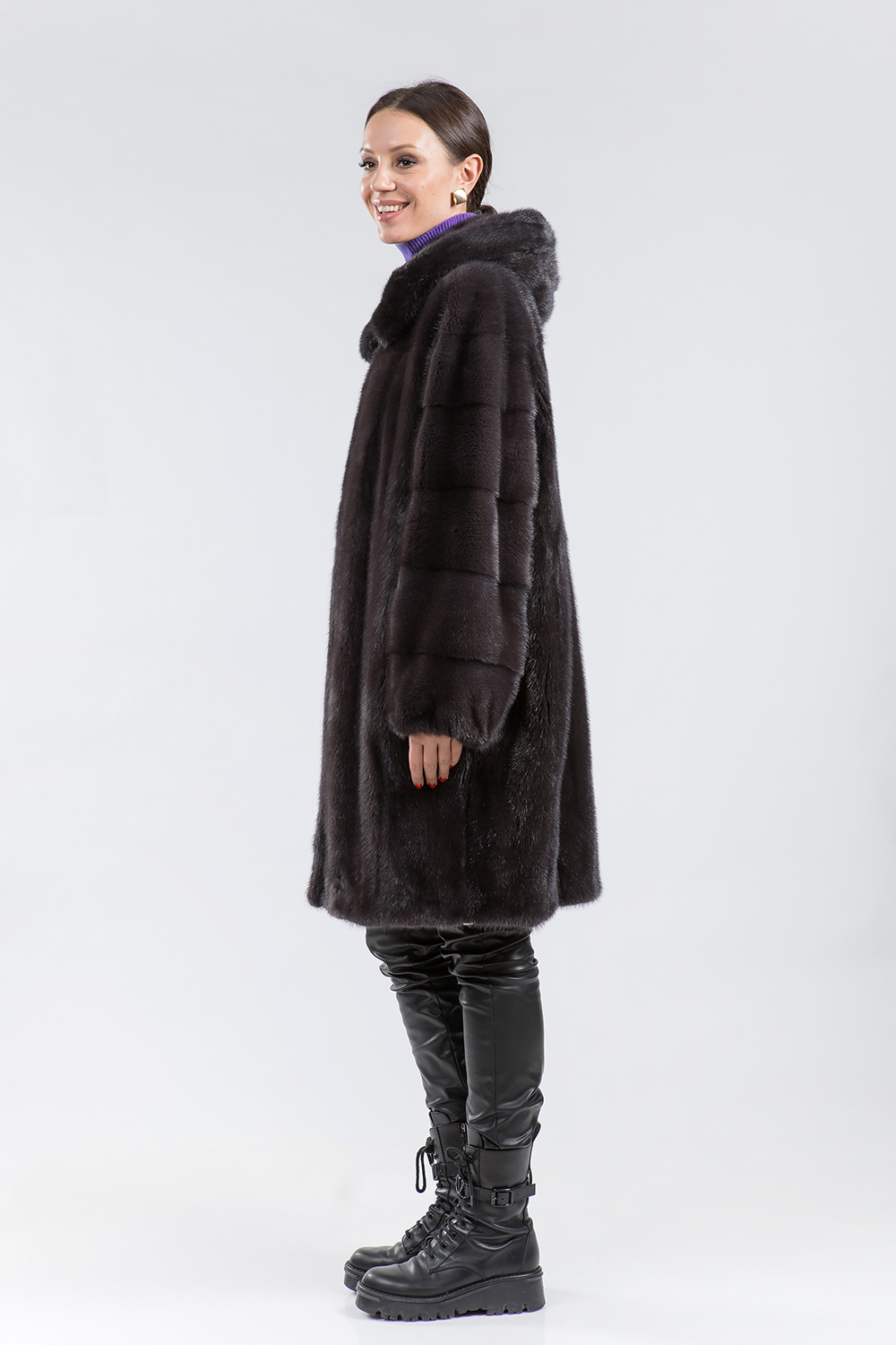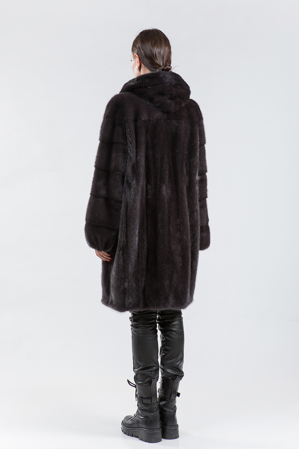 Полупальто из норки с капюшоном, выполненное в технике роспуска, с рукавами из поперечной выкладки пластин. Модель оснащена регулируемыми утяжками в нижней части, на рукавах и в области талии. Длина изделия составляет 100 см, а особенностью является слегка зауженный силуэт в нижней части. Создайте неповторимый зимний образ в новом норковом пальто и будьте неотразимы этой зимой!