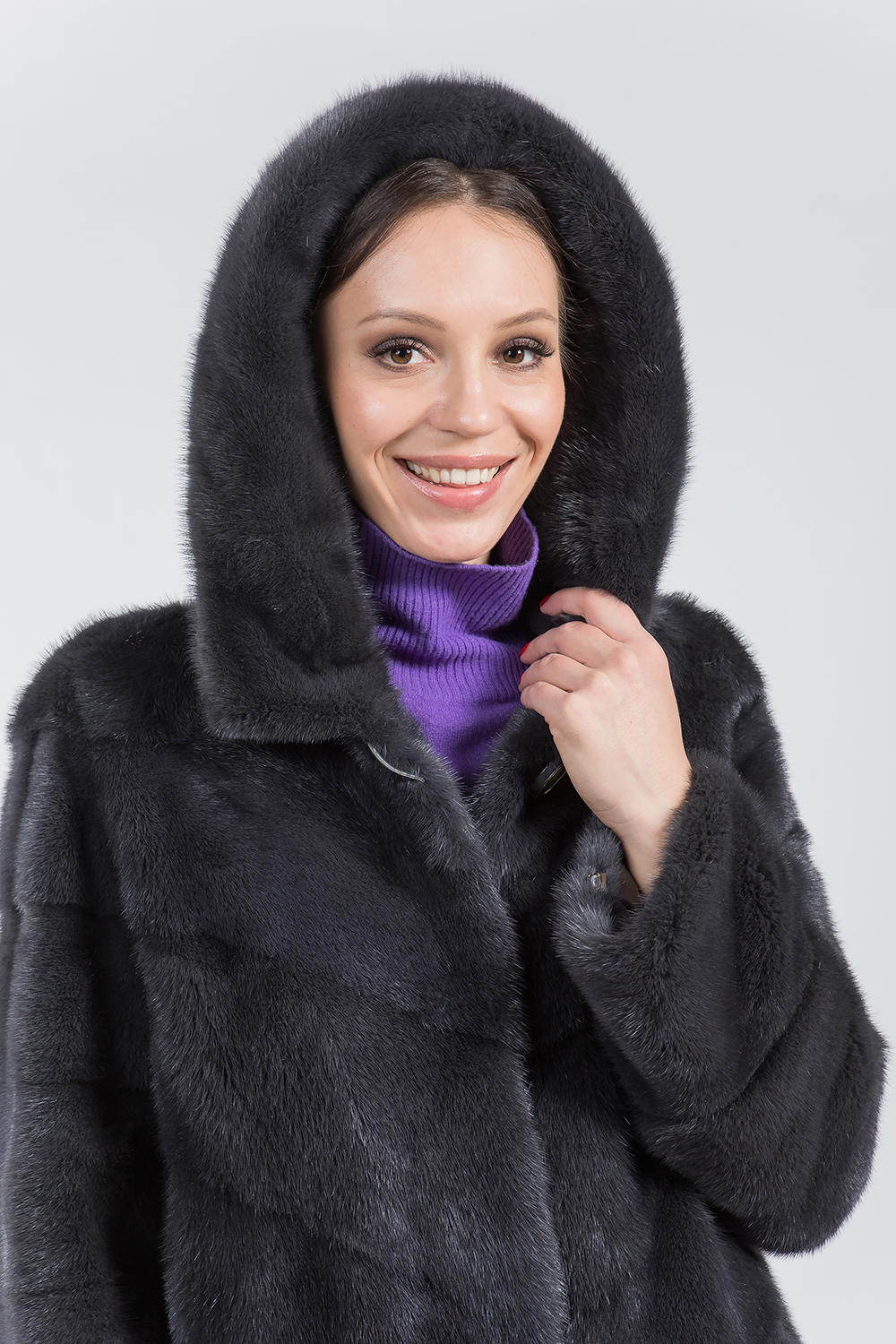 Полупальто из меха норки с капюшоном. Модель выполнена в стиле диагональной выкладки пластин. Изделие оснащено регулирующими утяжками на рукавах, по низу и в области талии. К низу полупальто слегка заужено. Рукав модели можно укоротить. Длина изделия составляет 100 см.