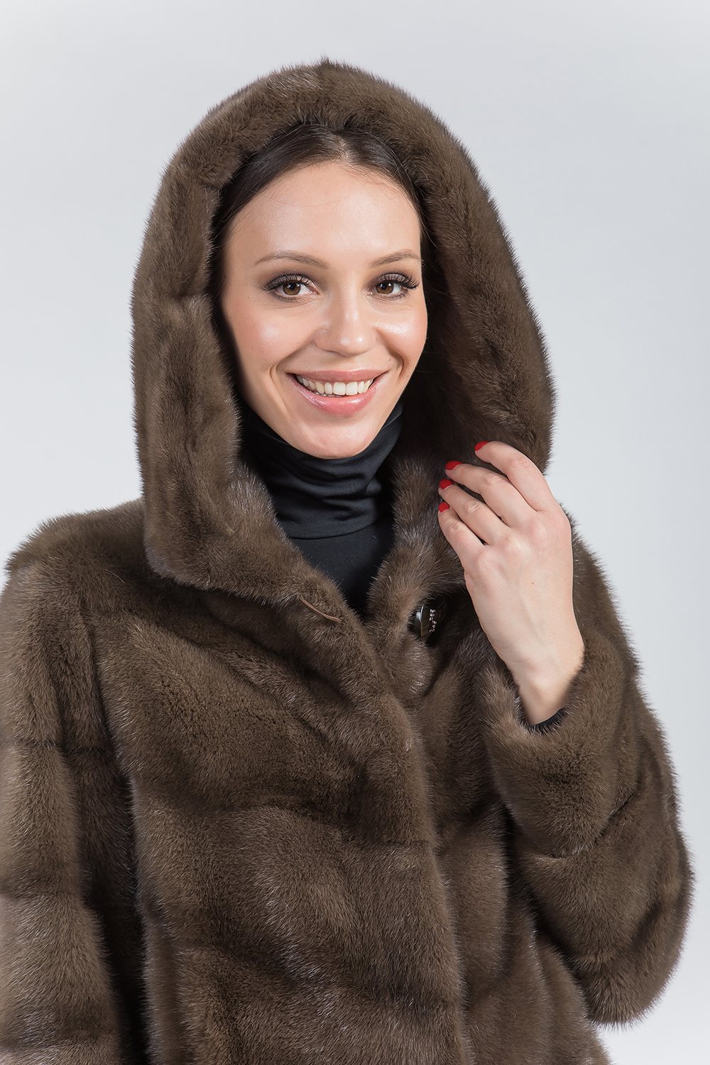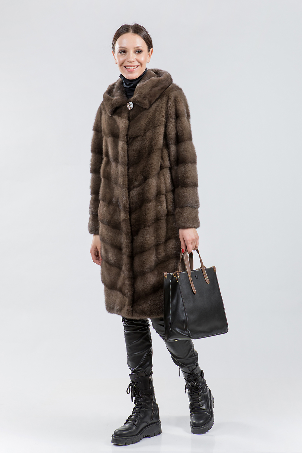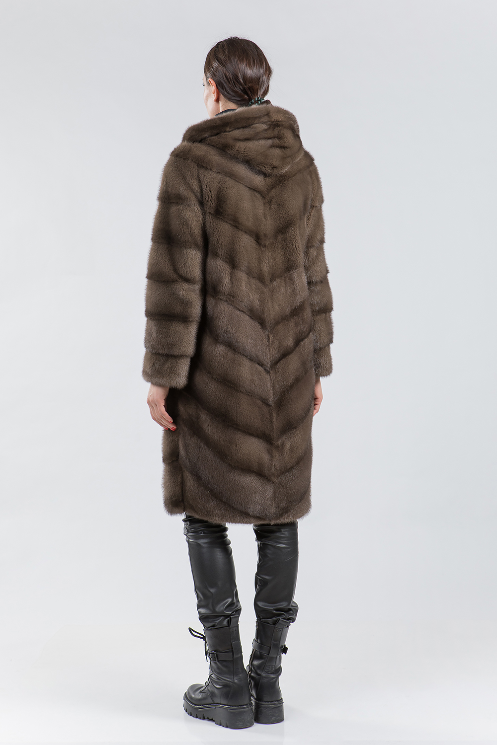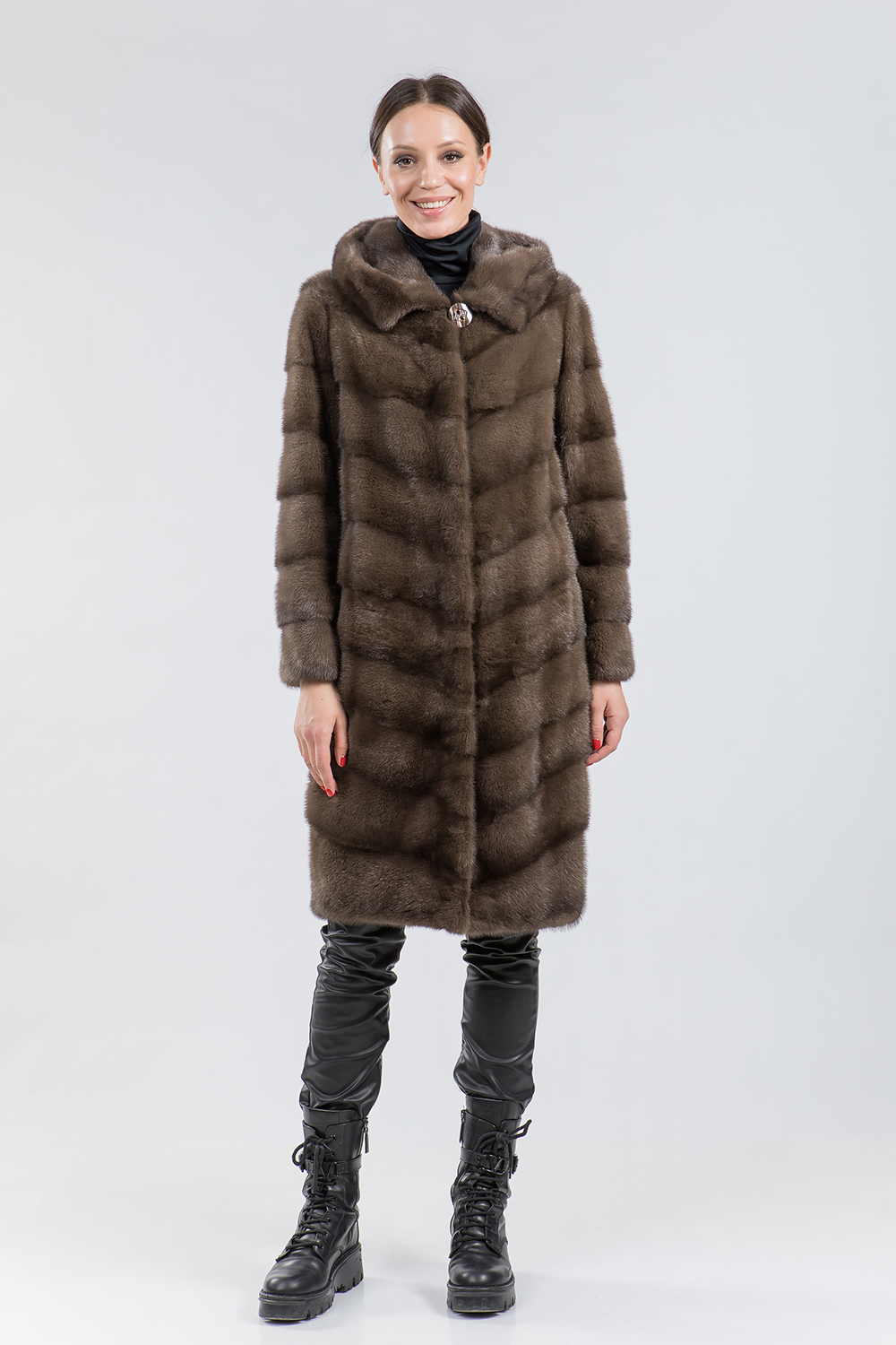 Полупальто из меха норки с капюшоном. Крой изделия диагональная выкладка пластин. Модель оснащена регулирующими утяжками на рукавах, по низу и в зоне талии. Рукава модели трансформируются в более укороченные. Длина изделия 100 см. Практичность шубки неоспорима. Если хочется выглядеть престижно, по-королевски роскошно, то натуральная норковая шуба является идеальным вариантом!
