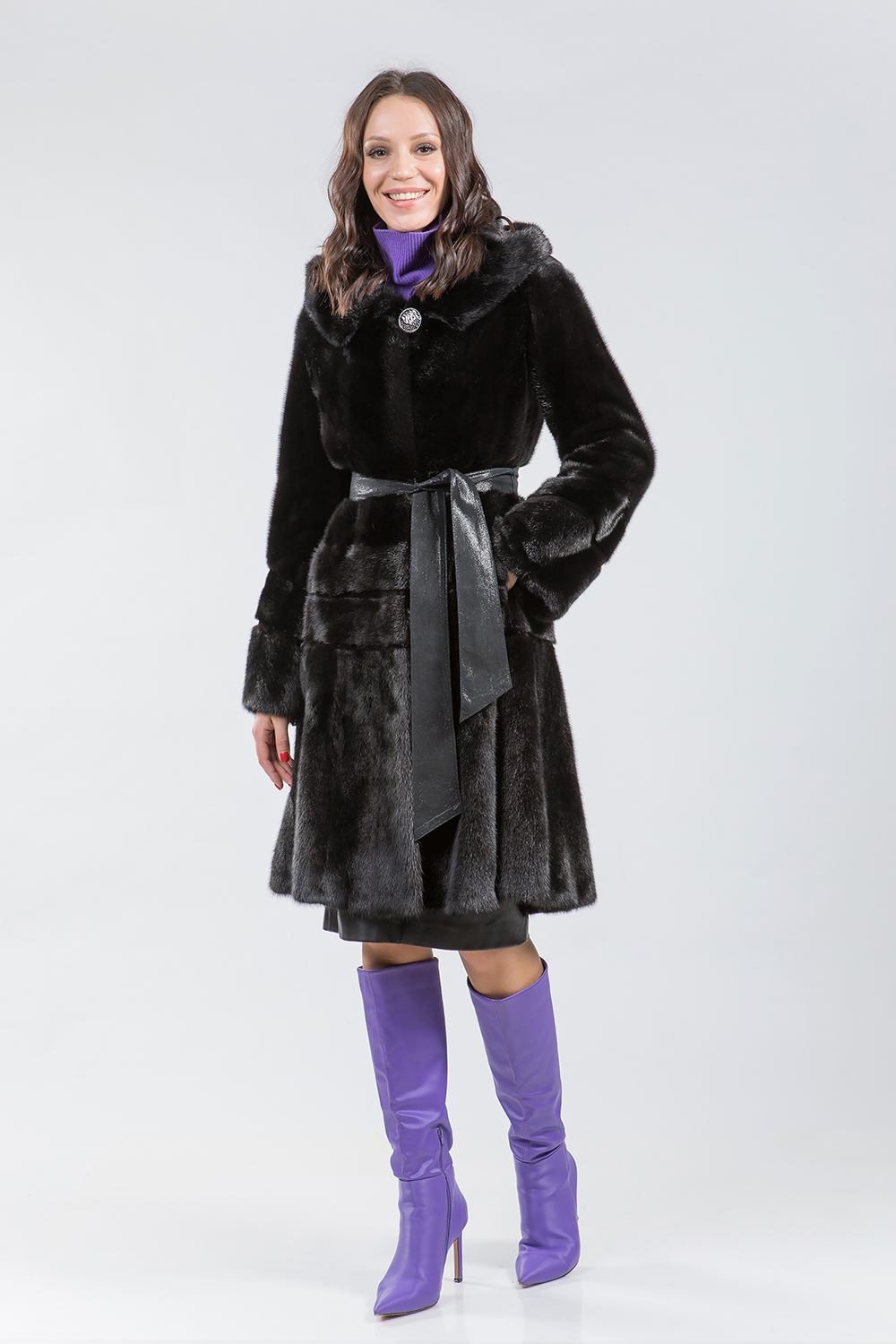 Норковое полупальто с капюшоном, выполненное в технике роспуска с использованием пластин. Модель имеет регулирующие утяжки на талии и рукавах, что позволяет создать идеальный силуэт. Низ пальто расклешён. В области талии и ниже изделие декорировано эффектной выстрижкой, придающей ему особый шарм. В комплект входит кожаный пояс. Длина шубки составляет 105 см.