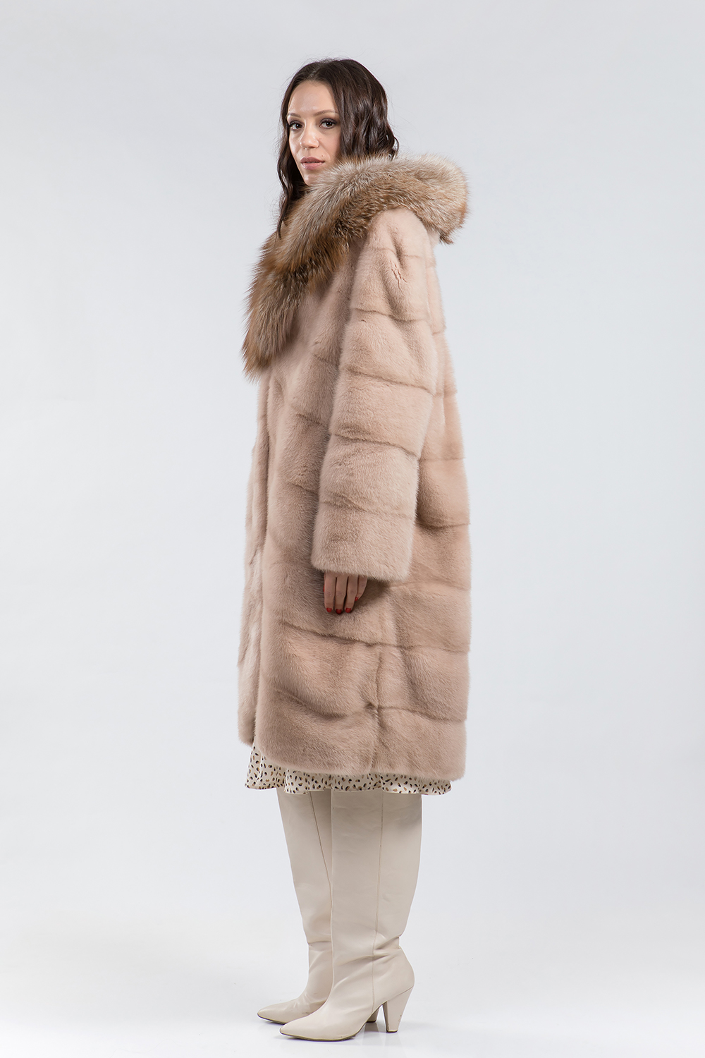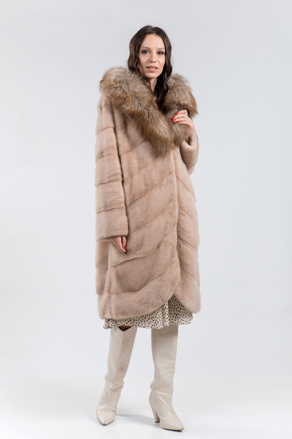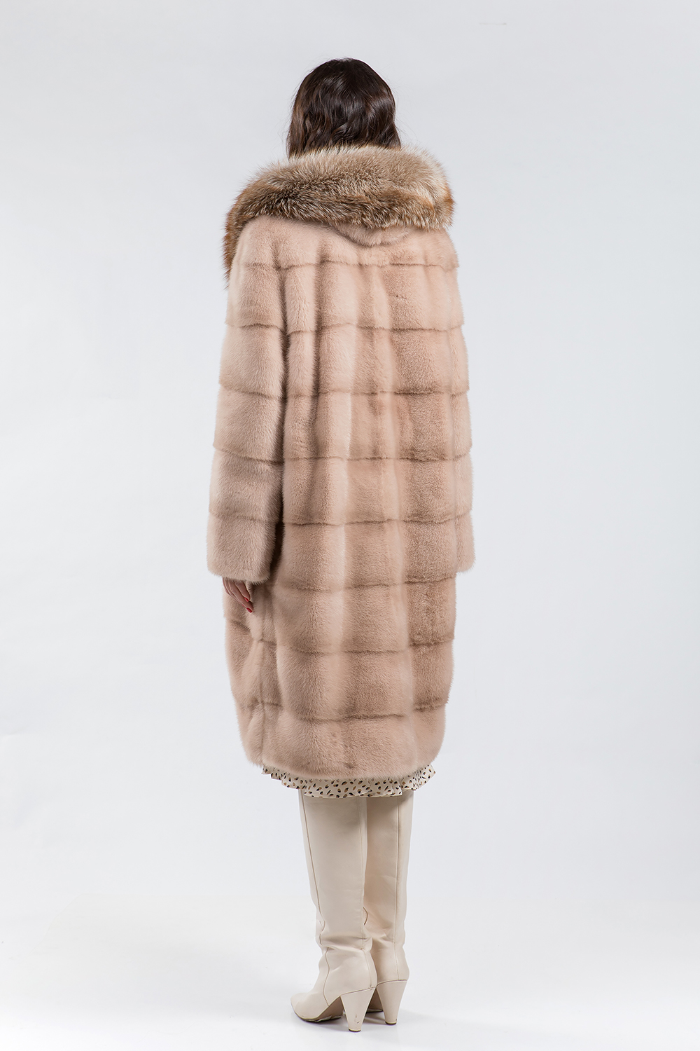 Полупальто из норки с капюшоном, украшенным мехом лисы. Модель имеет комбинированный крой: перед выполнен из пластин, уложенных по диагонали, а спинка — из поперечно расположенных. Для удобства предусмотрены регулирующие утяжки на рукавах и талии. Низ изделия слегка закруглен. Длина шубы составляет 110 сантиметров.