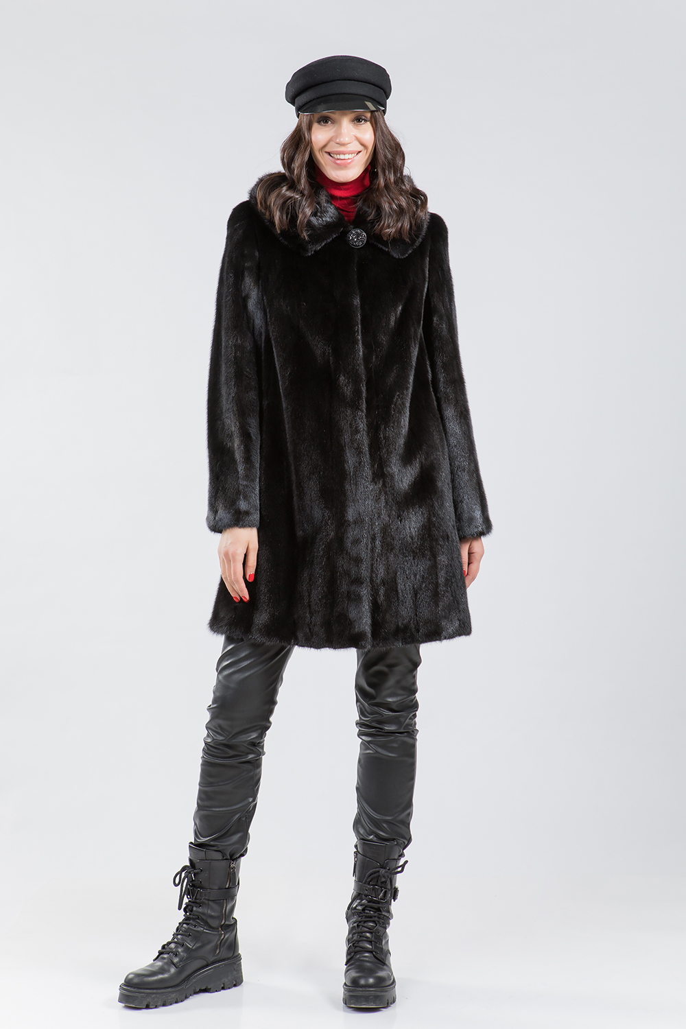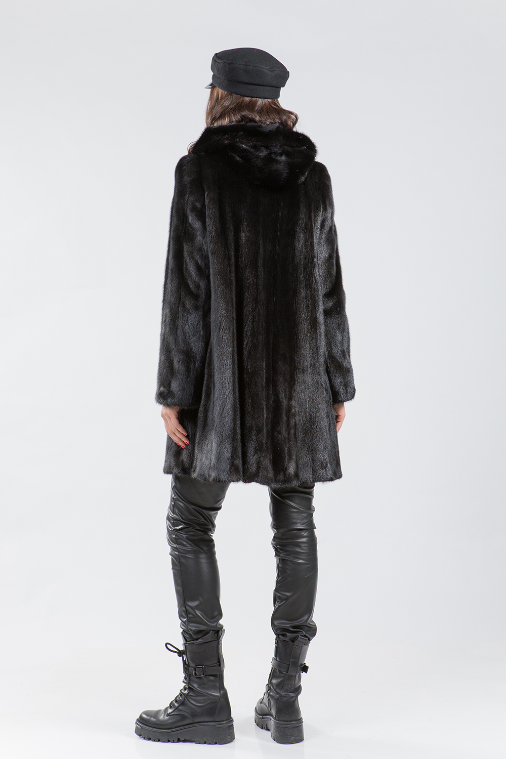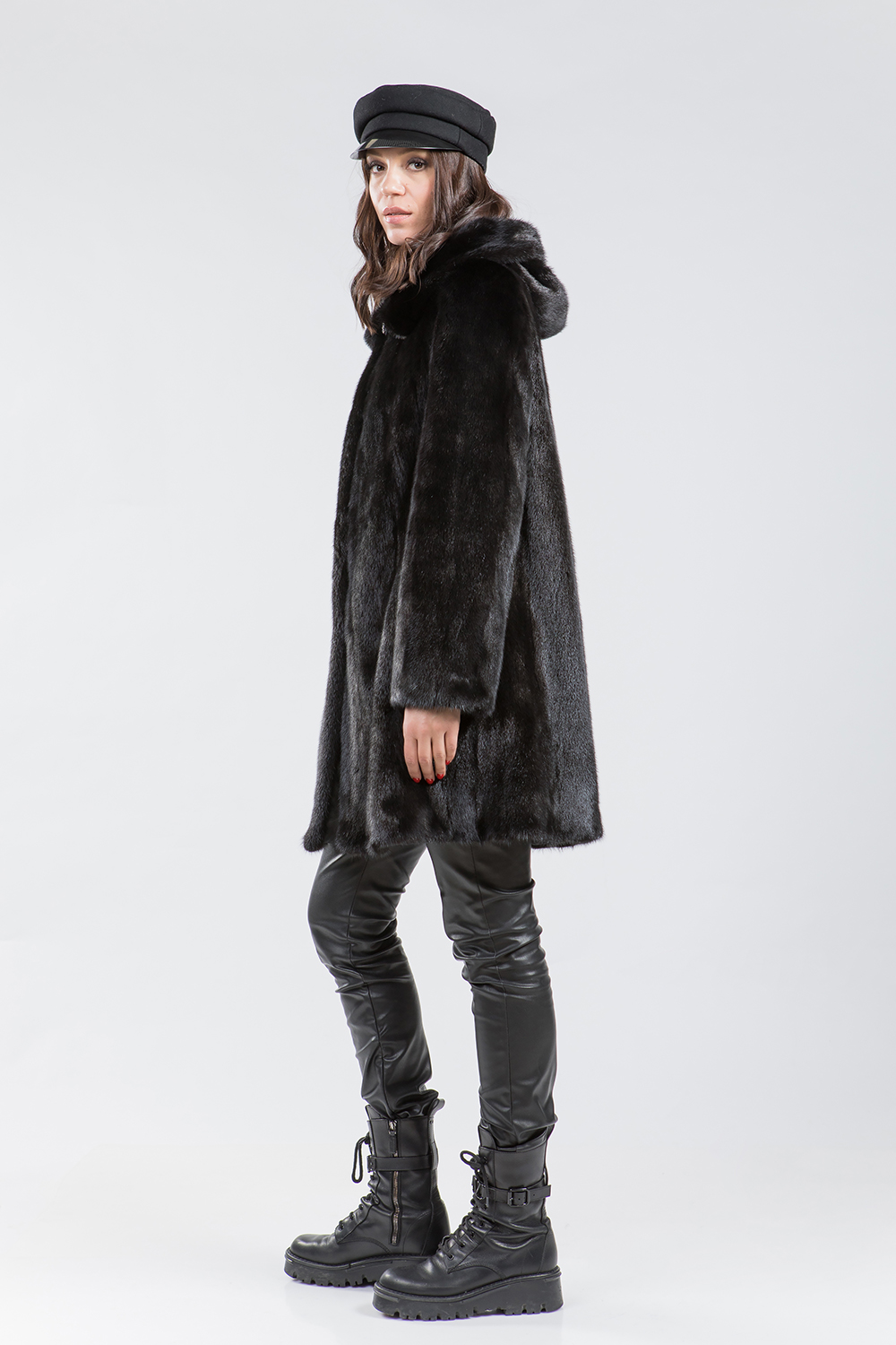 Полупальто из меха норки с капюшоном, скроенное по принципу роспуска. Модель оснащена регулируемыми утяжками на рукавах, что позволяет создать идеальный силуэт. Длина изделия составляет 90 см, а слегка расклешённый низ придаёт шубке кокетливый вид. Благородный чёрный цвет открывает безграничные возможности для тех, кто любит экспериментировать со стилем и часто меняет свой имидж!