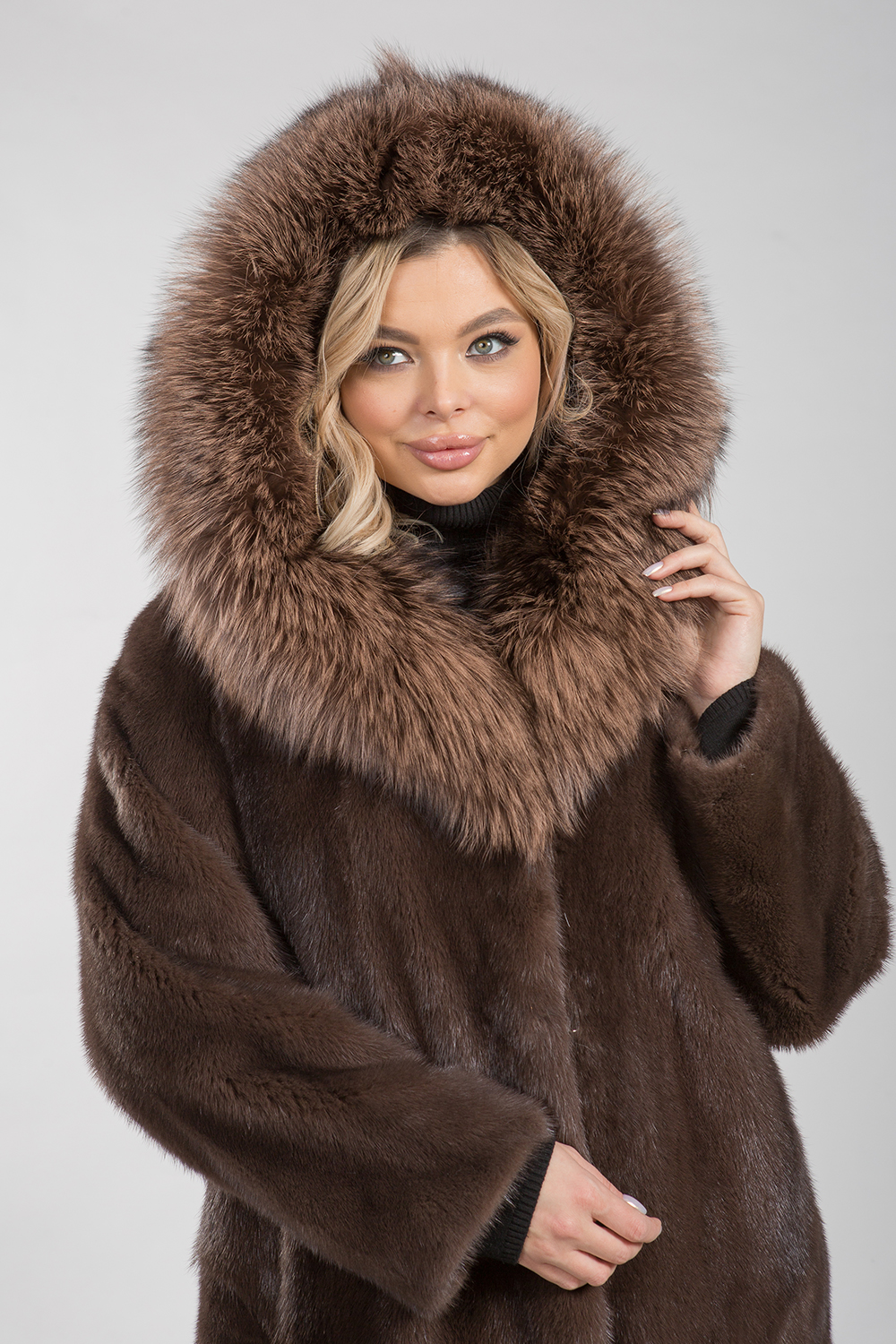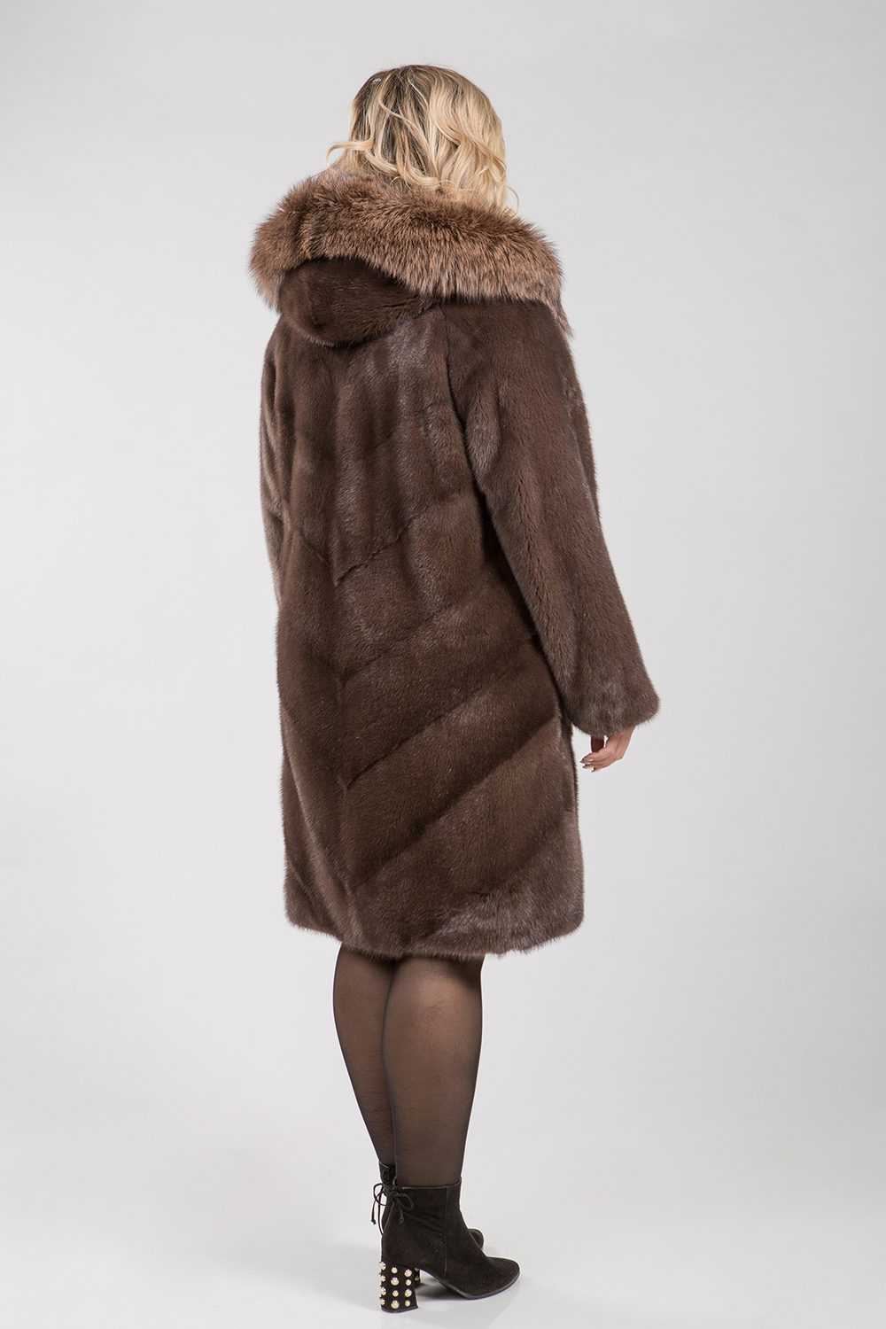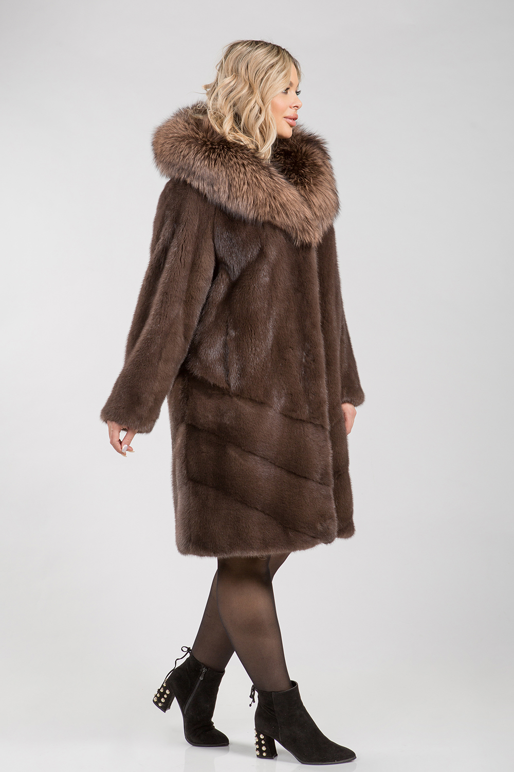 Длина модели составляет 100 см. Престижный вид изделию придаёт элегантный сдержанный оттенок тонированного меха норки и удачное сочетание коротковорсового и длинноворсового материалов.