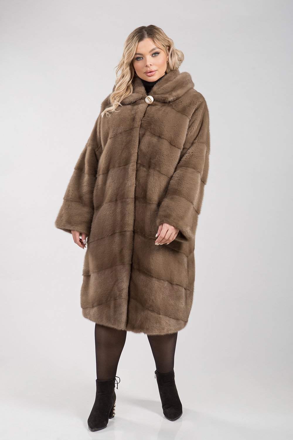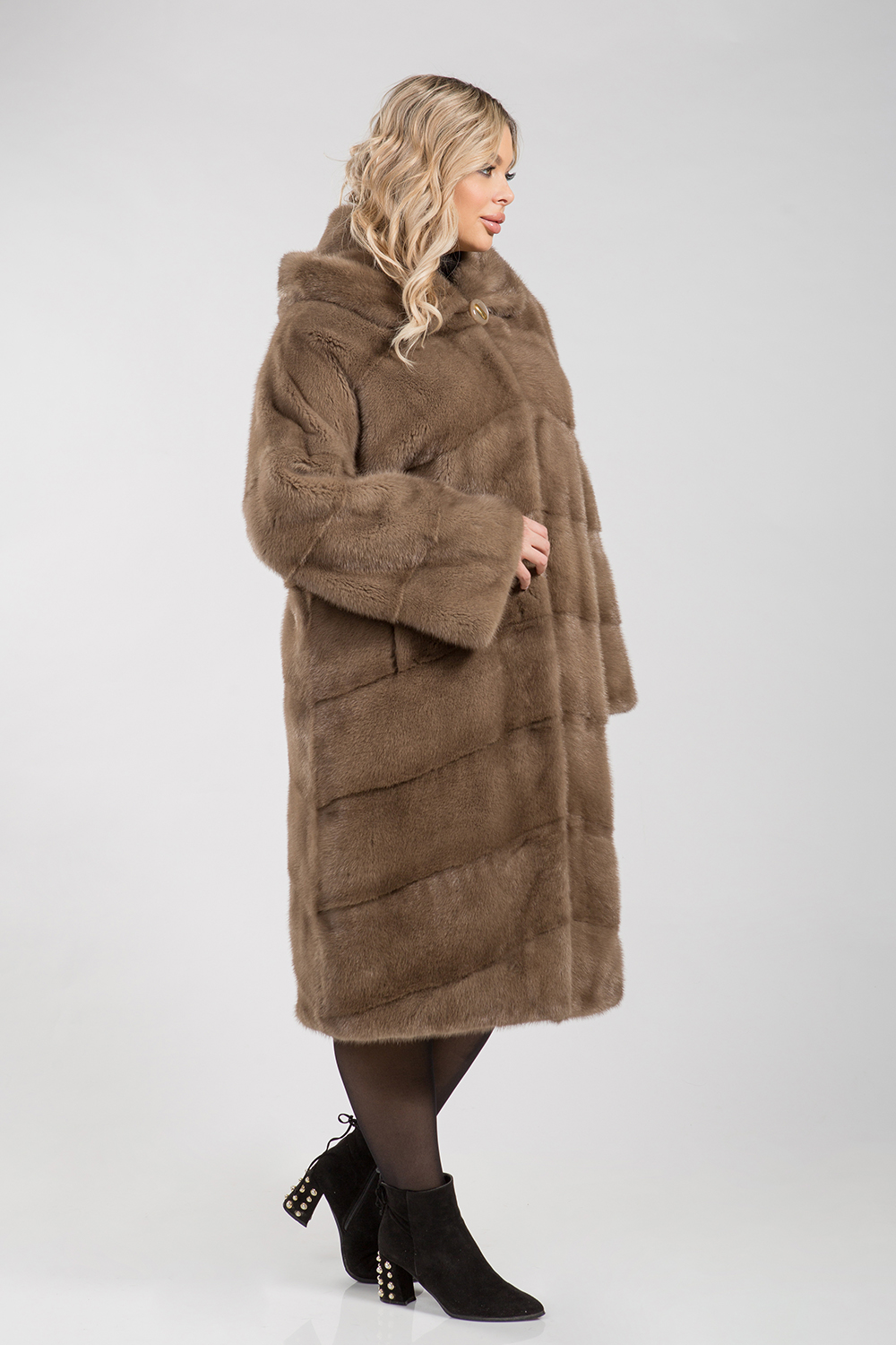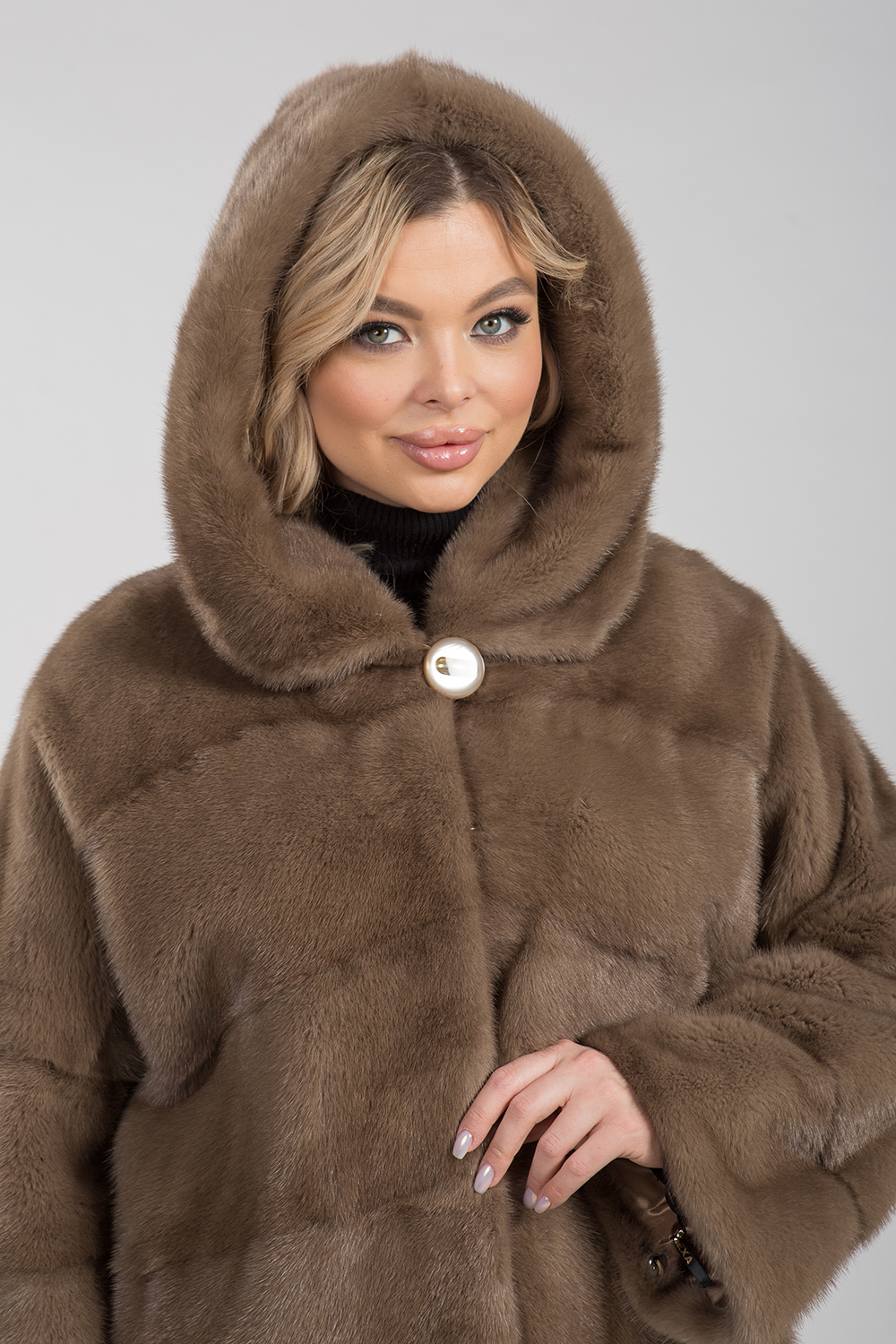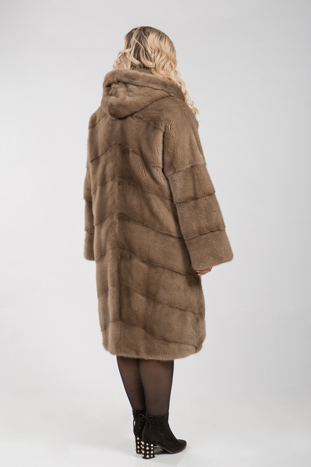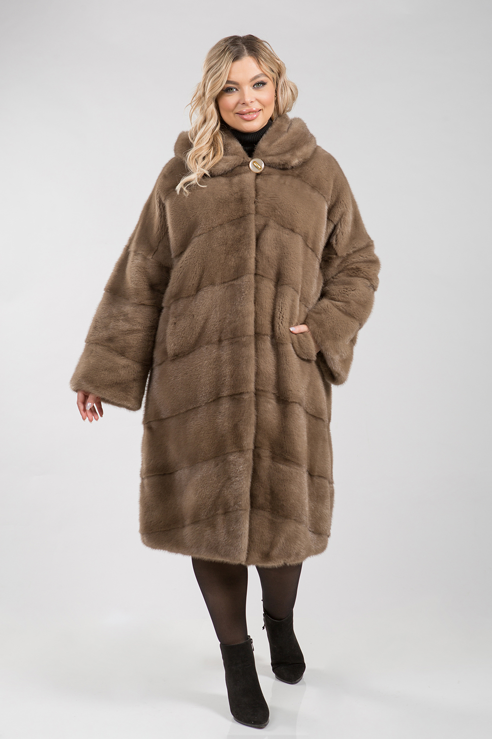 Полупальто из меха норки с капюшоном. Крой изделия диагональная выкладка пластин. Модель оснащена регулирующими утяжками на рукавах и в зоне талии. Изделие к низу слегка заужено. Рукава модели спущенные. Длина изделия 110 см. Если хочется выглядеть престижно, по-королевски роскошно, то натуральная норковая шуба является идеальным вариантом!