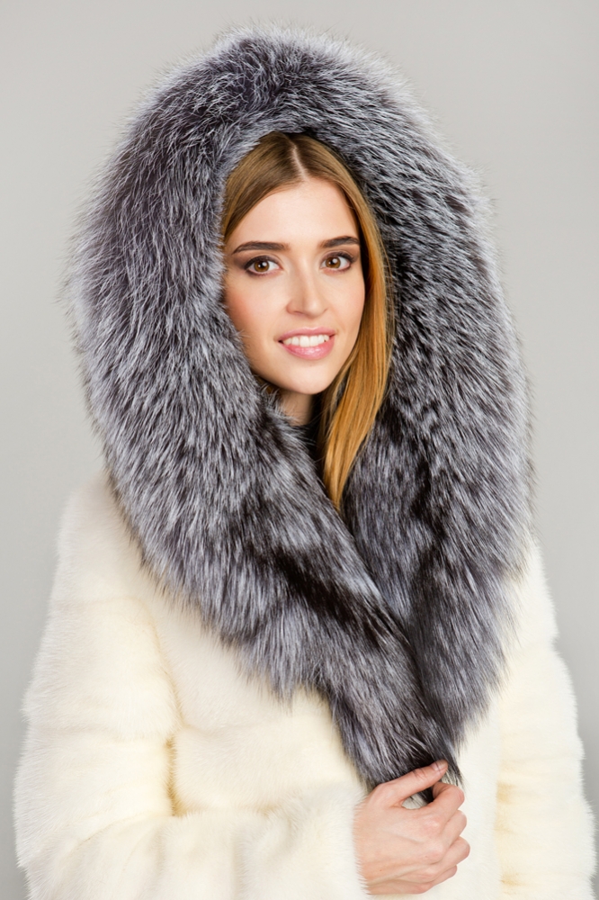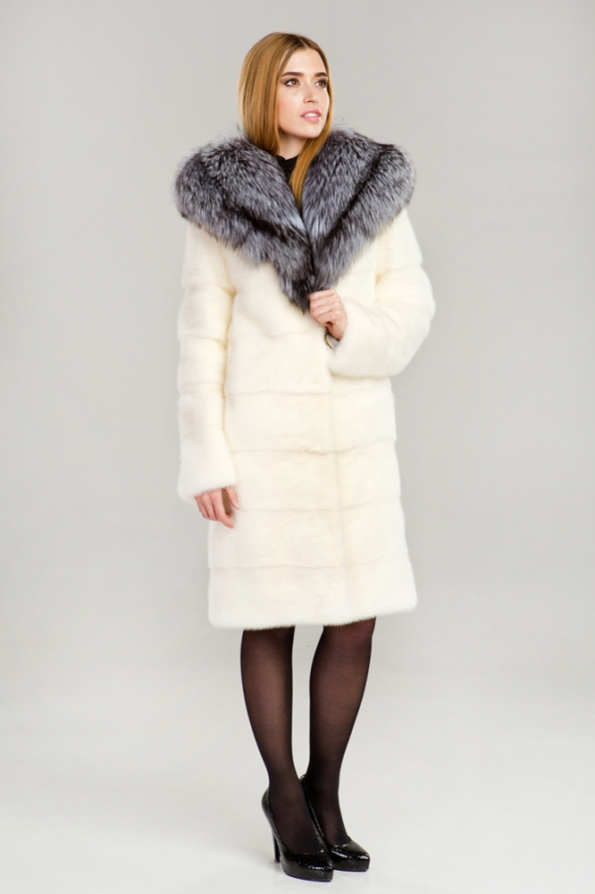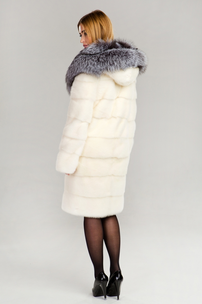 Полупальто из норки с капюшоном, украшенным роскошным мехом лисы. Крой выполнен с поперечной выкладкой пластин. Изделие оснащено регулируемыми утяжками на рукавах, по низу и в области талии. Длина шубы составляет 100 см. В подарок идет меховой пояс. Рукава можно укоротить с помощью скрытых молний. Белоснежное норковое пальто придает свежесть и молодость образу, а великолепный капюшон из лисы добавляет элегантности и шика!