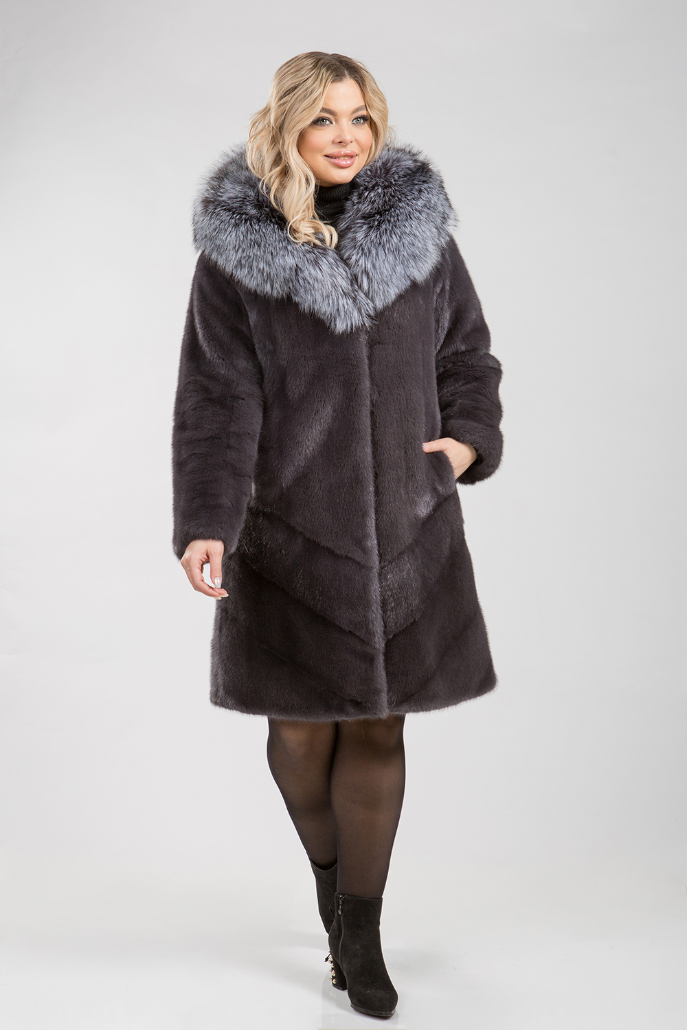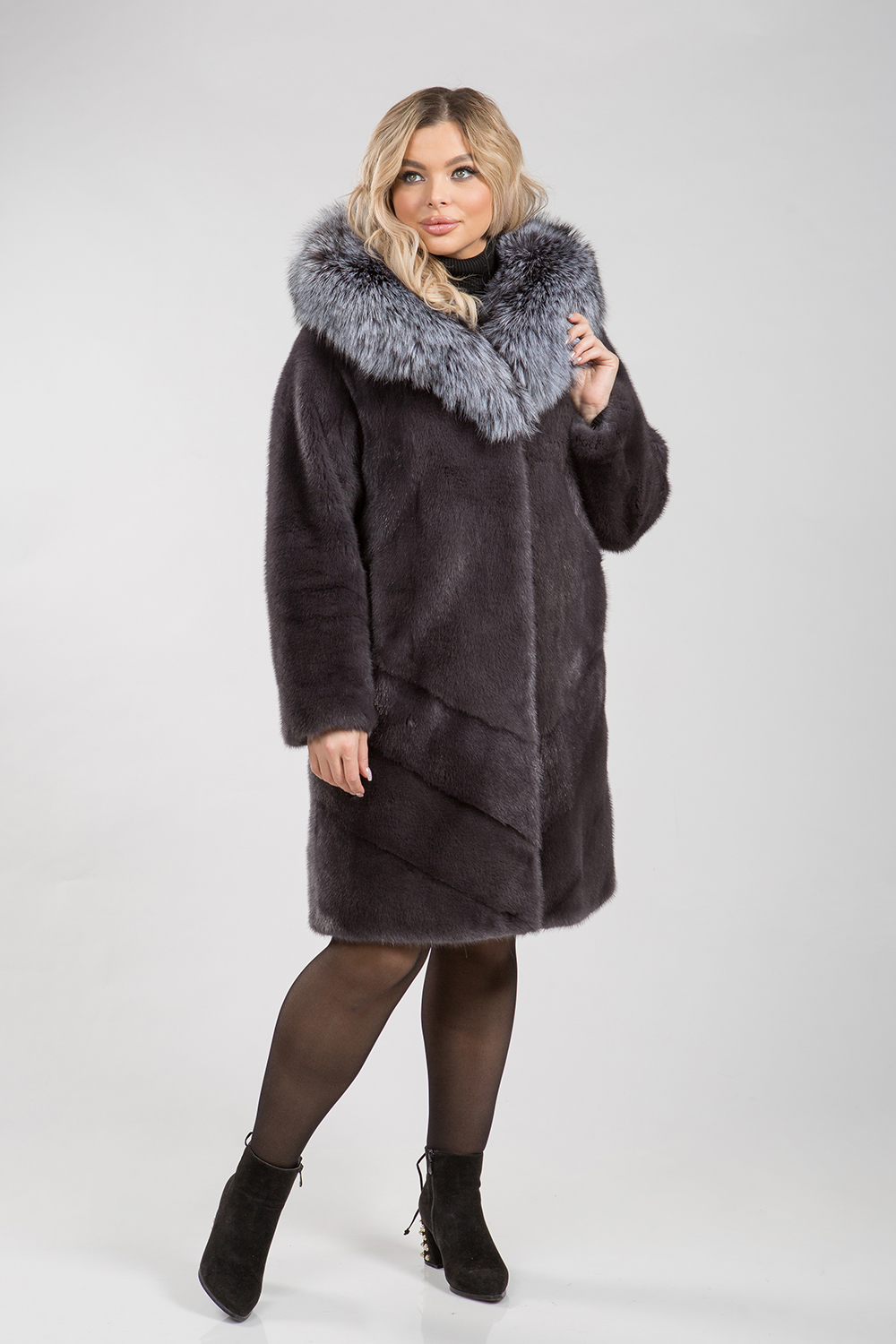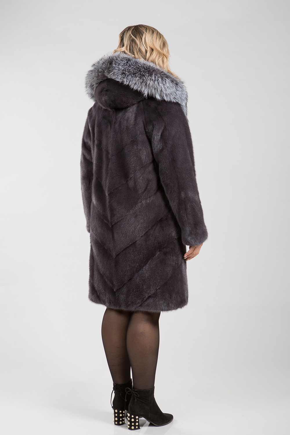 Полупальто из меха норки. Капюшон модели декорирован мехом лисы. Крой изделия комбинированный, перед выполнен в роспуск, низ модели пластины, а спинка шубки полностью-диагональная выкладка пластин. На талии, рукавах и по низу изделия имеются регулирующие утяжки. Длина модели 100 см. Престижный вид модели предают элегантный оттенок цвета муссона и удачное сочетание коротковорсового и длинноворсового материалов.