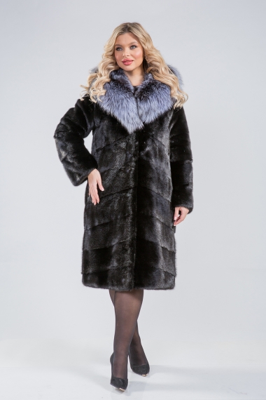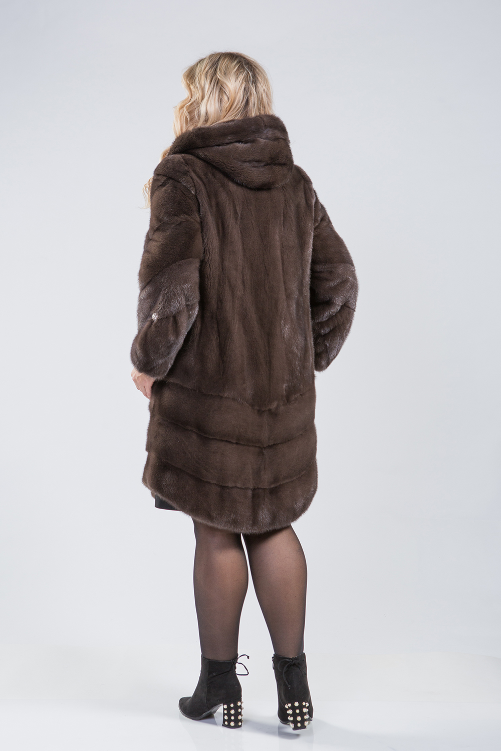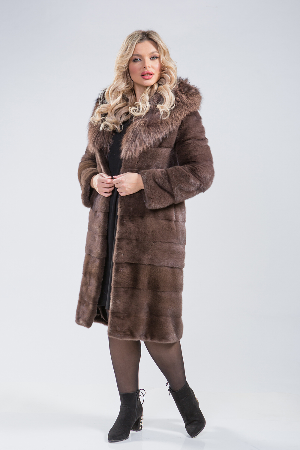 Полупальто из меха норки. Капюшон модели декорирован мехом тонированной лисы. Крой изделия поперечная выкладка пластин. Талия, рукава и низ модели имеют регулирующие утяжки. Длина изделия 110 см. Меховое пальто может трансформироваться в курточку, так как часть рукавов и низ изделия отстегиваются. На первый взгляд строгая консервативная модель превращается в многофункциональную, оригинальную вещь!