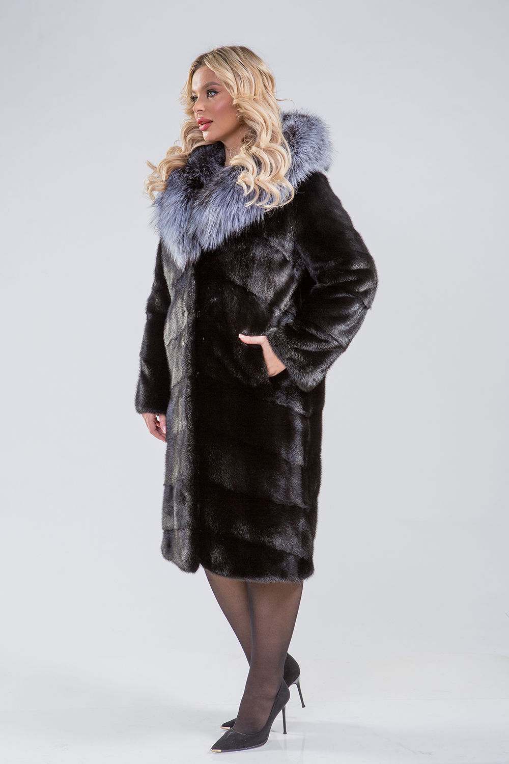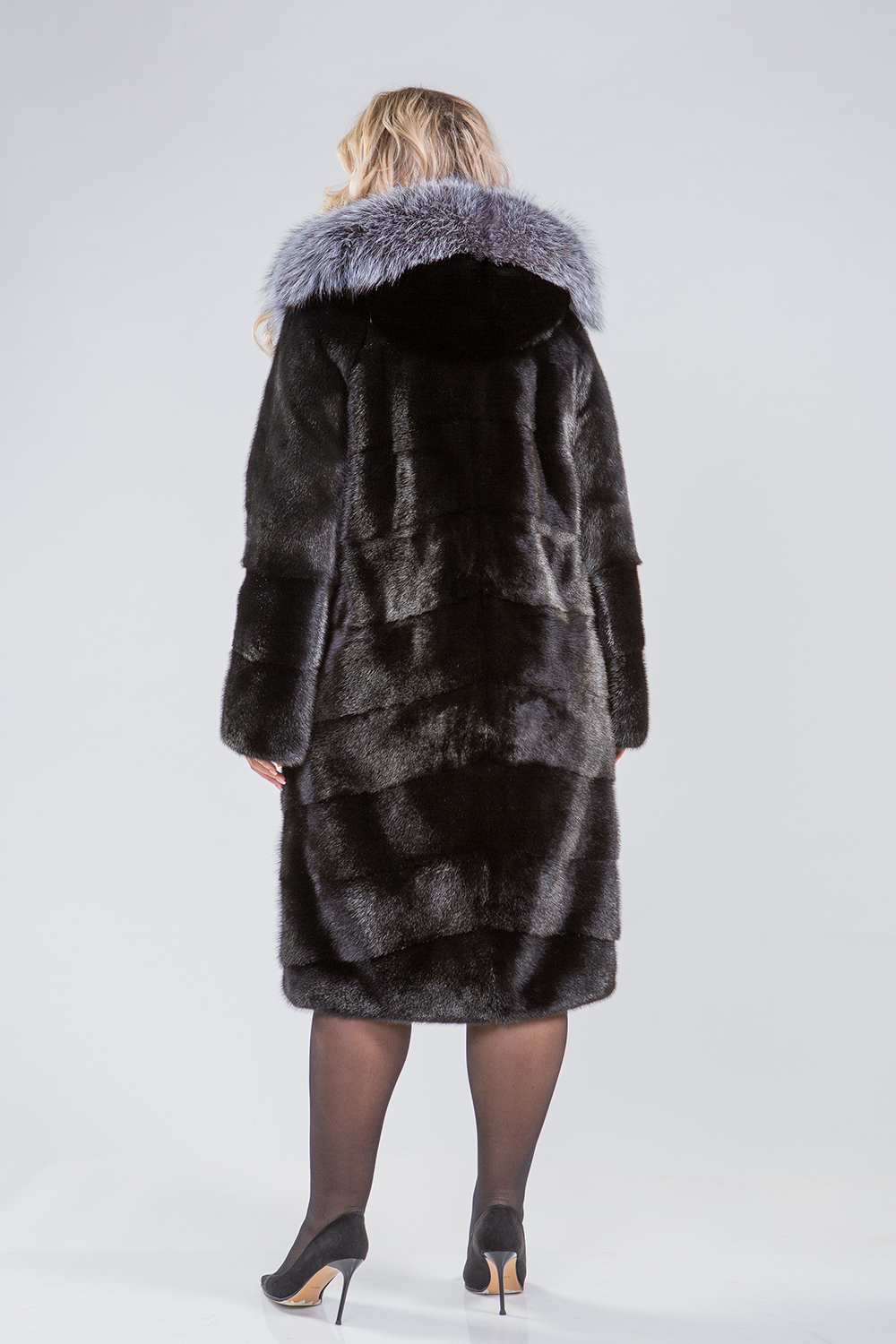 Полупальто из меха норки с капюшоном, украшенным чернобуркой лисой. Изделие выполнено в технике диагональной выкладки пластин. Для удобства на талии, рукавах и по низу предусмотрены регулирующие утяжки. Длина пальто составляет 110 см, а рукава можно сделать более укороченными.
