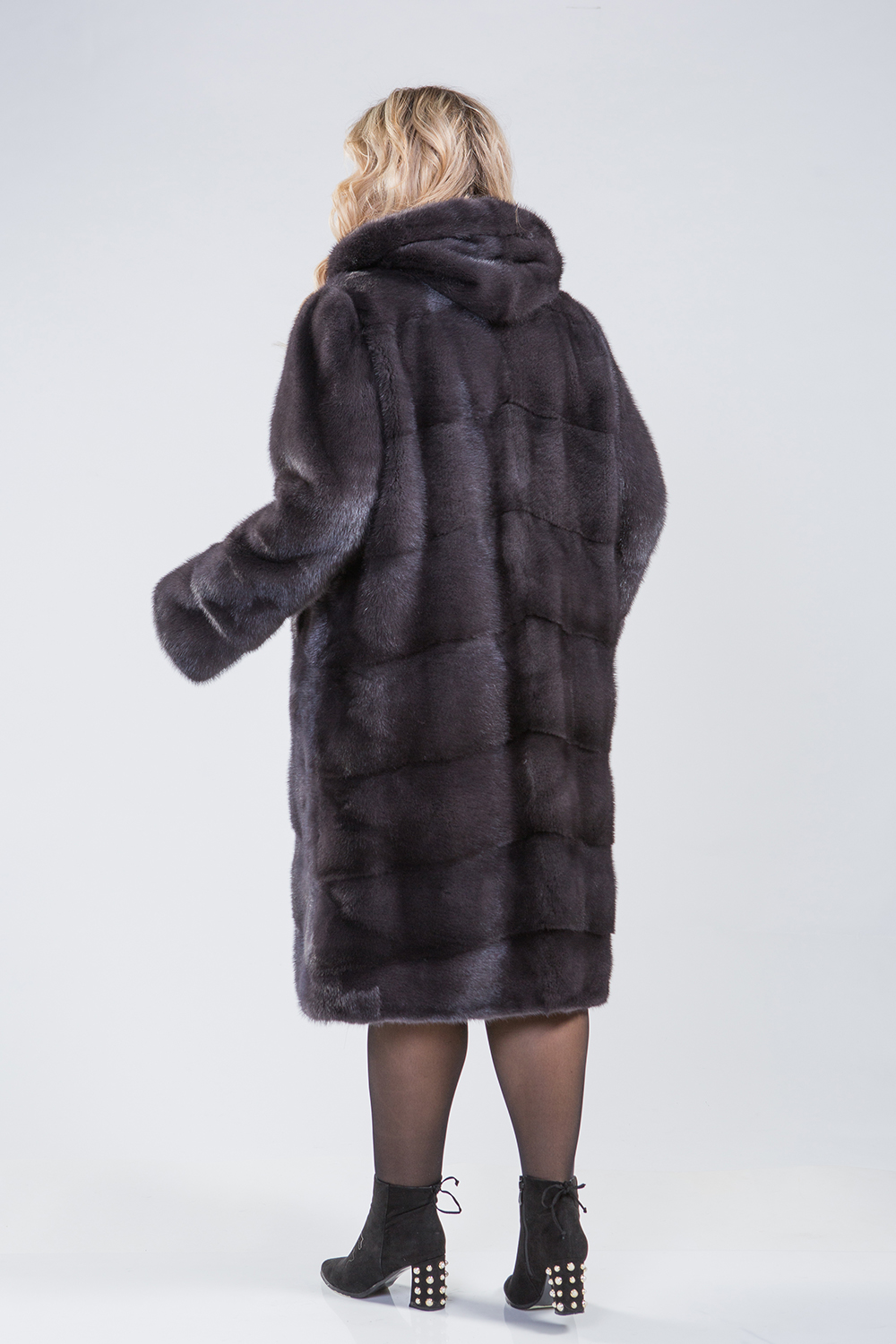 Полупальто из меха норки с капюшоном. Крой модели выполнен в виде диагонально расположенных пластин. Внутри, на талии и рукавах, имеются регулирующие утяжки, позволяющие создать идеальный силуэт. Длина изделия составляет 110 сантиметров. Особенность модели — возможность трансформировать рукава, делая их более укороченными.