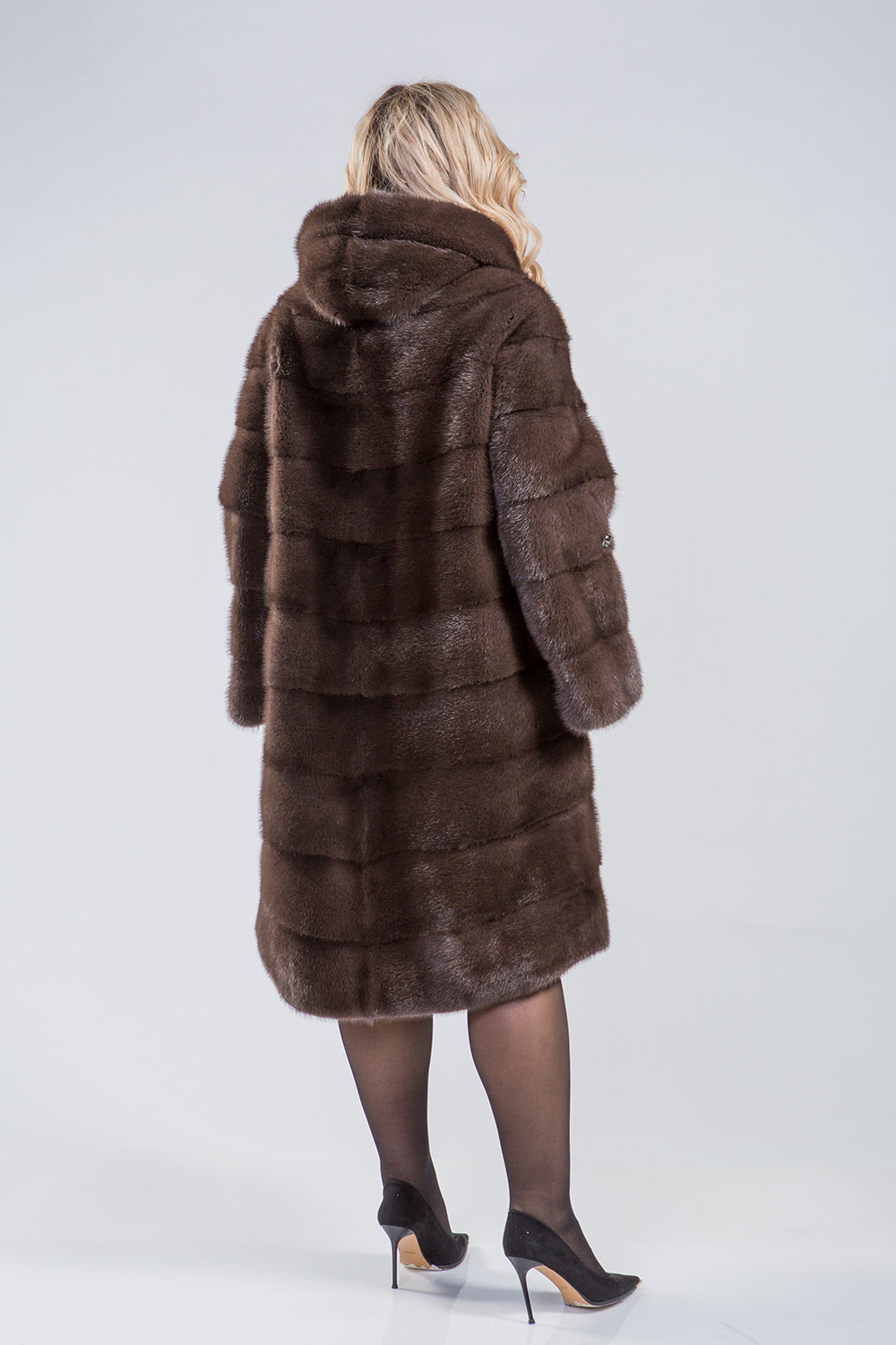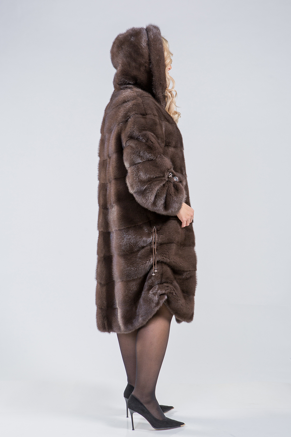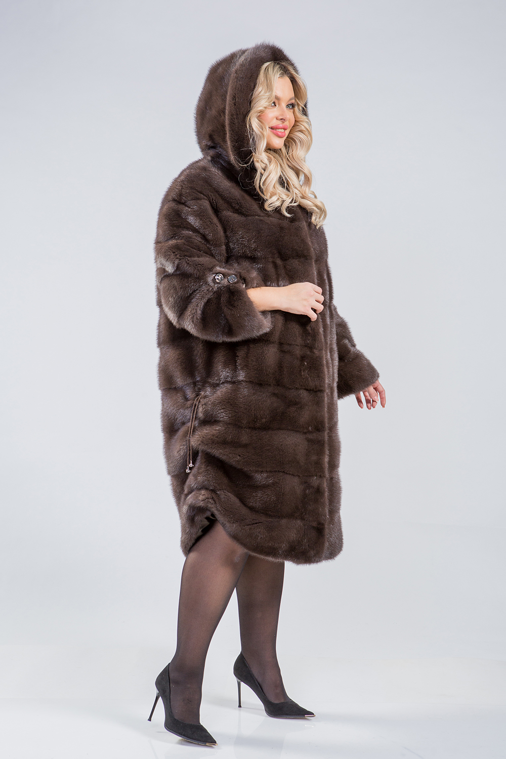 Полупальто из меха норки с капюшоном. Крой модели выполнен с легкой диагональной выкладкой пластин, что придаёт ей особый шарм. Рукава и низ полупальто оснащены регулирующими утяжками, которые позволяют легко трансформировать изделие в универсальный вариант. При желании вы можете распустить утяжки и получить классическую шубку! Длина изделия составляет 110 сантиметров. Эта оригинальная и эксклюзивная модель пользуется большой популярностью у наших прекрасных покупательниц!