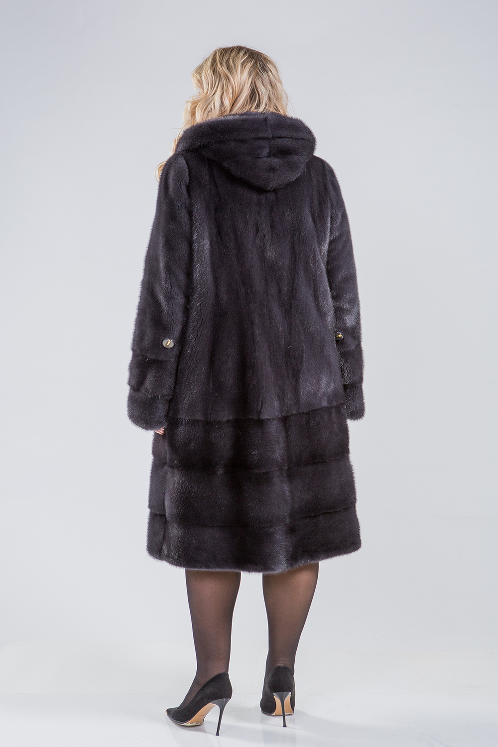 Полупальто из меха норки с капюшоном — это изделие комбинированного кроя, выполненное в технике «роспуск» для верхней части и с использованием поперечной выкладки пластин для низа. Модель дополнена регулируемыми утяжками на талии и рукавах, что позволяет создавать индивидуальный образ. Длина полупальто составляет 110 см, а рукава можно сделать более укороченными.