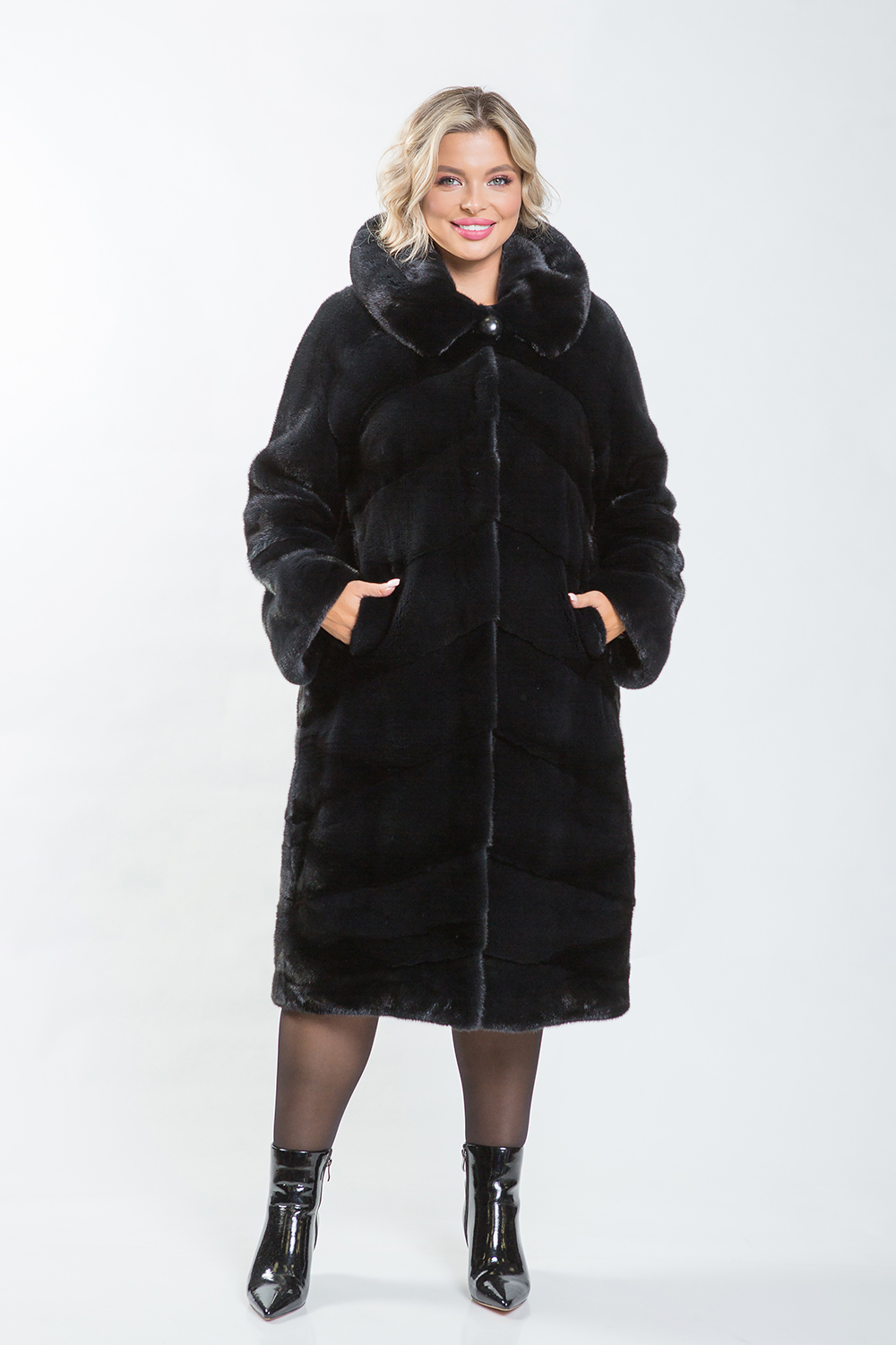 Эта шубка отличается стильным и современным фасоном, который скрадывает объем и скрывает все проблемные места. Она хорошо сочетается с разнообразной обувью — от грубых ботинок со шнуровкой до элегантных высоких сапог на каблуке или платформе.