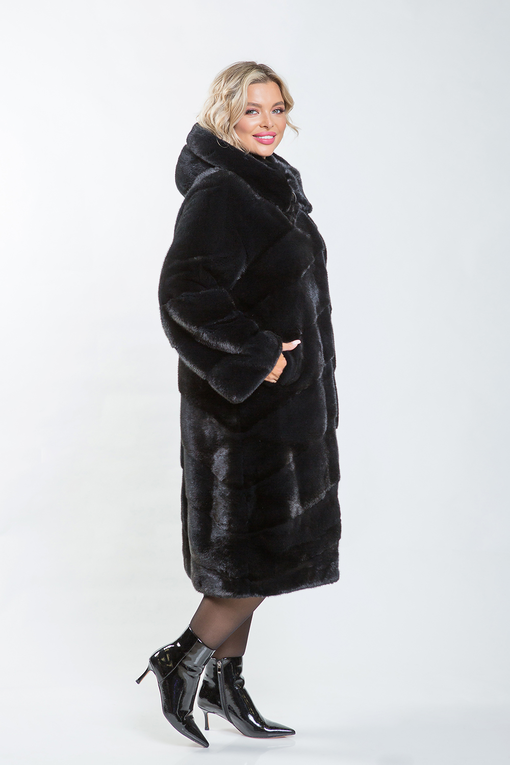 Полупальто из норки с капюшоном, выполненное в стиле диагональной выкладки пластин. На талии и рукавах модели предусмотрены регулирующие утяжки, что позволяет адаптировать изделие к особенностям фигуры. Длина полупальто составляет 110 см.