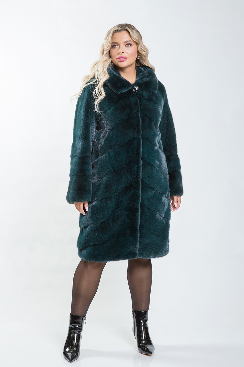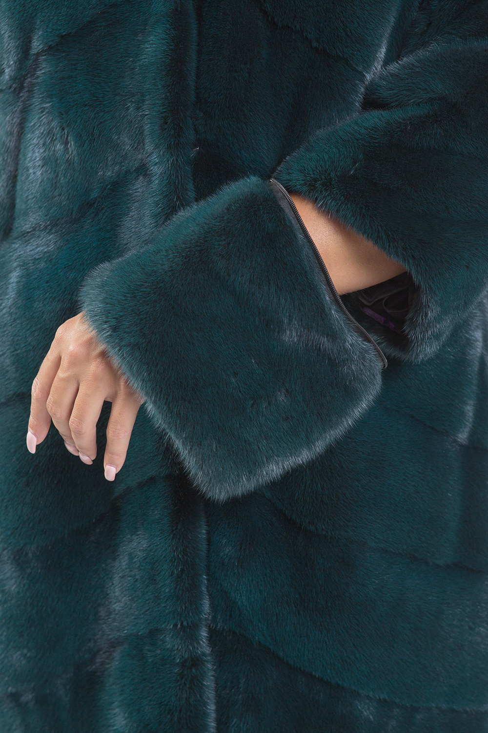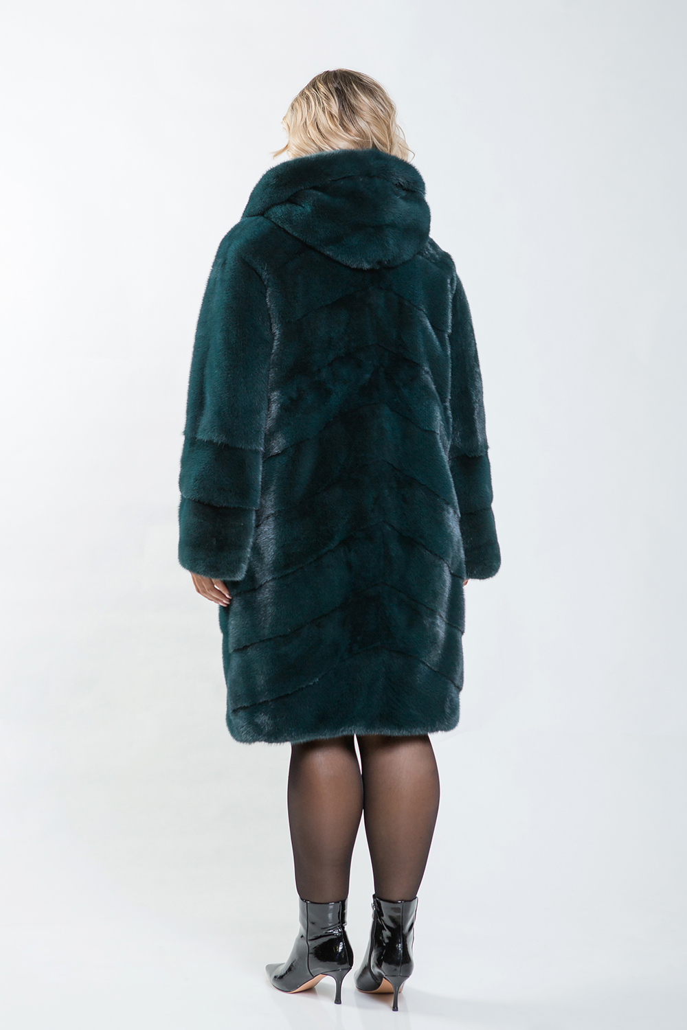 Норковое полупальто с капюшоном выполнено в виде диагональной раскладки пластин. Благодаря регулирующим утяжкам в трёх местах — на талии, на рукавах и по низу изделия — шубку можно легко адаптировать к особенностям вашей фигуры.
