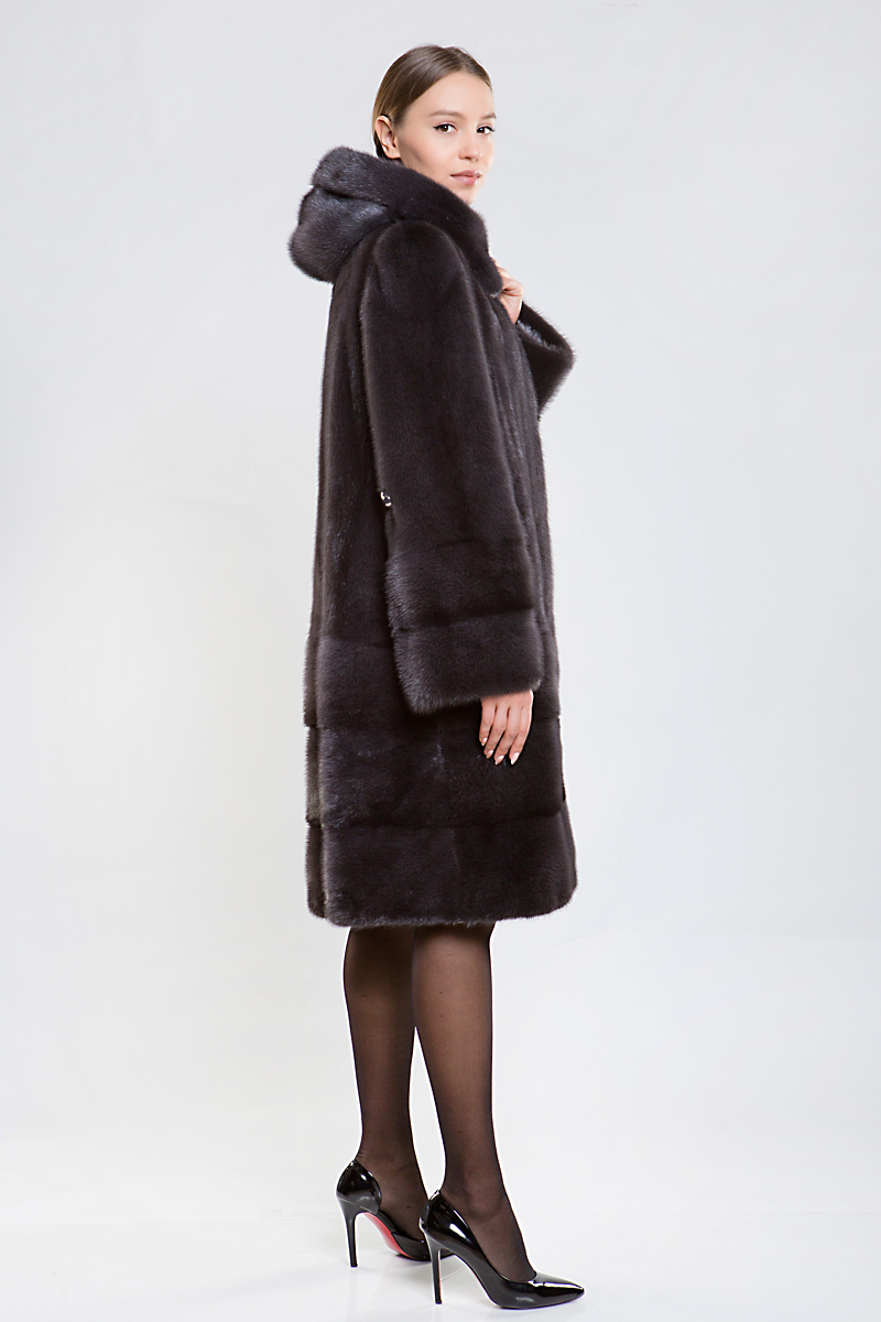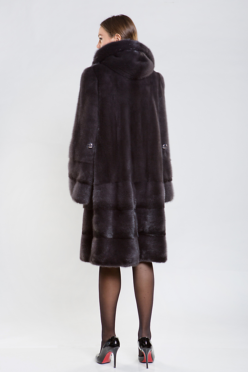 Полупальто из норкового меха с капюшоном. Крой комбинированный: верх модели выполнен в виде распущенного полотна, а низ — из поперечно выложенных пластин. Рукава можно трансформировать в укороченные. Длина изделия составляет 100 см. Шубка отлично садится на любую фигуру, обеспечивая элегантность и утонченность образа.