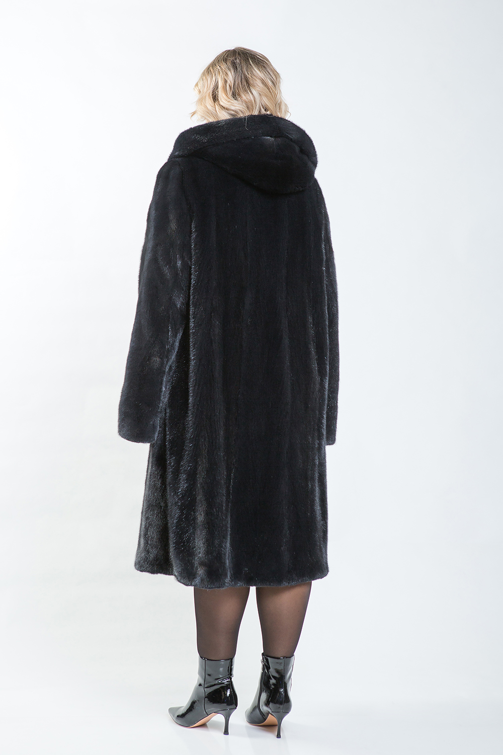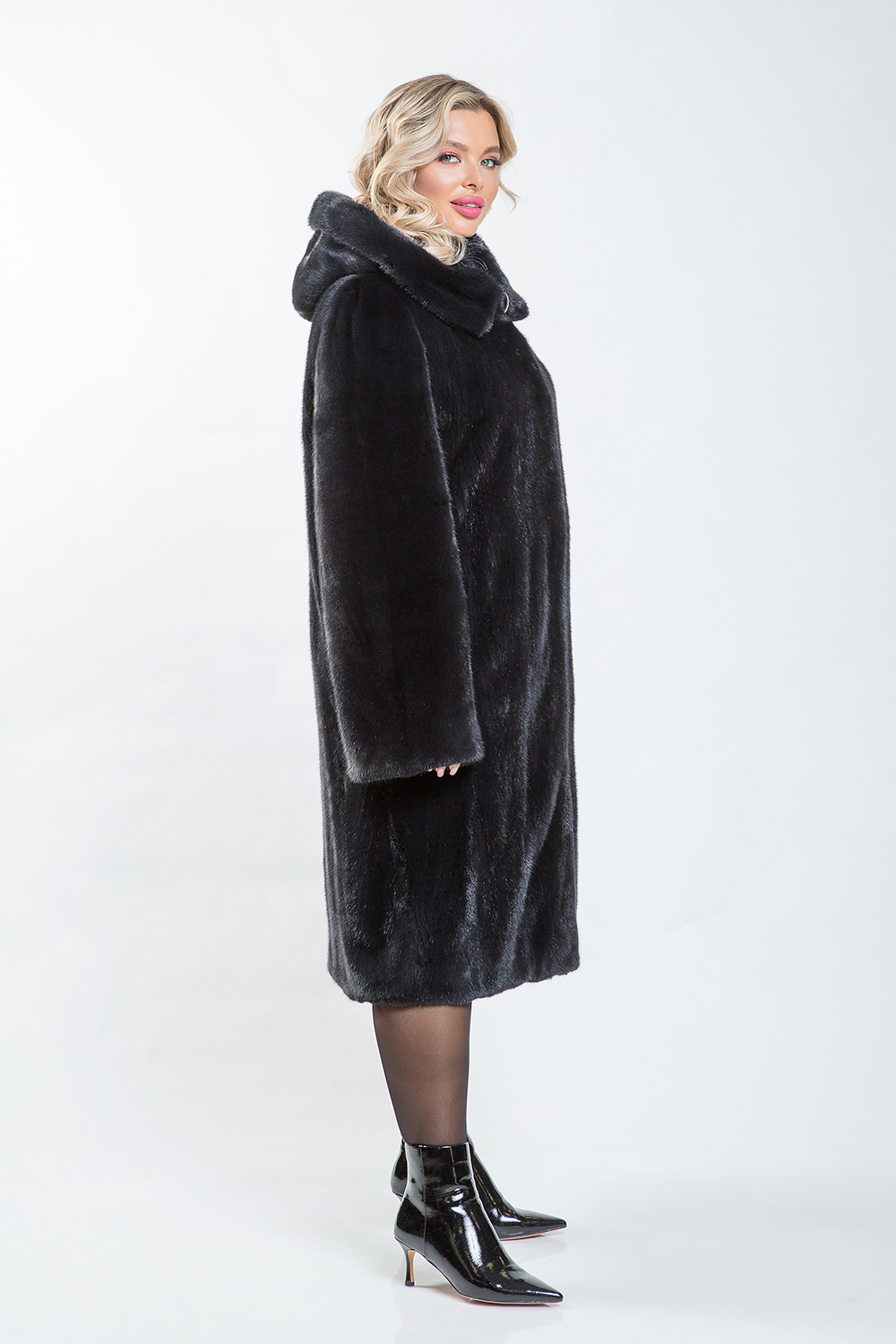 Норковое полупальто с капюшоном, выполненное в стиле «роспуск». Модель оснащена регулирующими утяжками на рукавах и талии, что позволяет добиться идеальной посадки. Длина изделия составляет 110 сантиметров, а слегка расклешенный низ придаёт шубке кокетливый вид.