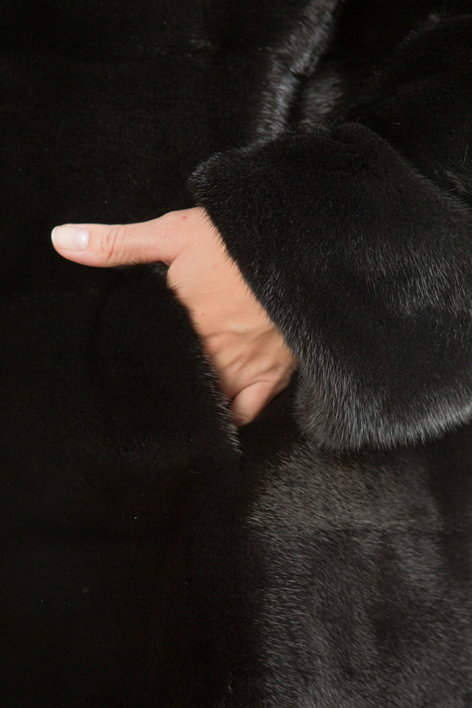 Полупальто из норки с капюшоном, выполненное в технике поперечной выкладки пластин. Длина изделия составляет 100 см. Рукава и низ шубы можно отстегнуть, что позволяет превратить её в миниатюрную и изящную курточку.