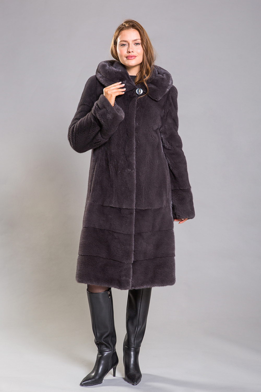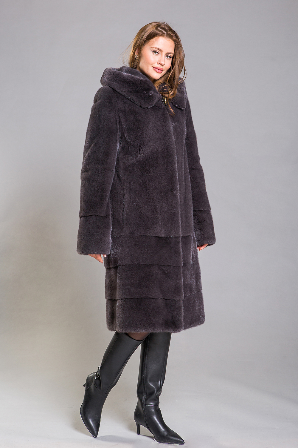 Полупальто из норки с капюшоном представляет собой модель комбинированного кроя, в которой верхняя часть выполнена в технике «роспуск», а низ — с помощью поперечной выкладки пластин. Для создания индивидуального образа предусмотрены регулируемые утяжки на талии. Длина полупальто составляет 110 см, а рукава можно сделать более укороченными. Благодаря удобному крою шубка обеспечивает максимальный комфорт, а благородный оттенок муссона придаёт образу безупречную гармонию.