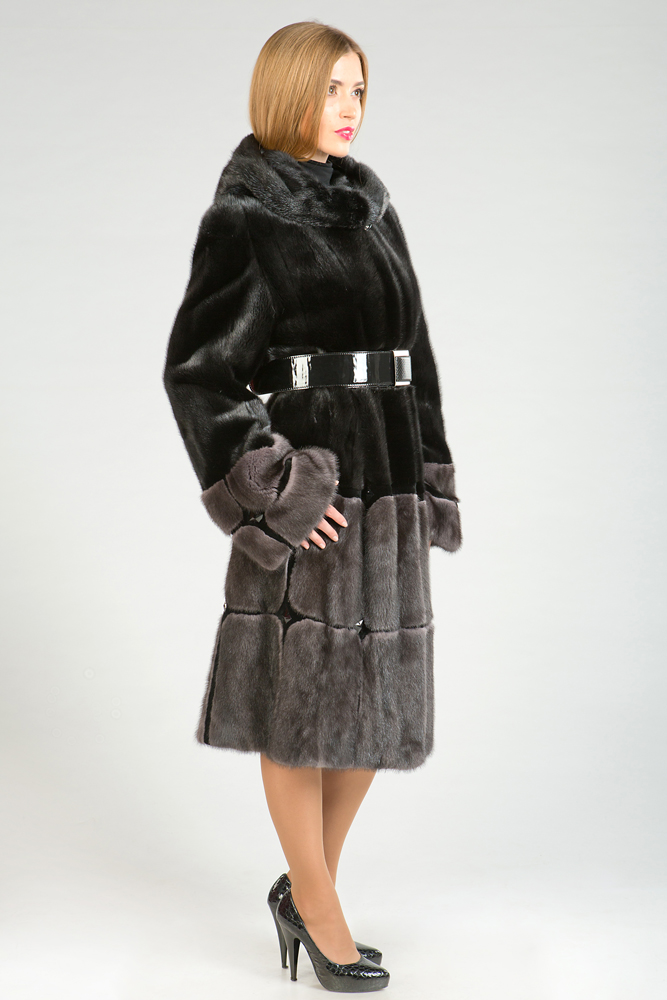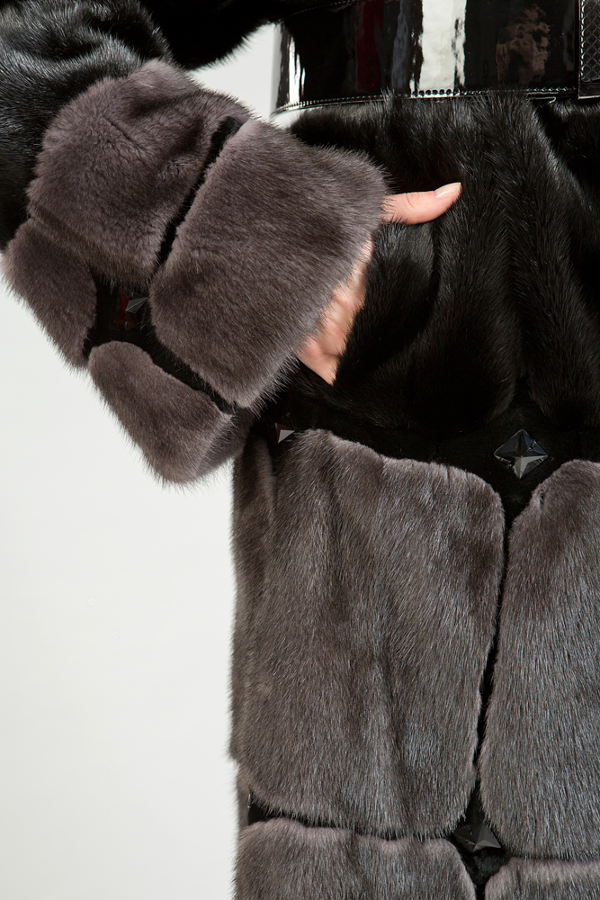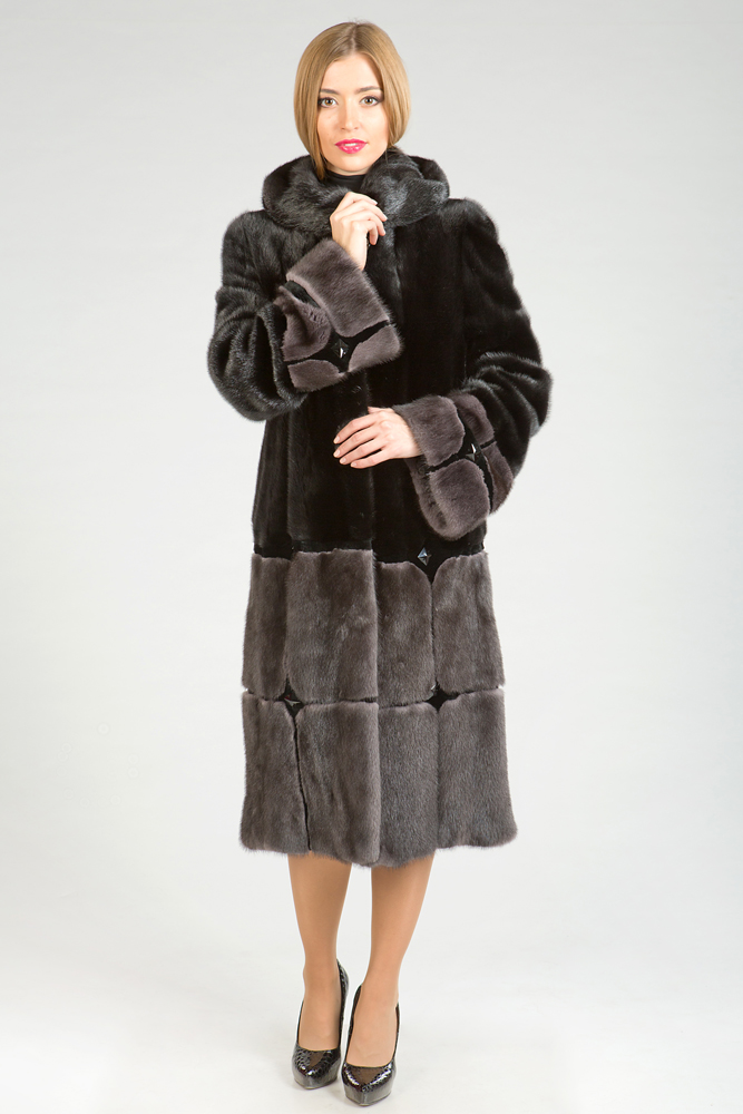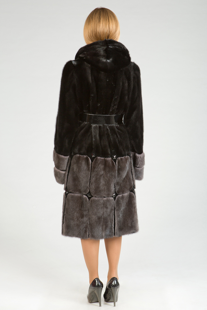 Полупальто из меха норки с капюшоном. Крой изделия комбинированный роспуск и пластины. Верх модели тонированная черная норка, выкладкой ворсом вверх. Рукава и низ изделия выполнены цветом муссон. Длина модели 105 см. Интересно и необычно смотрятся выстриженные геометрические линии на меховом полотне! Такая шубка способна подчеркнуть привлекательность дамы!