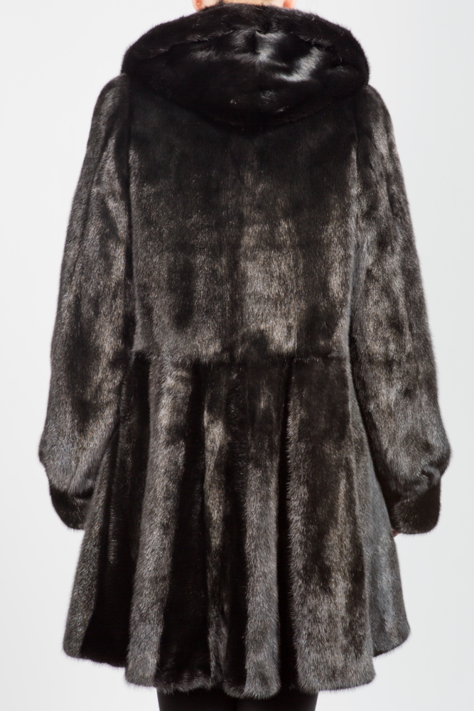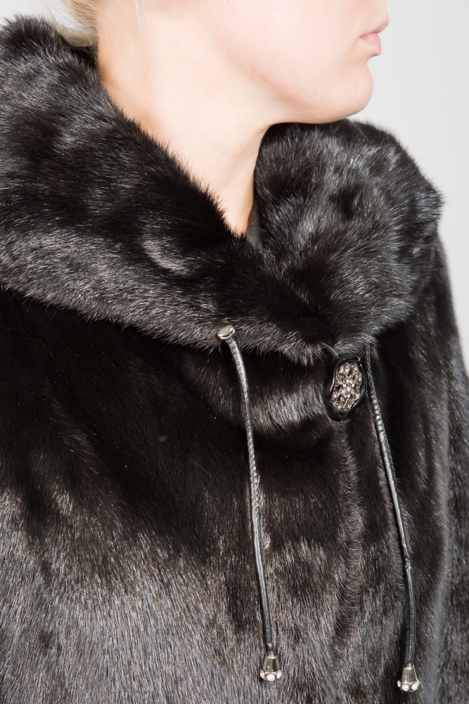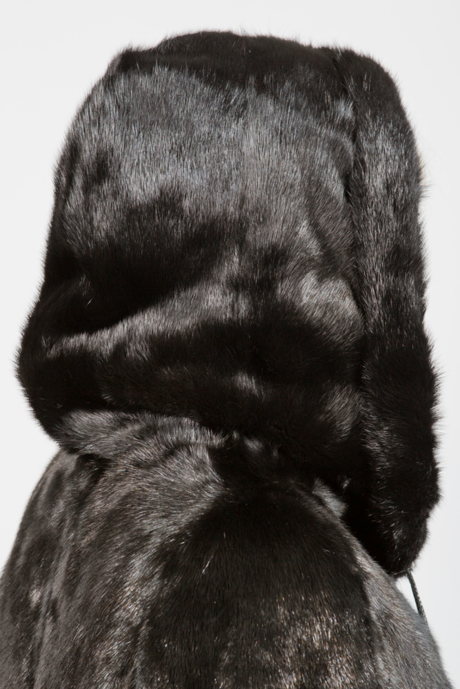 Полупальто из меха норки с капюшоном. Крой изделия роспуск с добавлением пластин. Модель оснащена утяжкой в зоне талии, позволяющая подчеркнуть стройность фигуры. Длина изделия 90 см. Благородный черный цвет меха предоставляет неограниченные возможности для любительниц экспериментов!