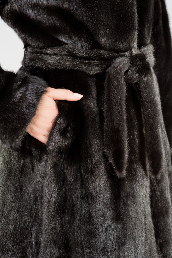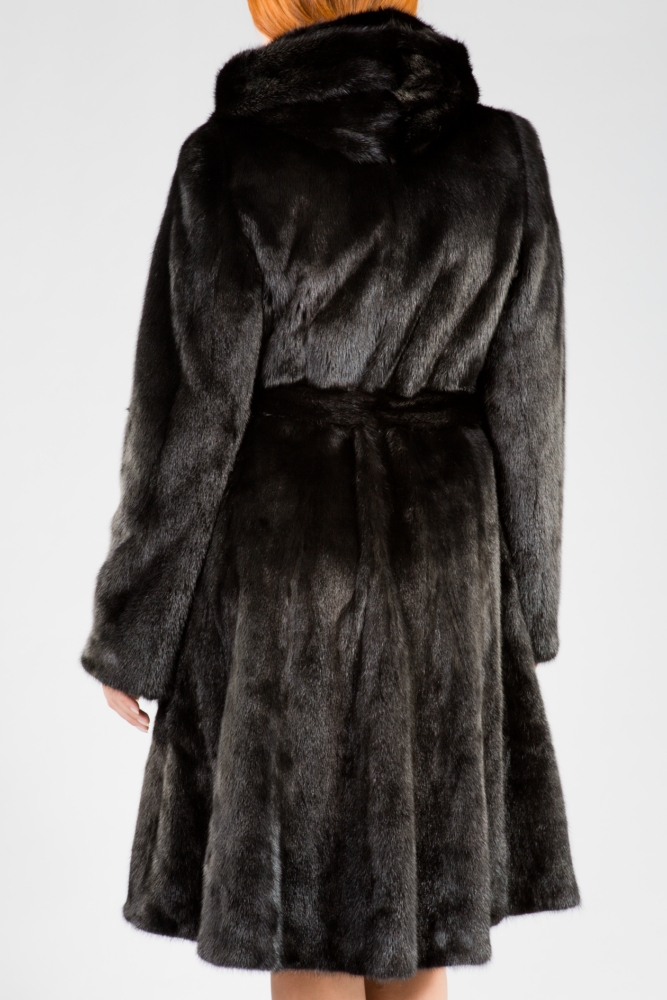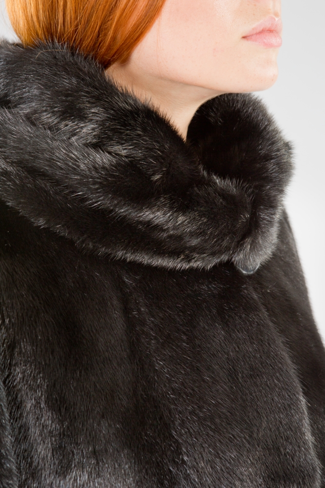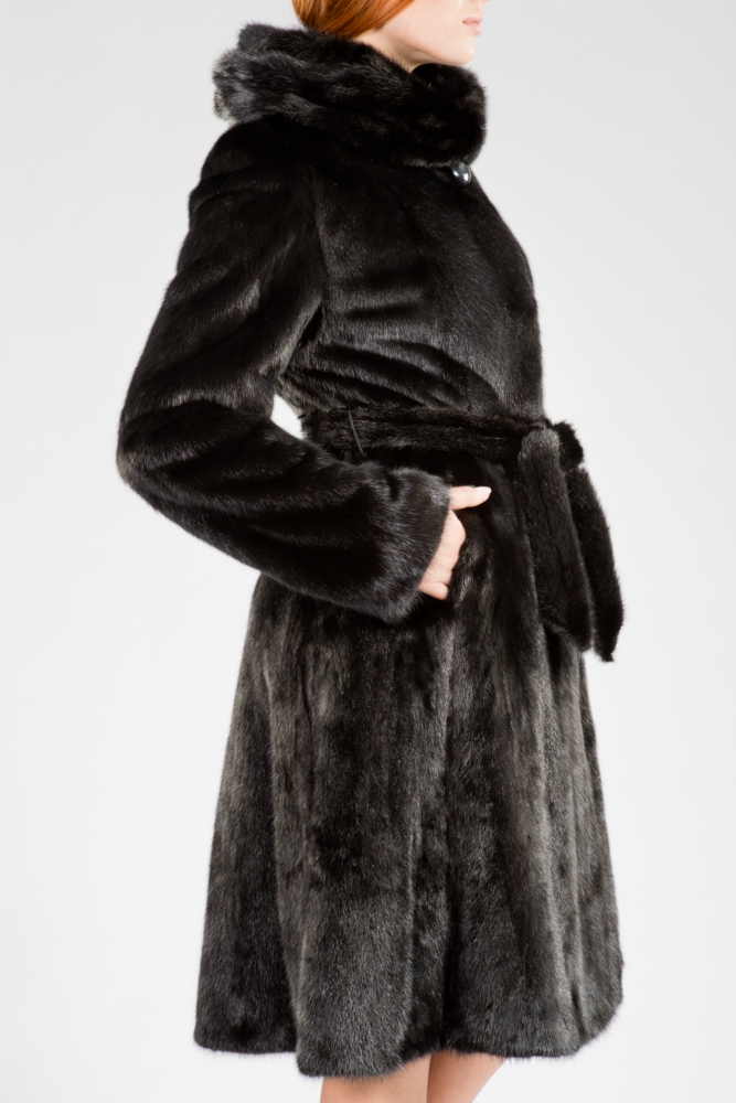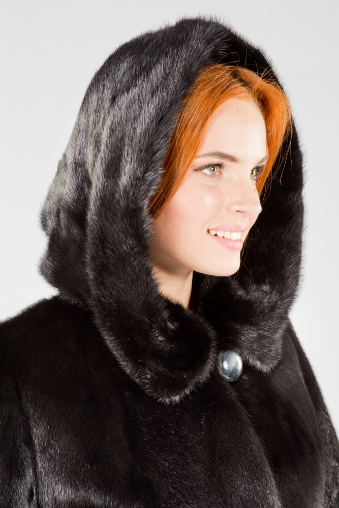 Полупальто из меха норки с капюшоном. Крой модели роспуск с добавлением пластин. На рукавах изделия есть регулирующие утяжки. Длина модели 105 см. Шубка слегка расклешена и дополнена поясом, позволяющим подчеркнуть стройность фигуры. Благородный черный цвет меха предоставляет неограниченные возможности для любительниц экспериментов, регулярных изменений стиля!
