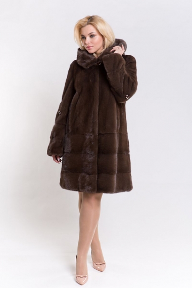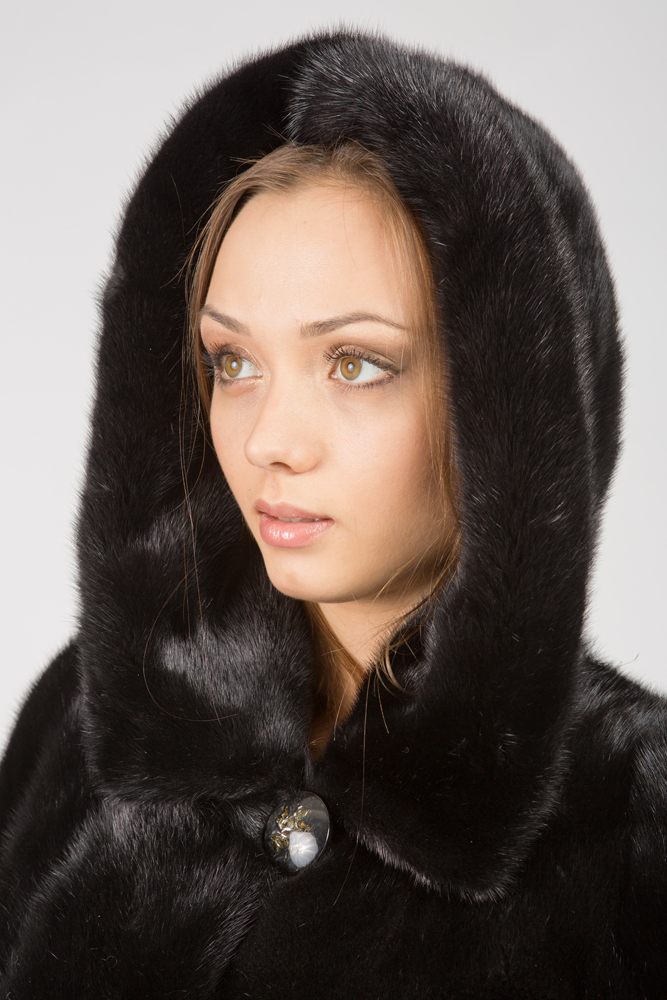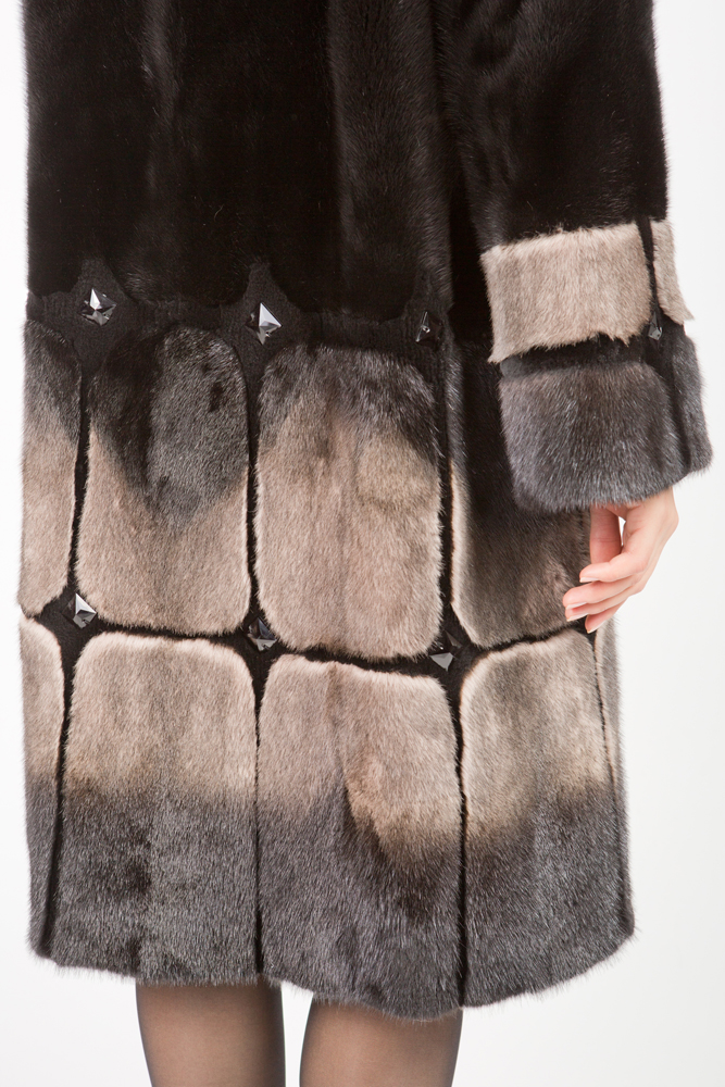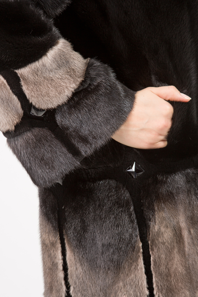 Полупальто из меха норки с капюшоном. Крой изделия комбинированный роспуск и пластины. Верх модели тонированная черная норка, выкладкой ворсом вверх. Рукава и низ изделия выполнены коричневым цветом. Длина модели 105 см. Интересно и необычно смотрятся выстриженные геометрические линии на меховом полотне! Такая шубка способна подчеркнуть привлекательность дамы!