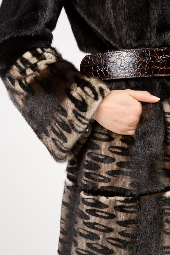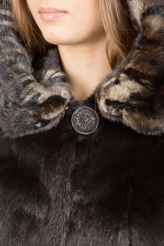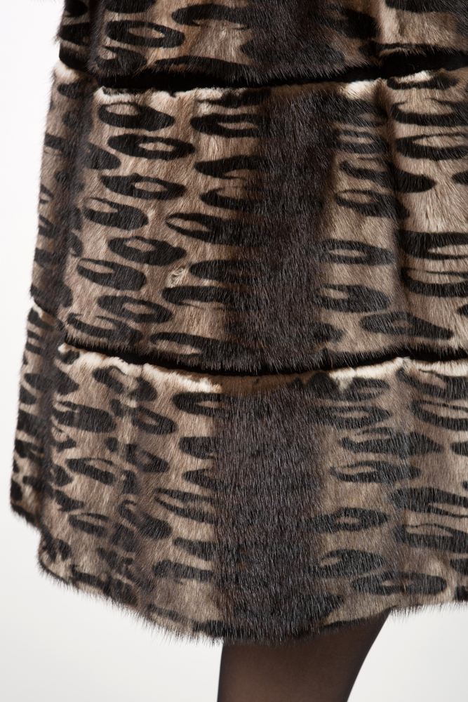 Полупальто из меха норки. Модель приталенная с капюшоном. Крой изделия - роспуск, по низу - поперечная выкладка пластин. Изделие декорировано трафаретным рисунком.