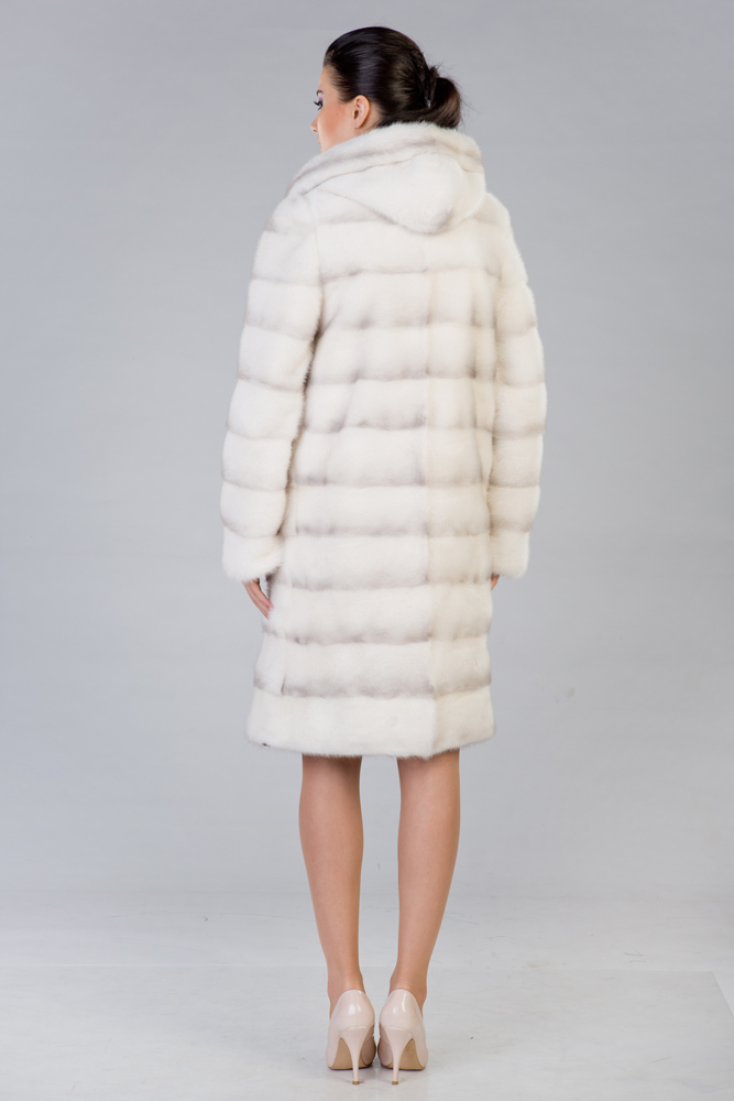 Полупальто из меха норки с капюшоном. Прямой классический силуэт. Крой изделия поперечная выкладка пластин. Внутри на талии и на рукавах модели есть регулирующие утяжки. Рукава шубки трансформируются в более укороченные. Такая белоснежная и теплая шубка согреет вас в морозные деньки!