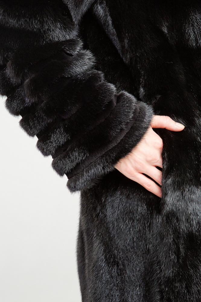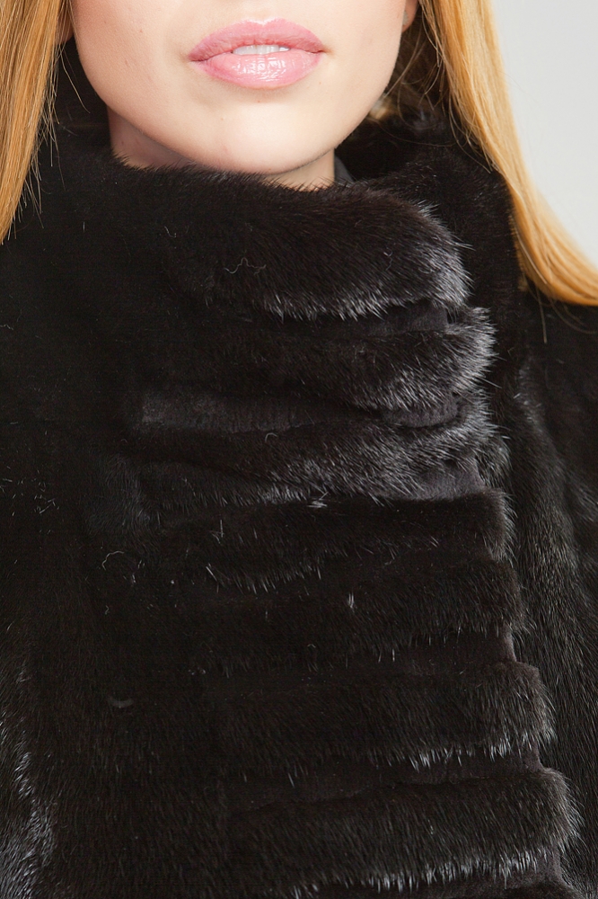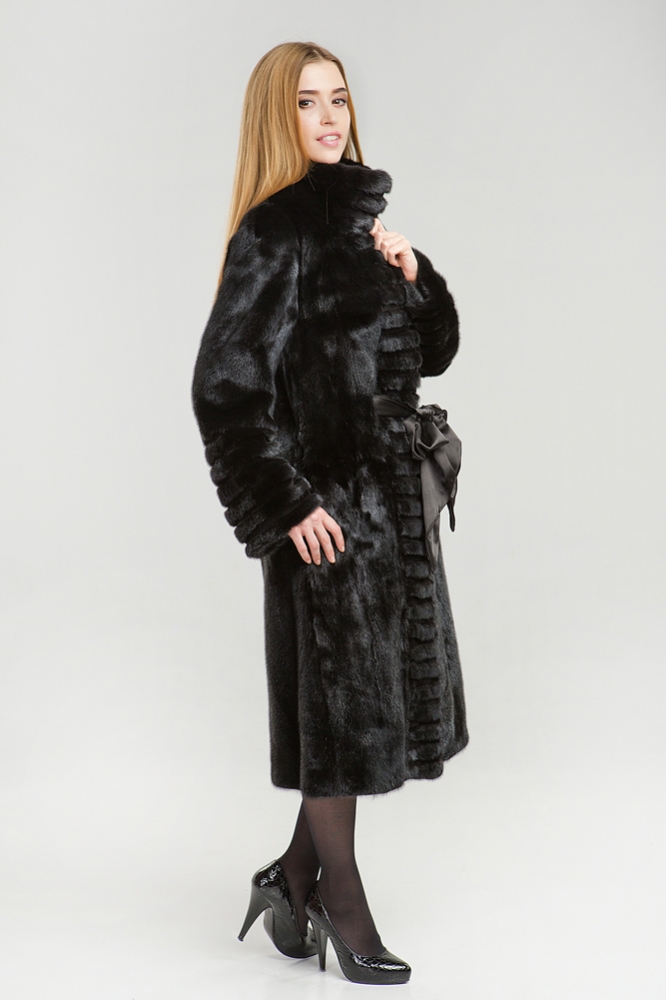 Полупальто из меха норки. Воротник элегантная стойка. Крой изделия пластины. Модель декорирована поперечной выстрижкой меха и атласной лентой. Длина изделия 110 см. Удачный крой шубки обеспечит максимальный комфорт, благородный тон черного меха гарантирует образу безупречную гармонию!