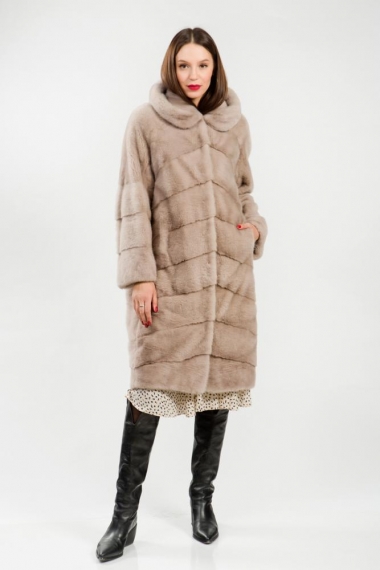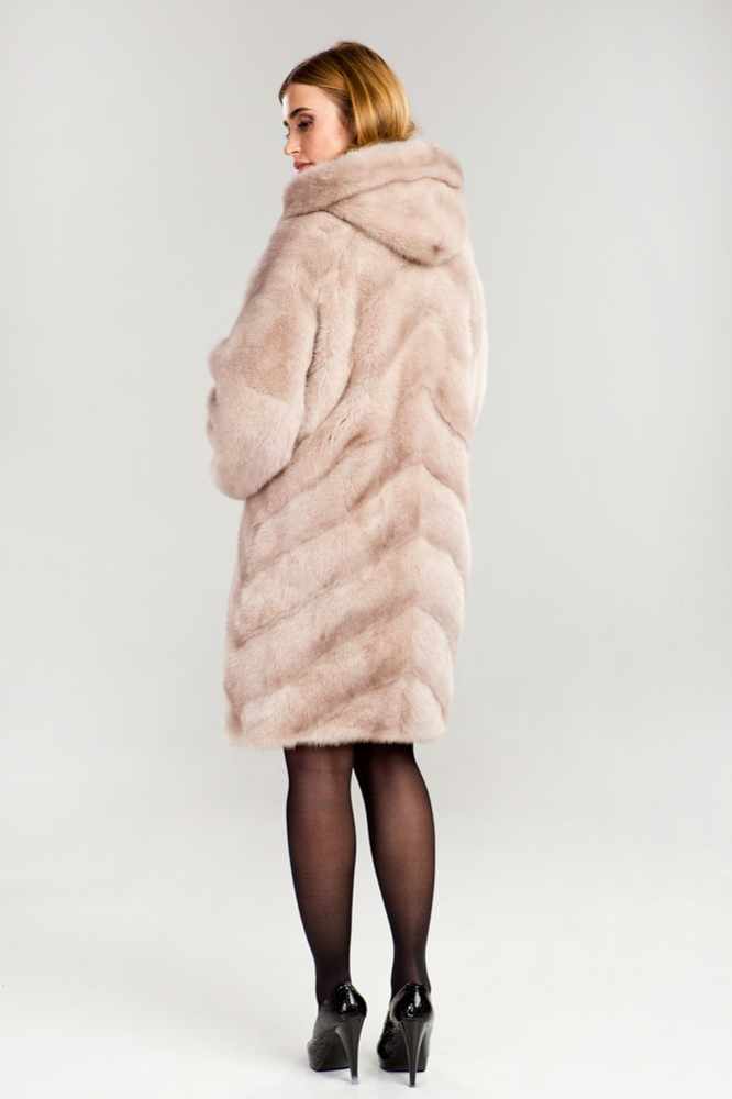 Полупальто из меха норки с капюшоном. Крой изделия - диагональная выкладка пластин. Модель оснащена регулирующими утяжками на рукавах, по низу изделия и в зоне талии. Длина шубки 100 см.