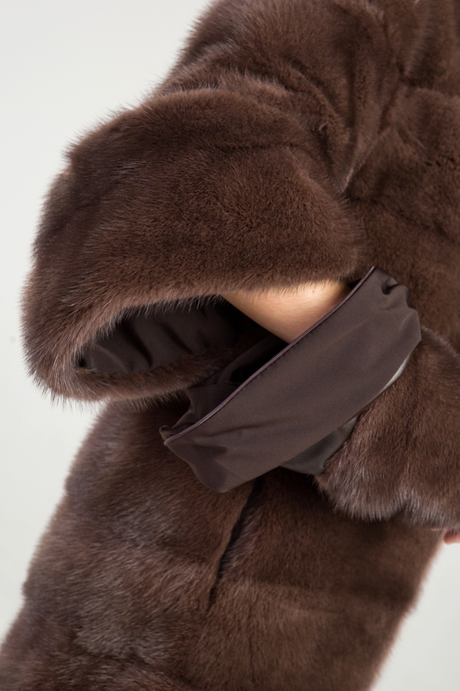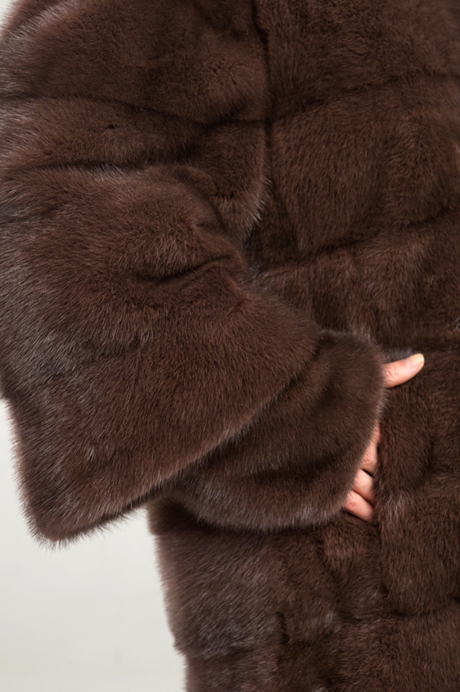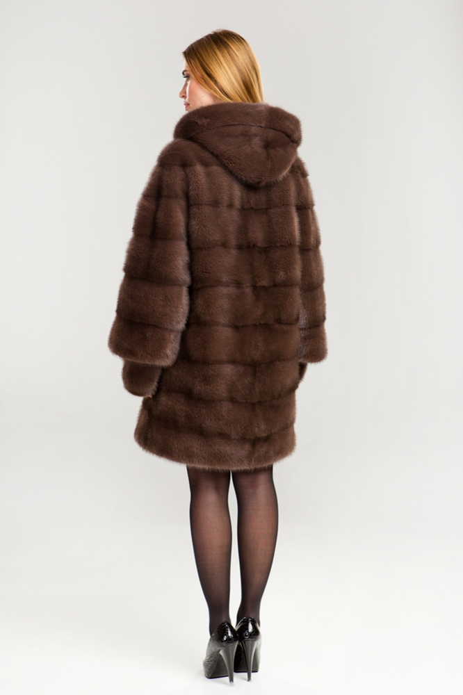 Полупальто из меха норки с капюшоном. Крой изделия - поперечная выкладка пластин. Рукав модели трансформируется в более укороченный. Длина изделия 100 см. Шубка легкая и уютная, в ней удобно ездить за рулем, она не стесняет движений и хорошо пропускает воздух!
