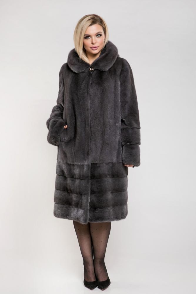 Полупальто из меха норки с капюшоном. Крой изделия комбинированный. Верх модели сшит в роспуск, а низ поперечная выкладка пластин. Рукава изделия трансформируются в более укороченные. Такая шубка подходит для создания любого образа, и не требует ярких дополнений.