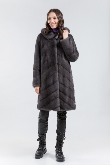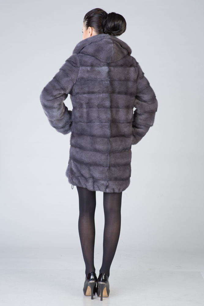 Полупальто из меха норки с капюшоном. Прямой классический силуэт. На талии, рукавах и по низу изделия кулиска. Крой- поперечная выкладка пластин. Рукава шубки трансформируются в более укороченные.