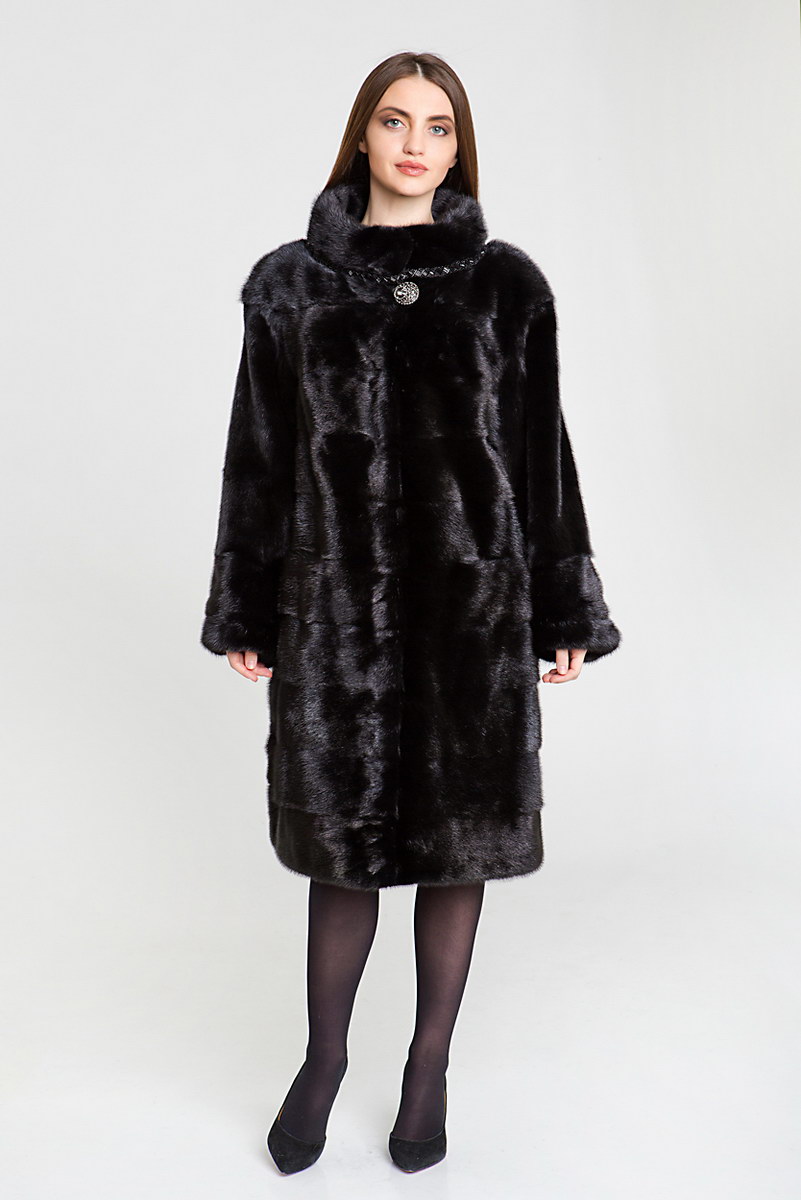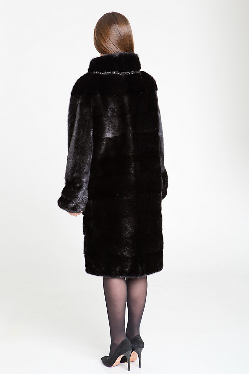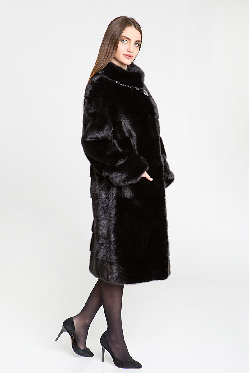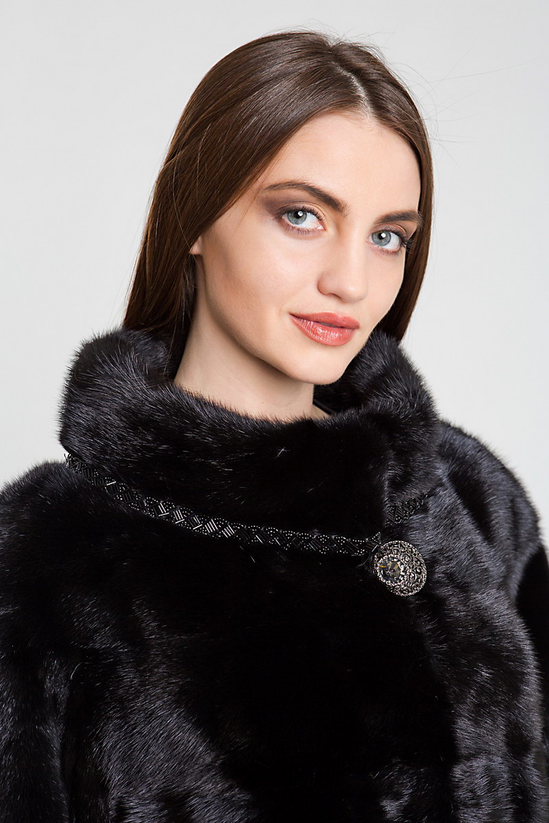 Полупальто из меха норки. Крой изделия - поперечная выкладка пластин. Воротник стойка, украшен стеклярусами. Такая оригинальная модель добавит солидность всем представительницам прекрасного пола и подчеркнет статус успешной женщины. Лаконичный дизайн модели напоминает стиль Шанель.