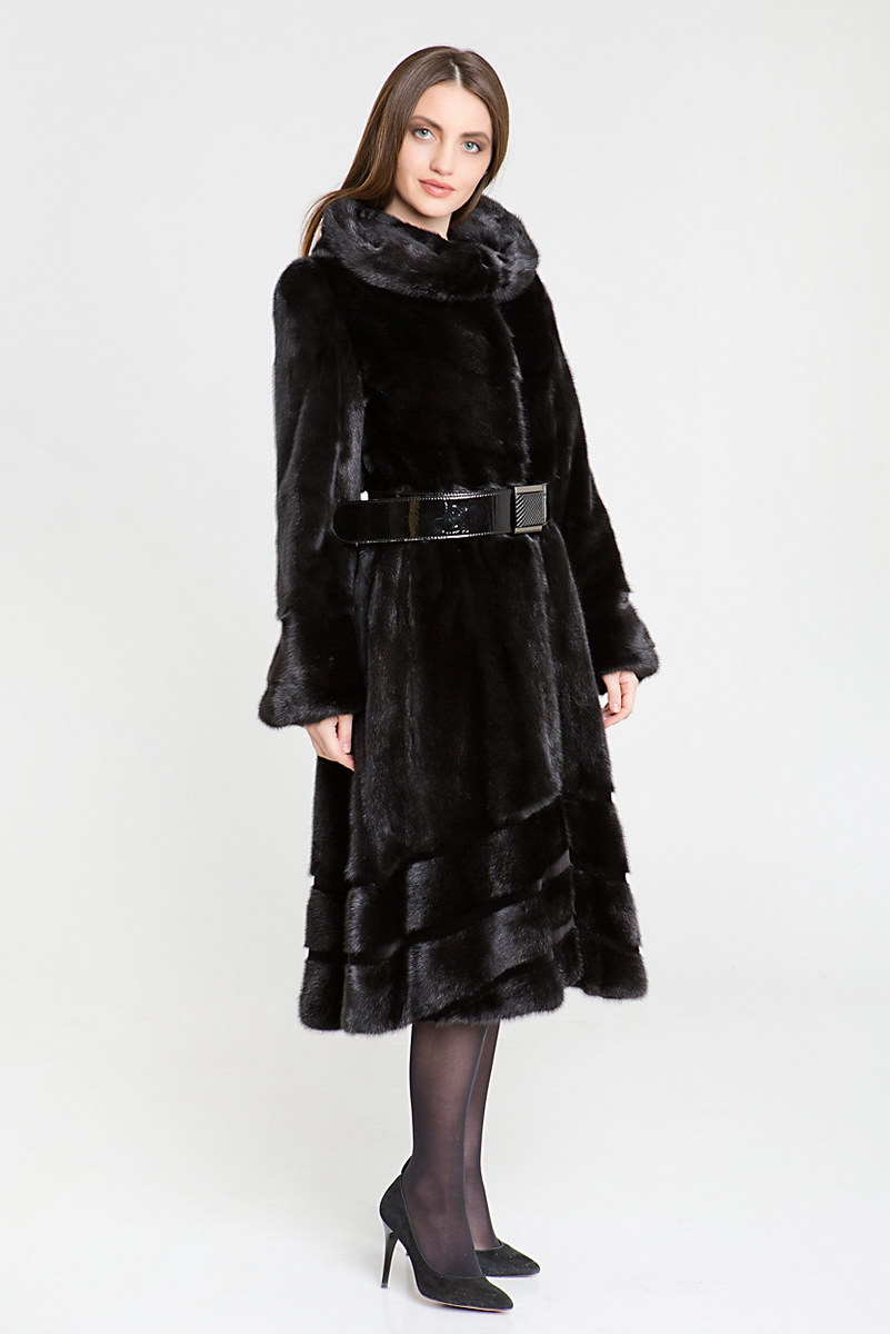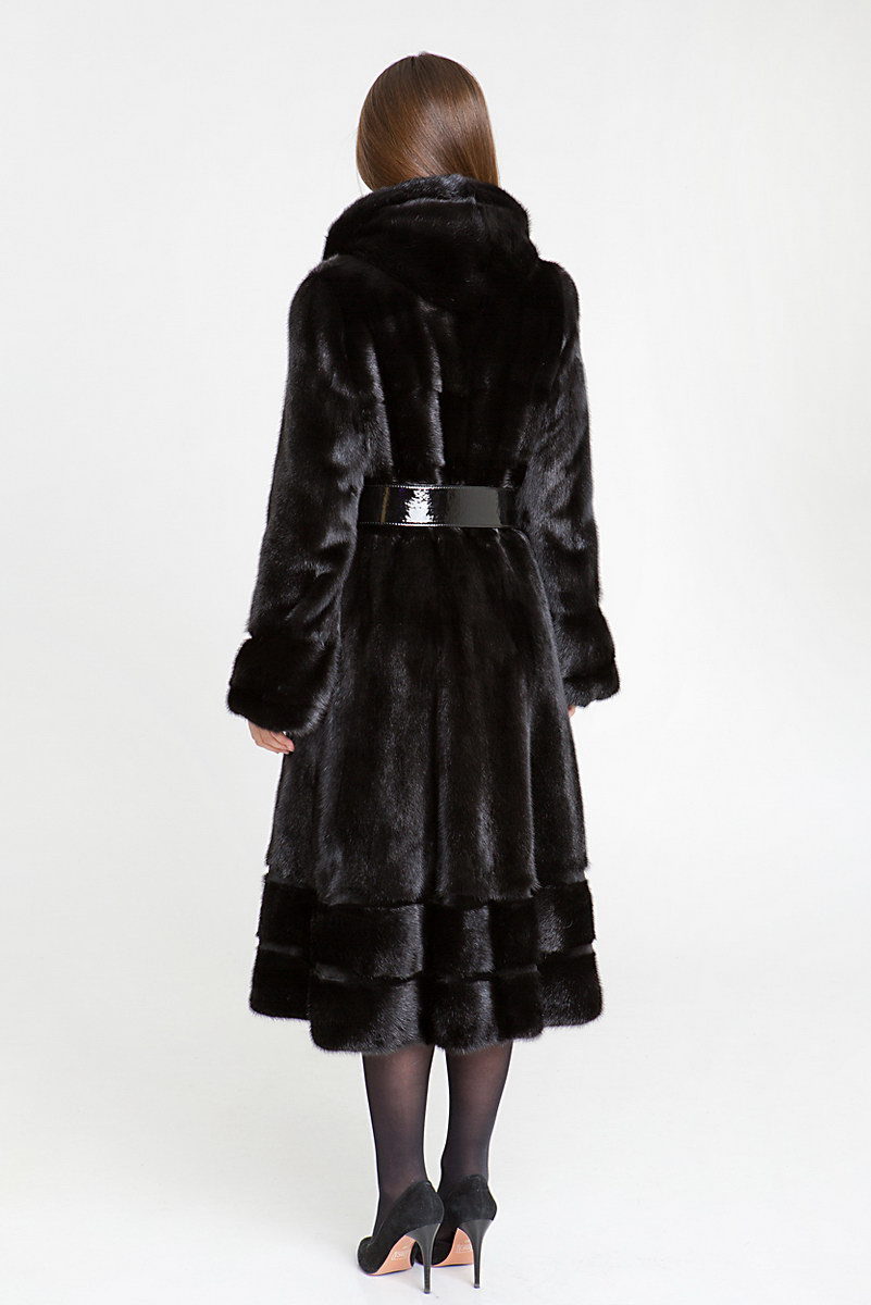 Полупальто из меха норки с капюшоном. Крой изделия в роспуск. Очень интересно смотрятся выстриженные геометрические линии на нижней части изделия. Яркий блеск меха и волнительный покрой этой шубки достойны щедрых комплиментов в свой адрес!