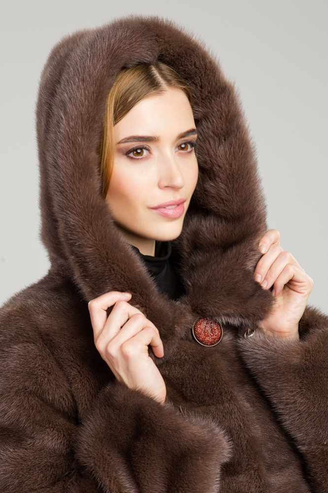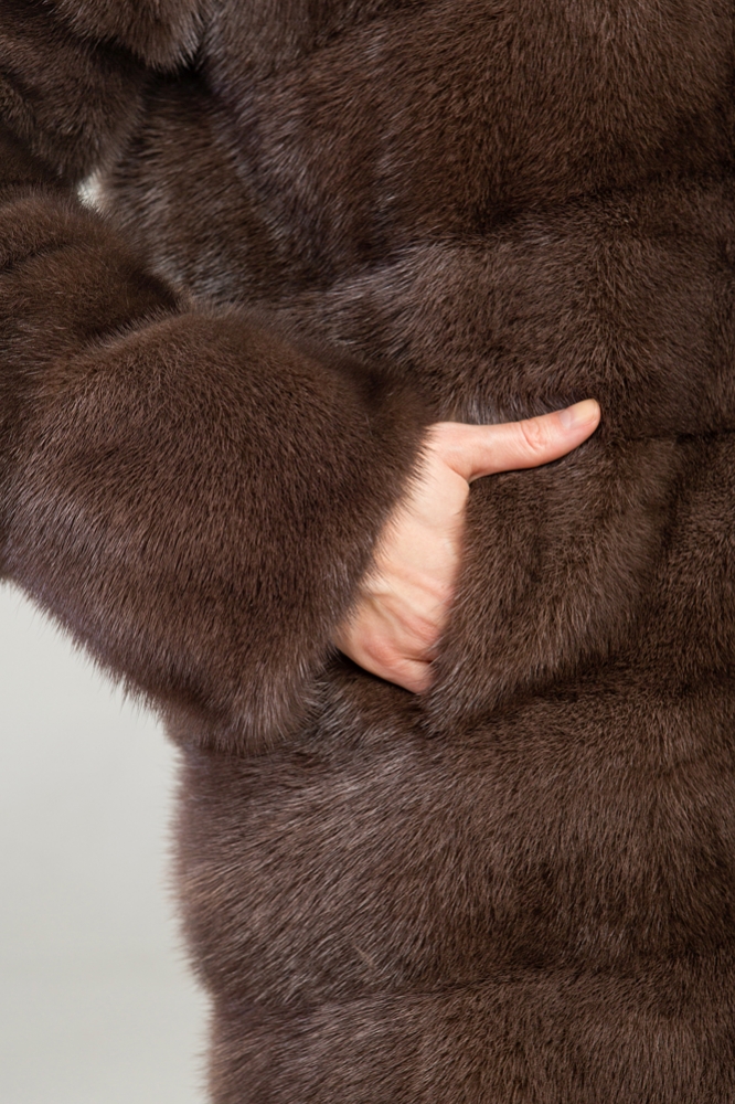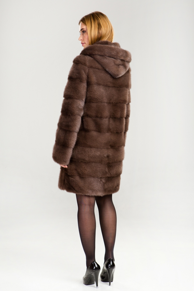 Полупальто из меха норки с капюшоном. Крой изделия - поперечная выкладка пластин. Рукава модели отстегиваются, трансформируются в более укороченные. Длина изделия 100 см. Модель оснащена регулирующими утяжками на рукавах, по низу изделия и в зоне талии.