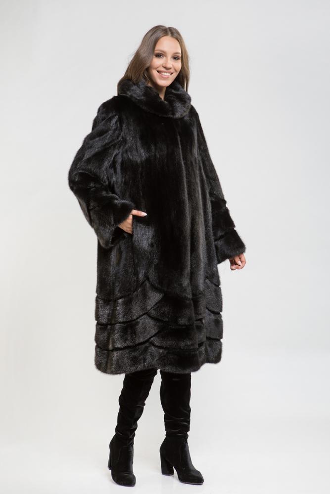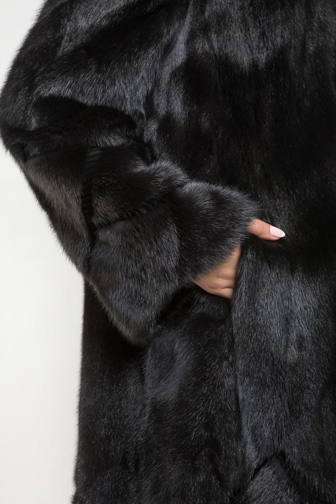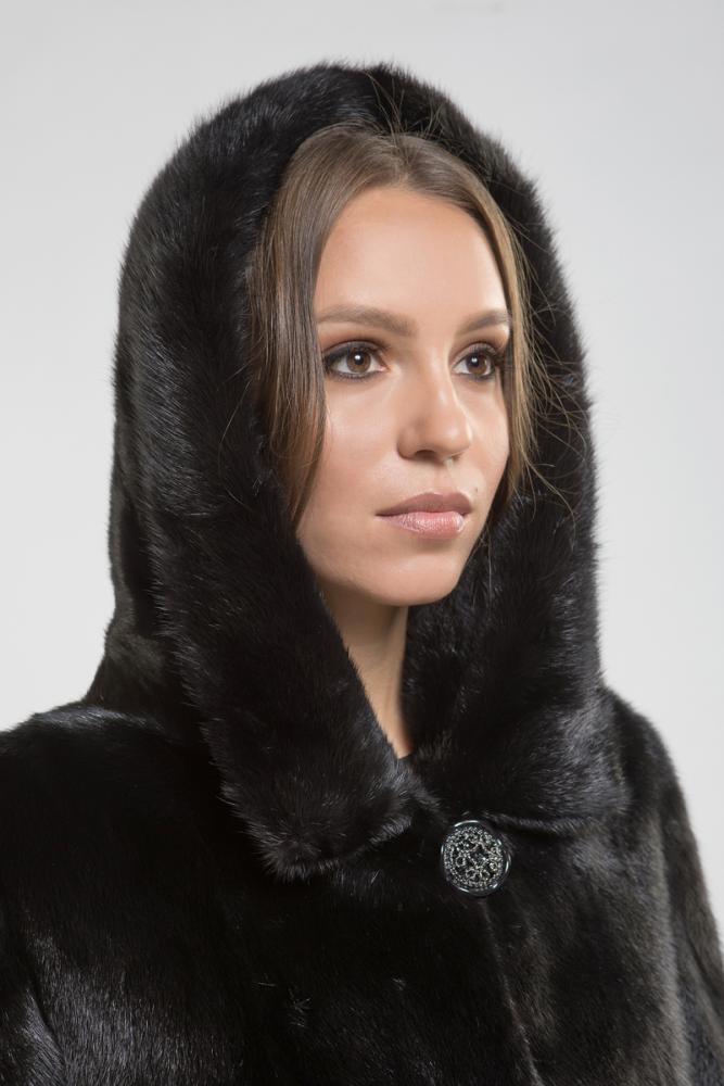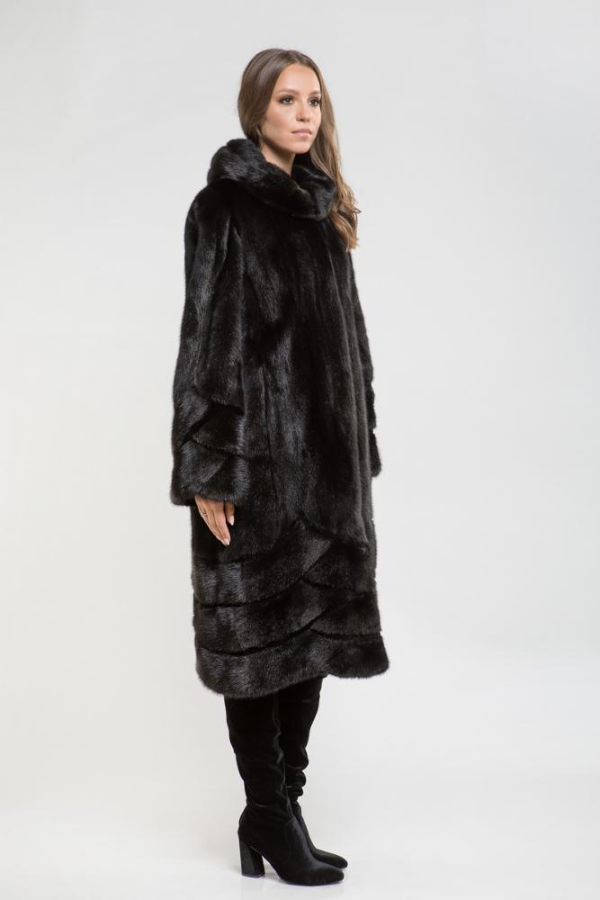 Полупальто из меха норки с капюшоном. Крой изделия - пластины с добавлением роспуска. Необычно и интересно смотрятся выстриженные геометрические линии на меховом полотне по низу шубки и на рукавах!