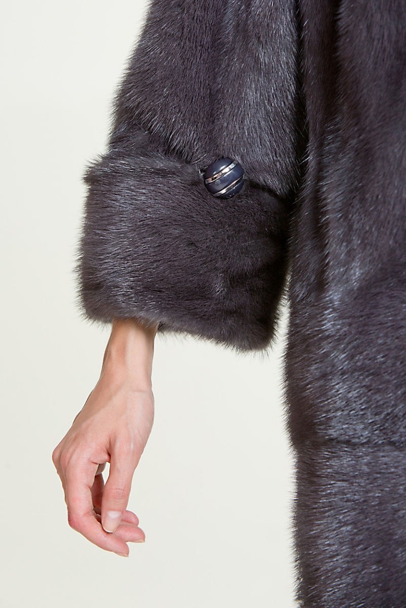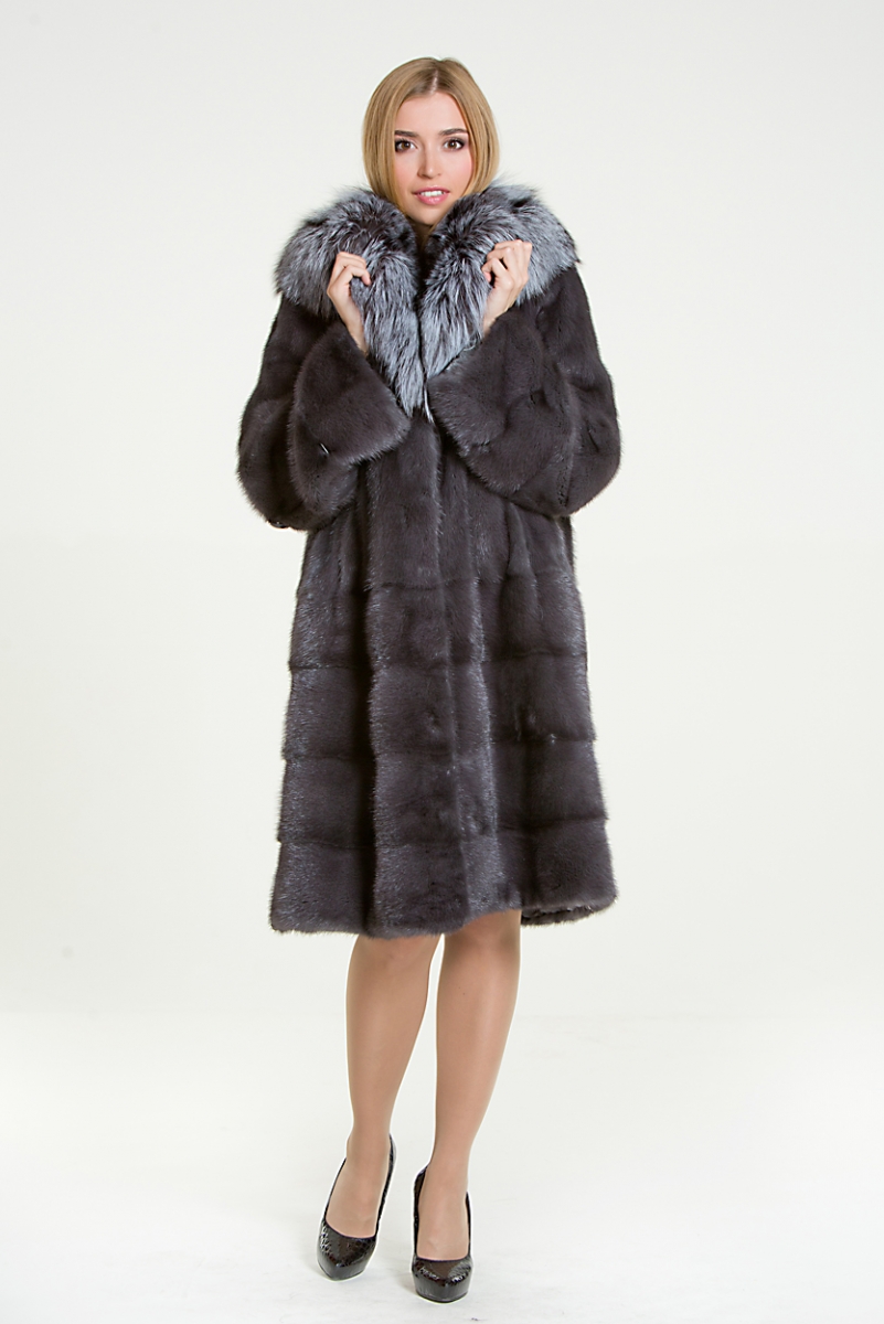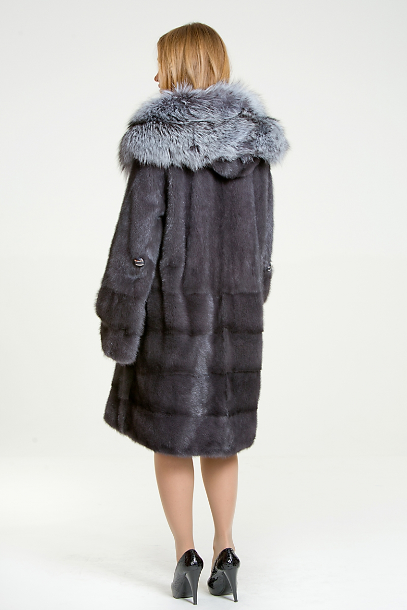 Полупальто из меха норки. Капюшон изделия дополнен мехом чернобурой лисы. По низу модели поперечная выкладка пластин. Длина изделия 100 см. Рукав модели трансформируется в более укороченный.