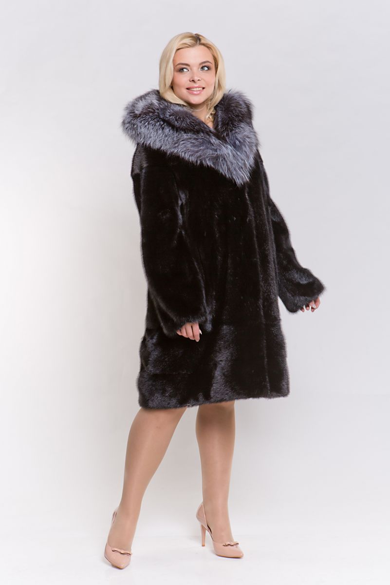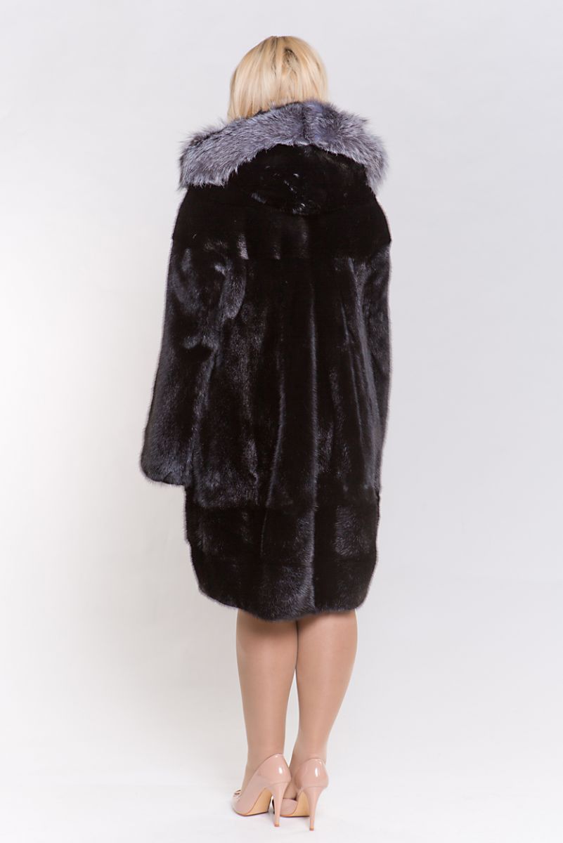 Полупальто из меха норки. Капюшон модели комбинирован мехом чернобурой лисы. Верх изделия сшит в роспуск. Низ модели присобран, крой поперечная выкладка пластин. Длина изделия 100 см. Благородный блеск меха придает шубке оригинальность и выразительность!