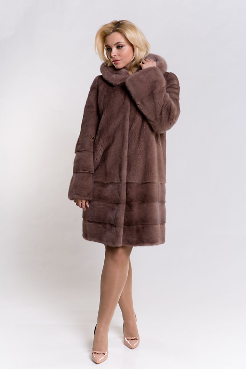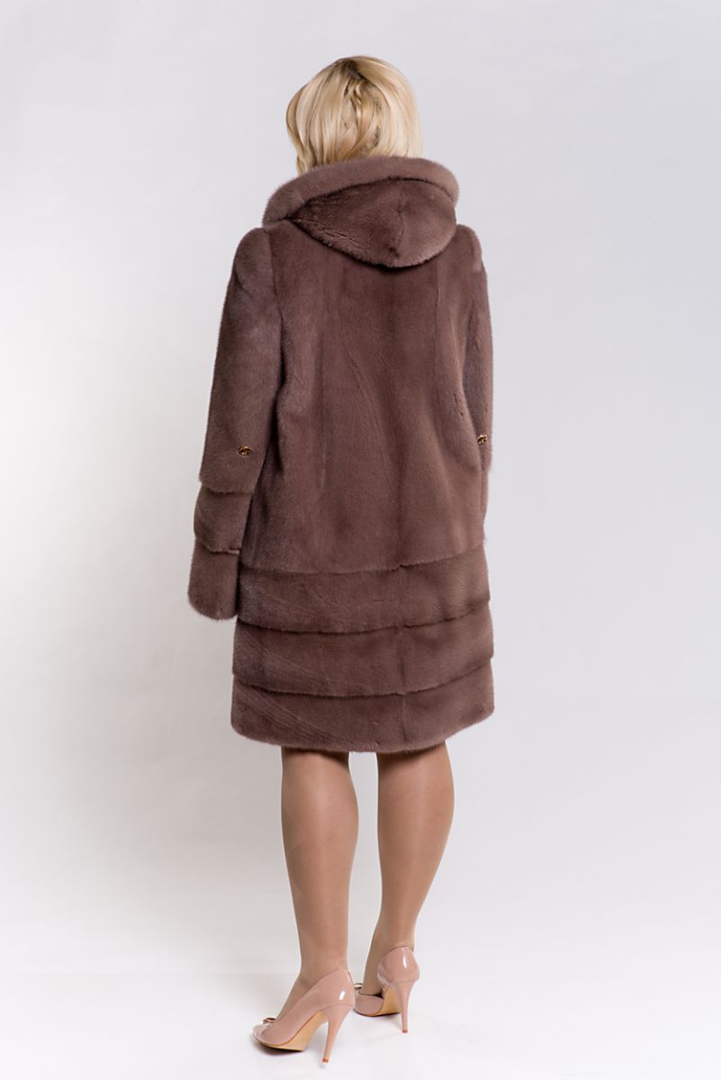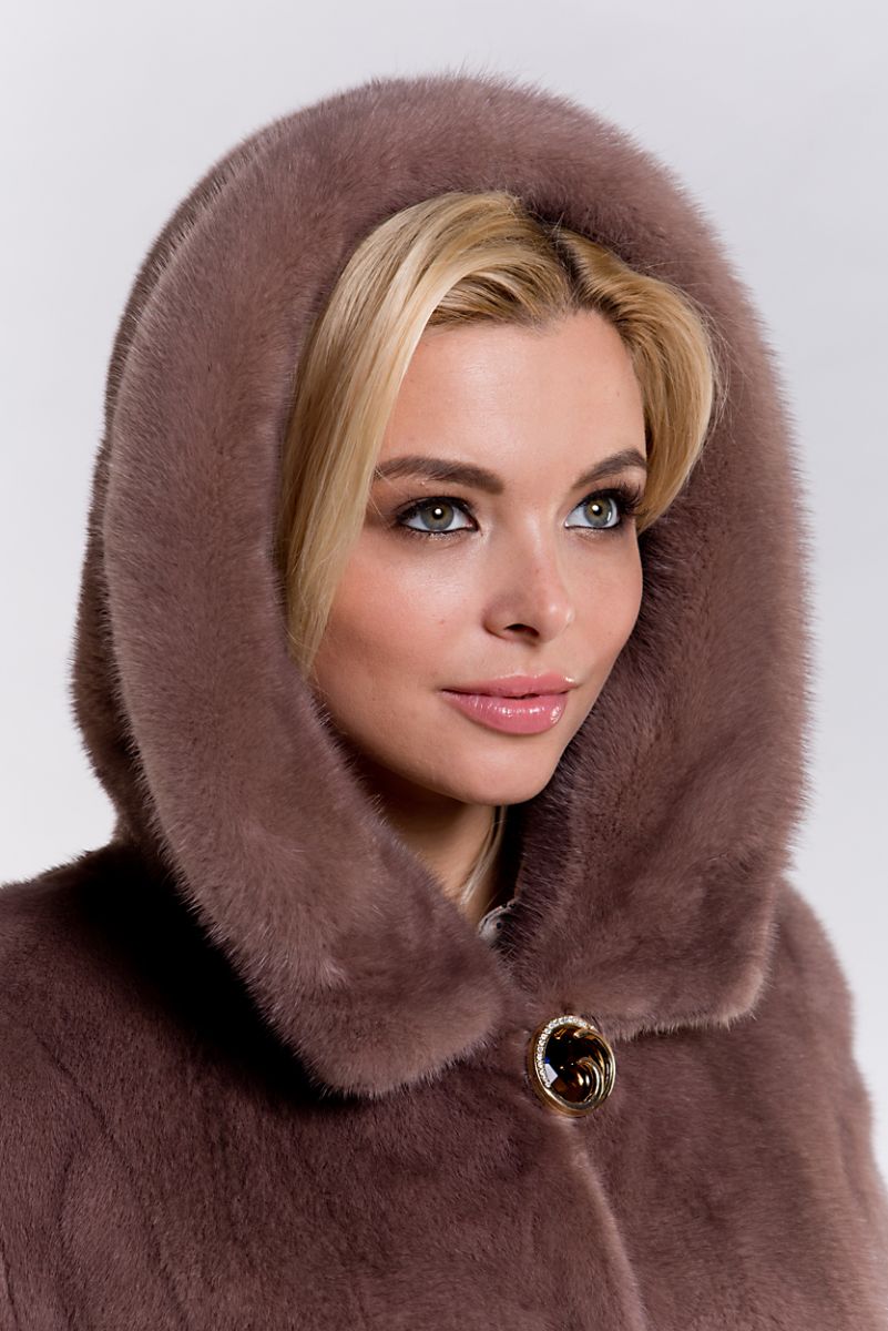 Полупальто из меха норки с капюшоном. Крой изделия комбинированный. Верх модели собран в роспуск, а низ изделия поперечная выкладка пластин. Рукава модели трансформируются в более укороченные.