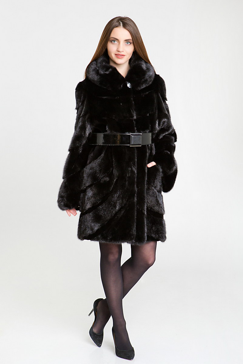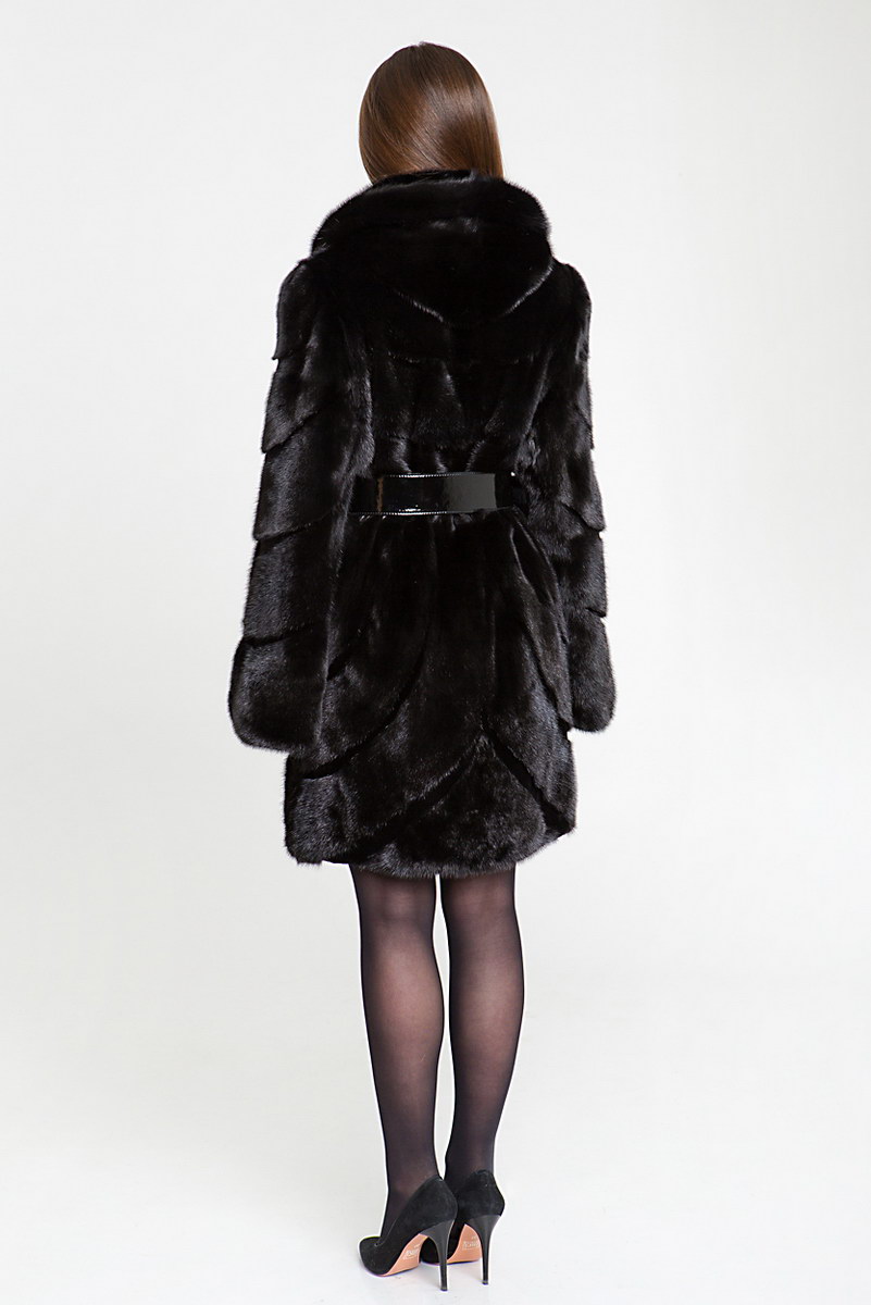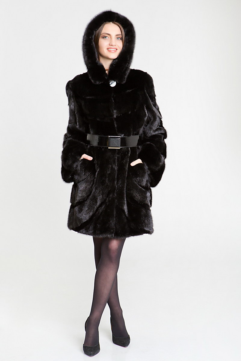 Полупальто из меха норки с капюшоном. Крой изделия в роспуск. Очень интересно смотрятся выстриженные геометрические линии на меховом полотне изделия. Хочется отметить творческий подход дизайнеров к созданию этой оригинальной модели. В такой шубке Вы будете неотразимы!